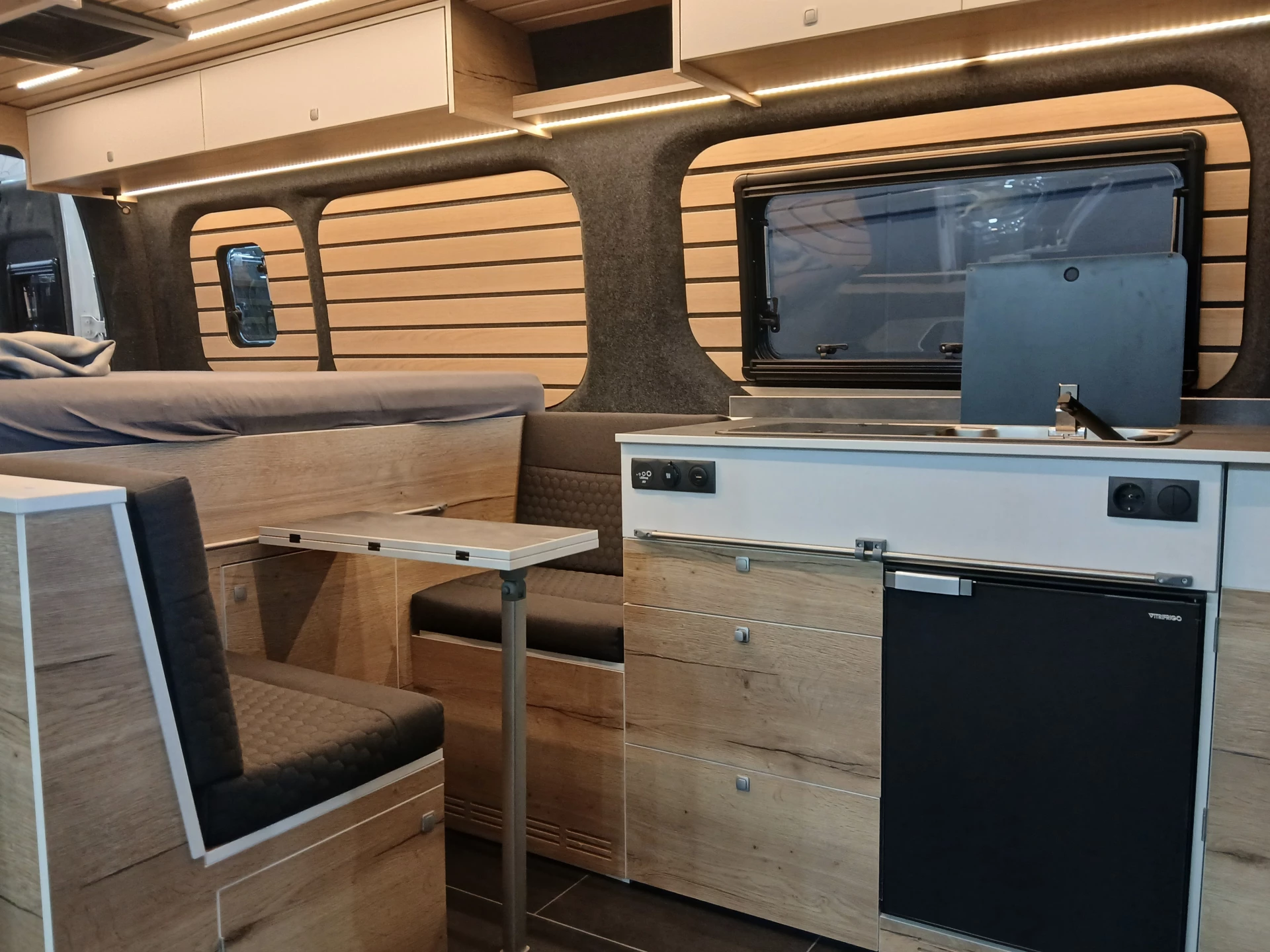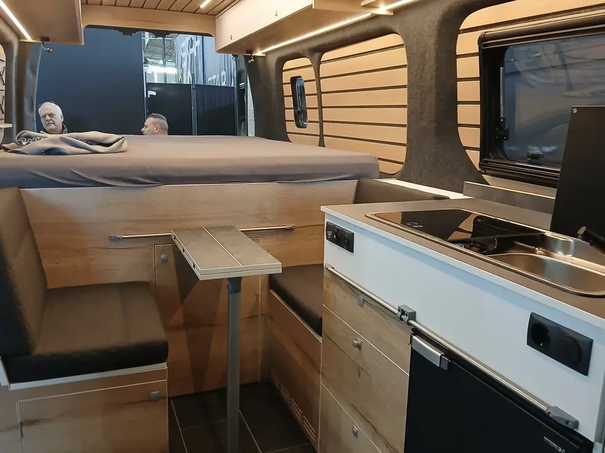 Кухонный блок оснащён двухконфорочной газовой плитой, раковиной и компрессорным холодильником. В центральной части фургона расположена обеденная зона с двумя сиденьями напротив друг друга и съёмным столом.