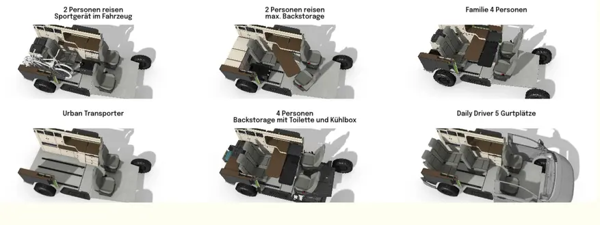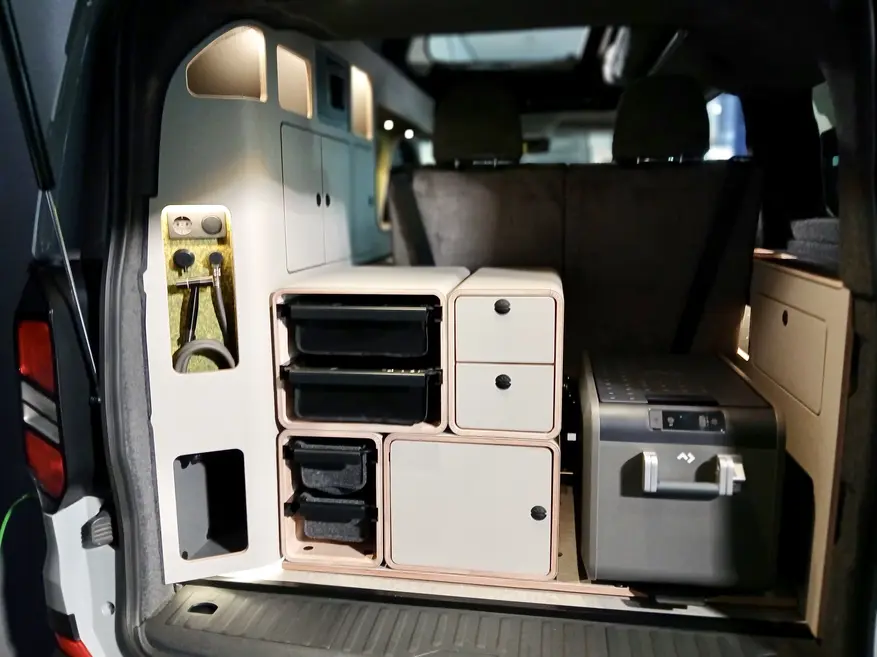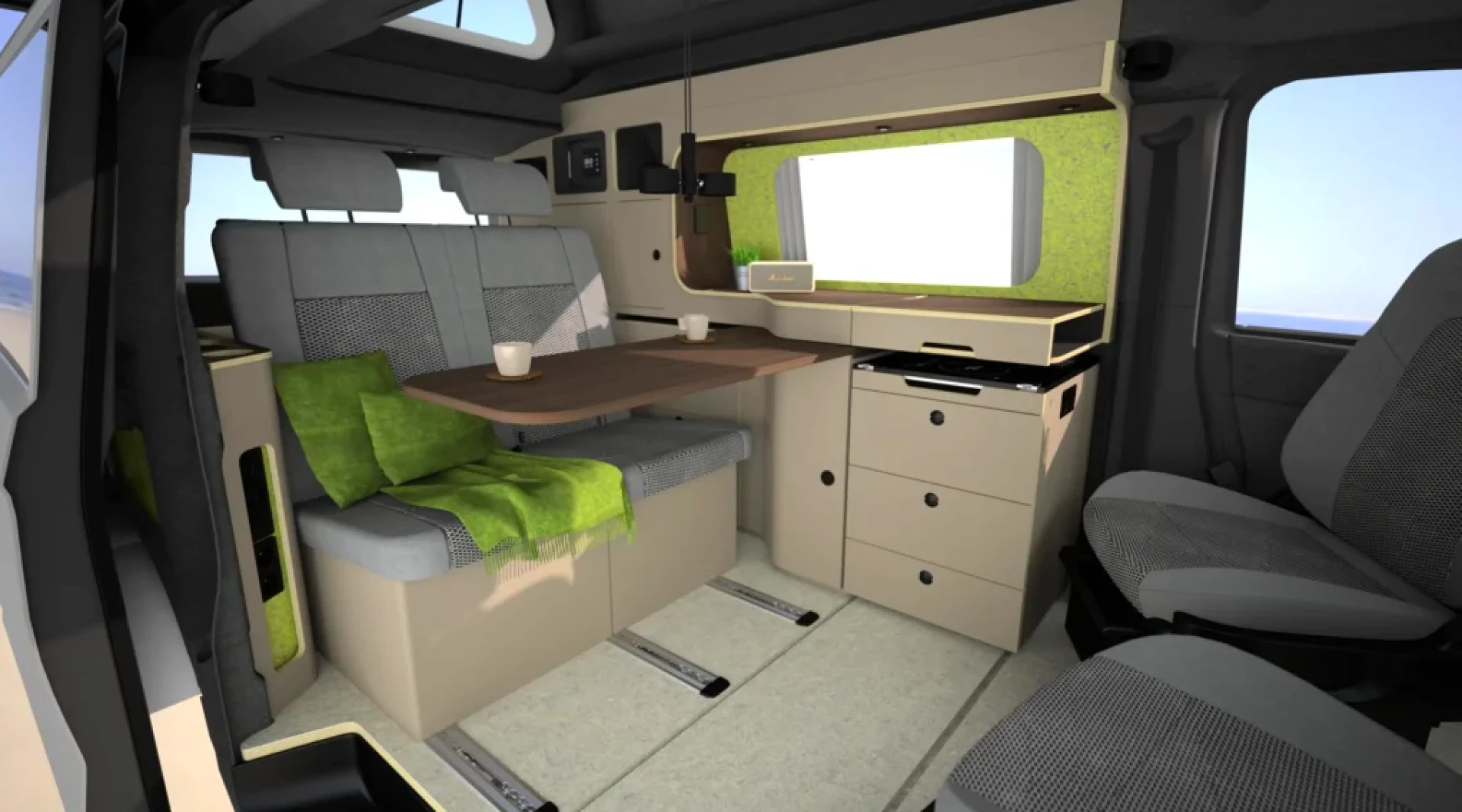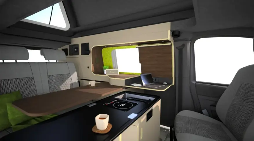 Внутри фургона на полу установлены направляющие, позволяющие перемещать кухонный блок с индукционной плитой и раковиной. Блок можно выдвинуть наружу через раздвижную дверь или зафиксировать в центре салона для использования в качестве рабочего места.