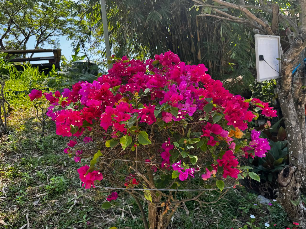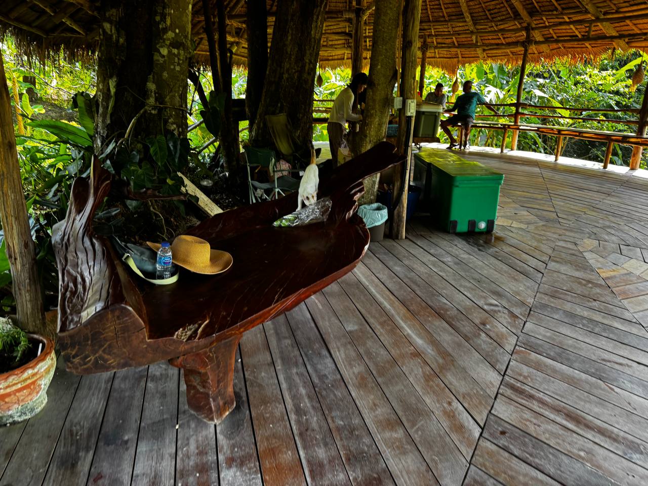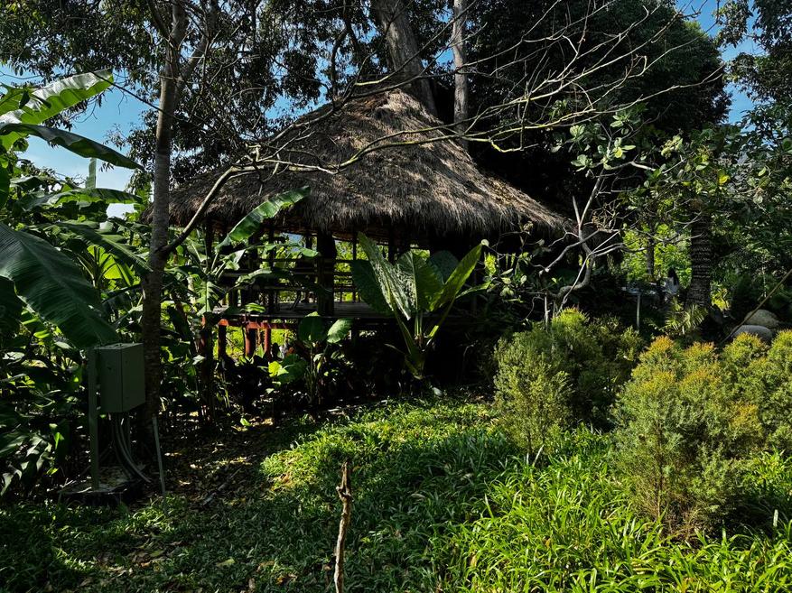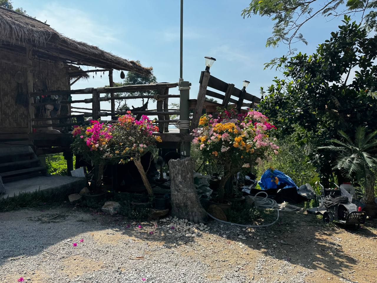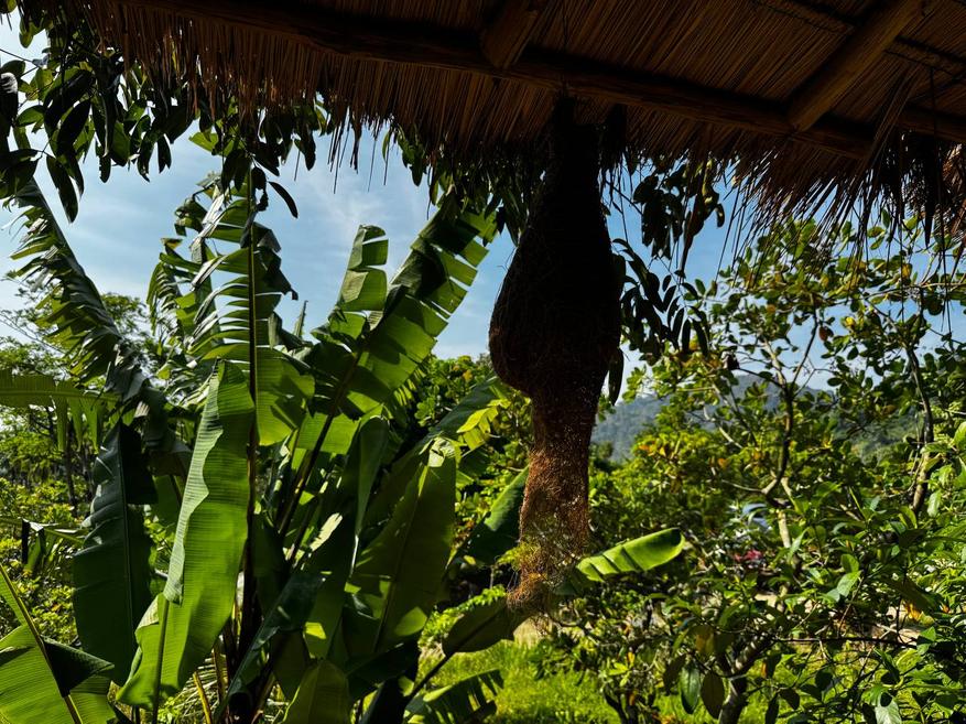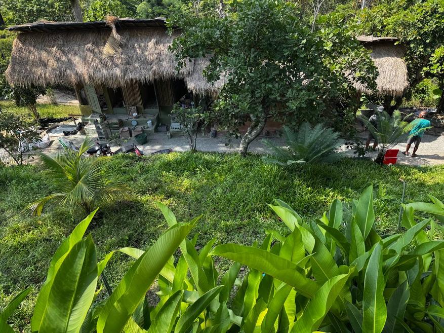 Зелени очень много. Бамбук, банановые деревья, плотные кусты, большие кроны, которые создают тень и визуально дробят пространство. Даже когда рядом находятся люди, нет ощущения толпы, всё как будто растворяется в зелени. При этом территорию не пытаются держать в стерильном виде. Где-то видна хозяйственная зона, где-то лежат инструменты, где-то сушатся вещи. Это не прячут и не маскируют. Сразу понятно, что это не парк и не декорация, а рабочее пространство, где одновременно живут люди и животные.