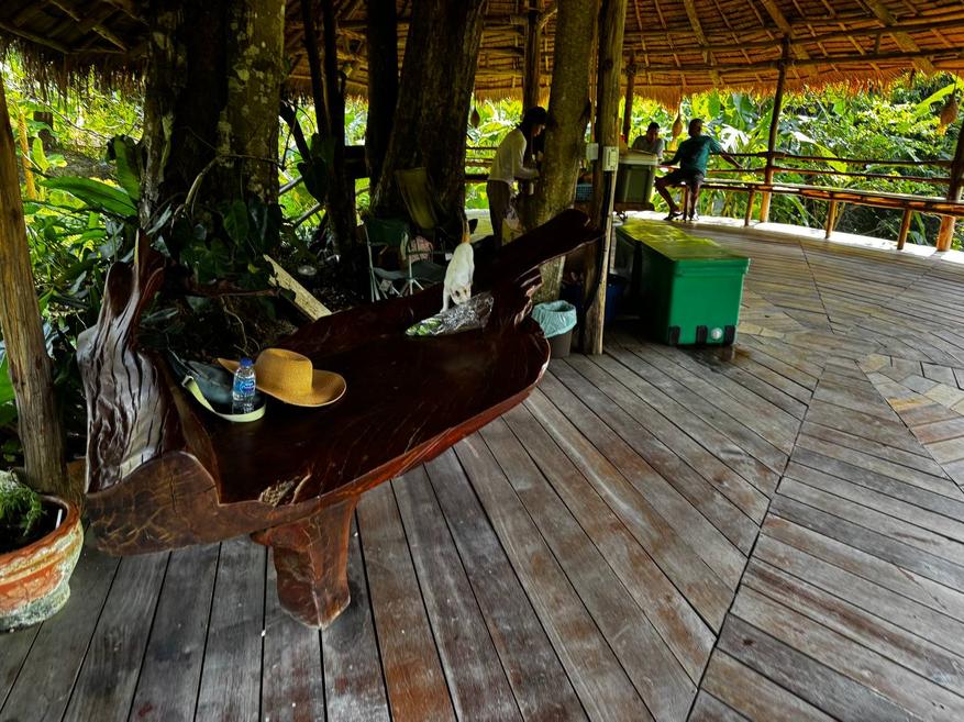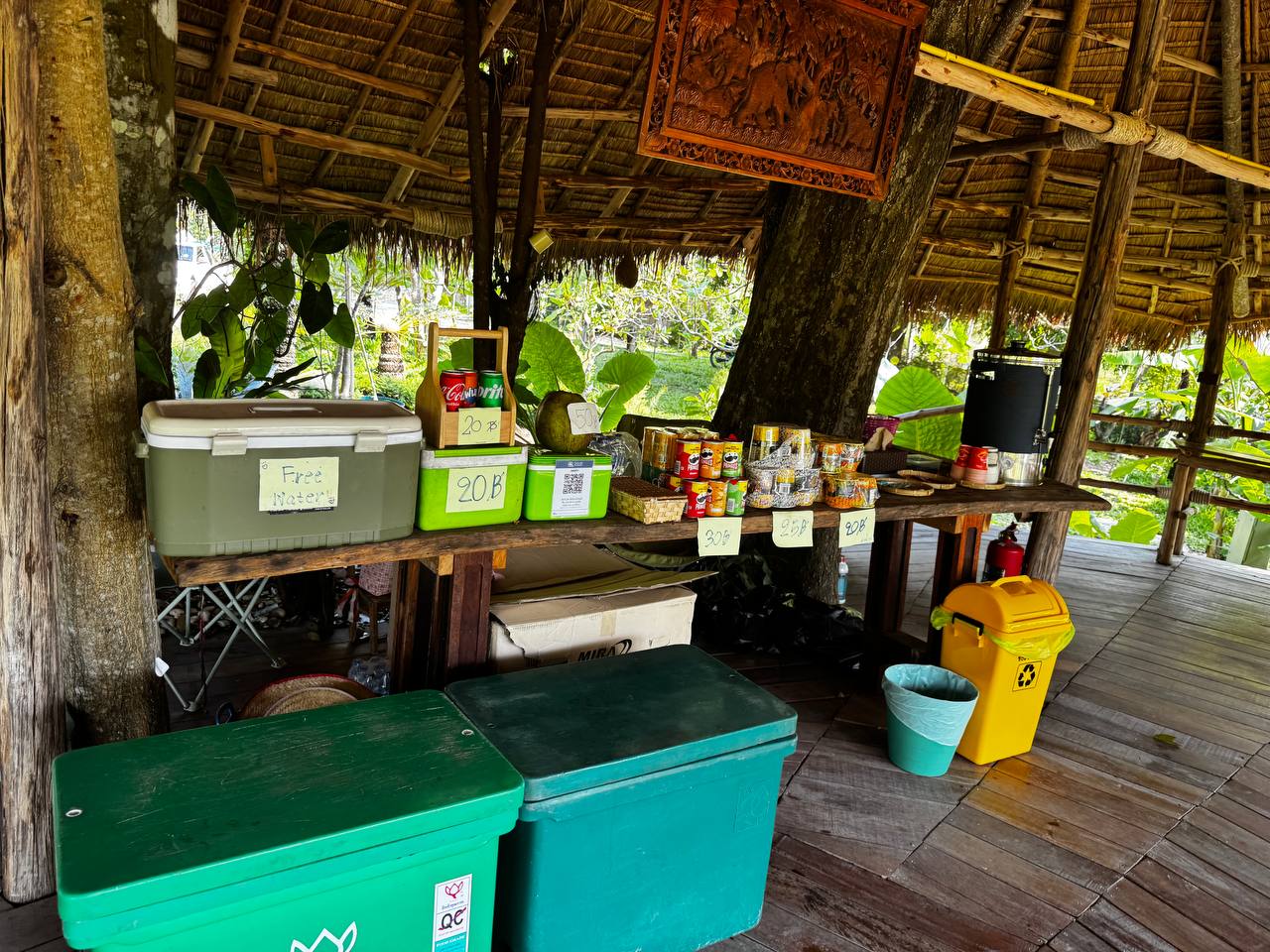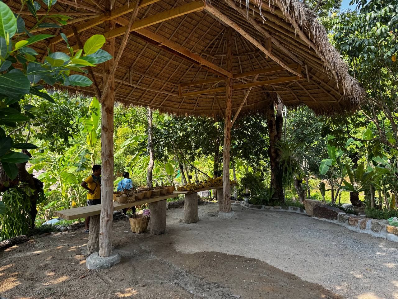 Навесы с крышами из пальмовых листьев держатся на массивных деревянных столбах, иногда буквально встроенных между живыми деревьями. В тени под ними прохладно даже в жару. Под навесами стоят лавки, столы, простая мебель без попытки стилизации. Всё утилитарно, без желания произвести впечатление.