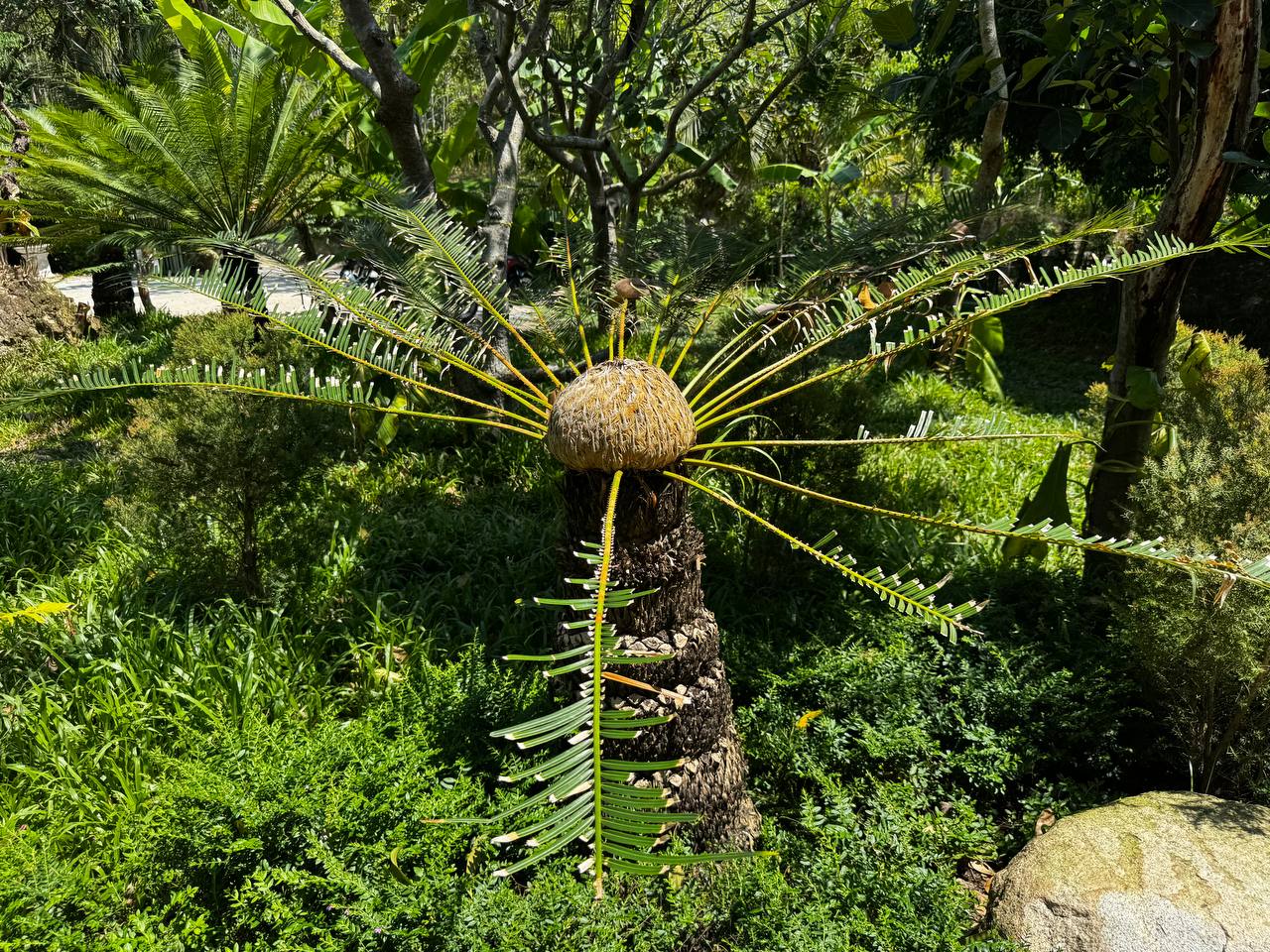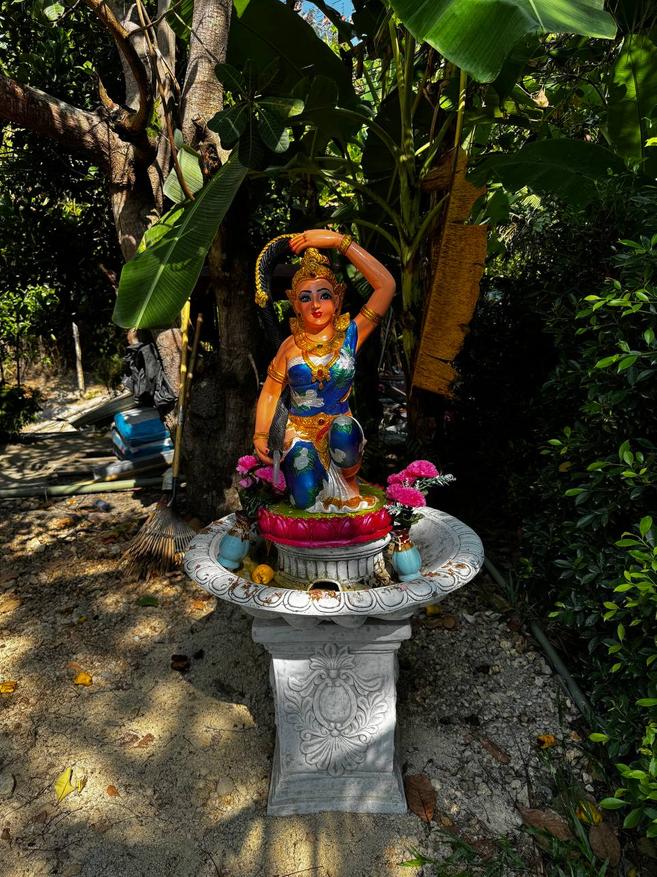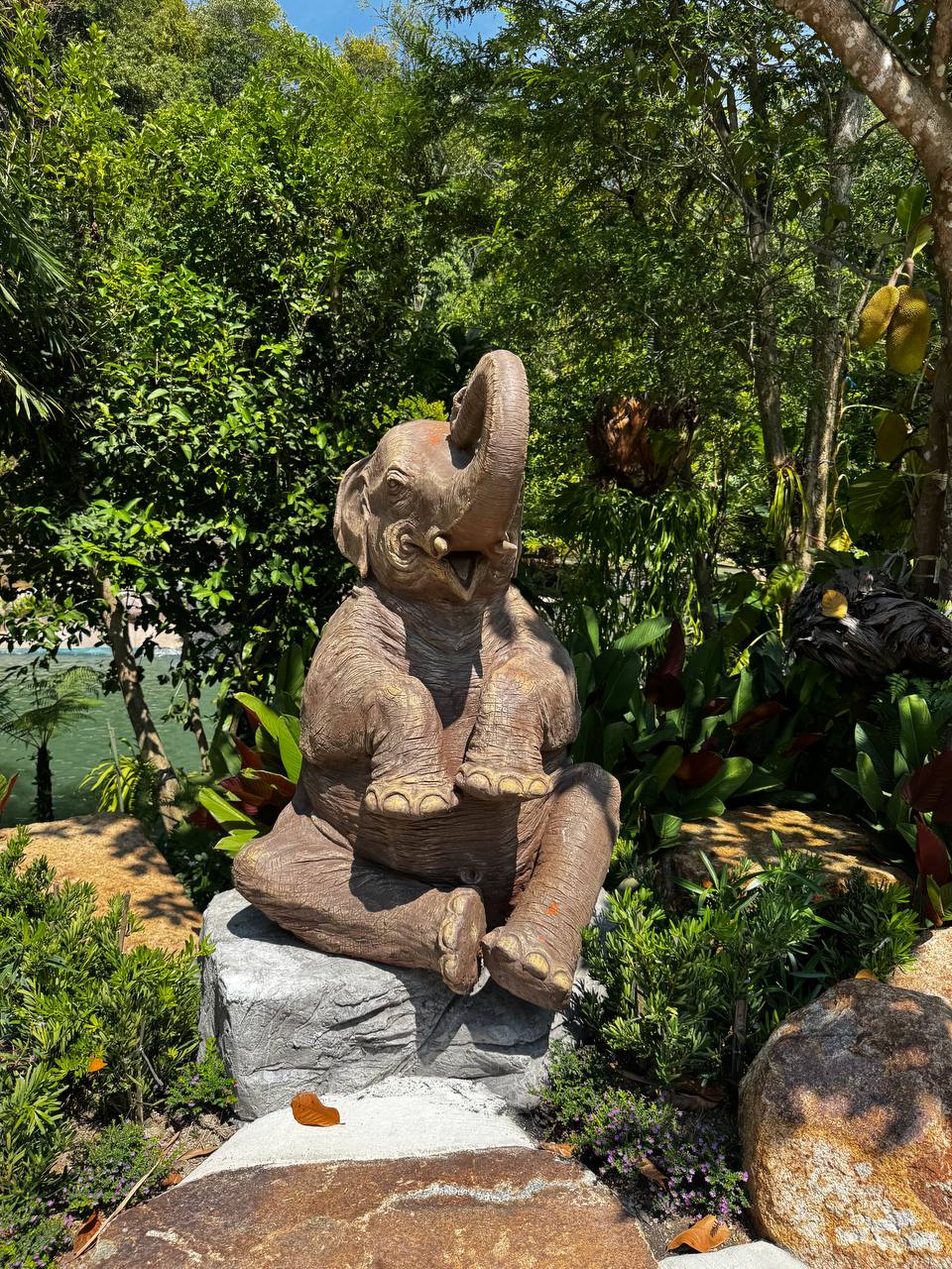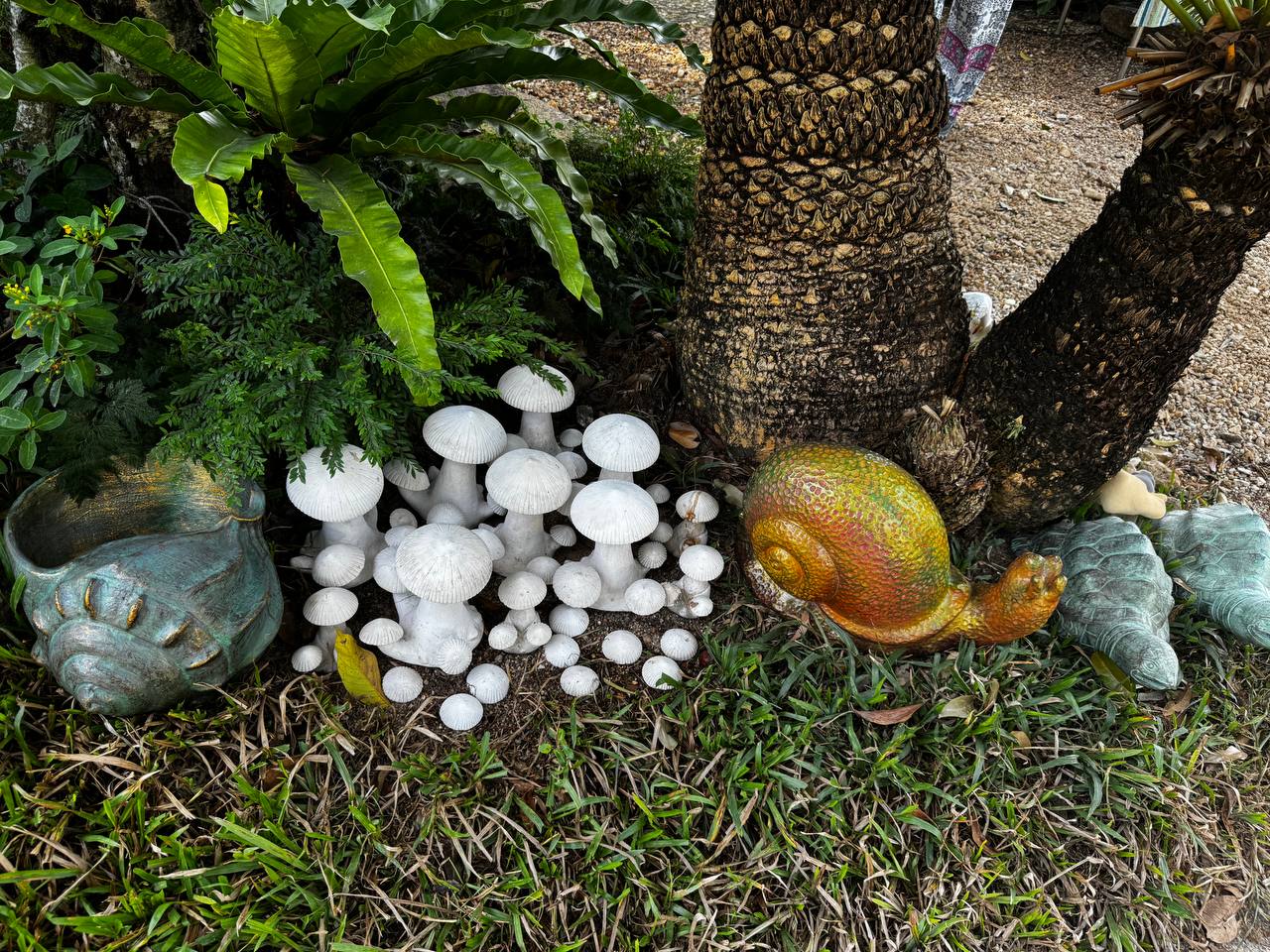 Растения здесь тоже не «для вида». Между навесами растут плодовые деревья, в том числе дуриан. Его не выделяют табличками и не превращают в объект внимания, он просто растёт. Где-то цветы, где-то завязи, где-то плотная листва. Цветов вообще много: ярких, простых, без композиционной выверенности. Они появляются там, где им удобно, а не там, где лучше смотрится в кадре. По всей территории встречаются мелкие детали. Резные деревянные лавки странной формы, фигурки улиток, грибов и животных вдоль дорожек. Они выглядят немного наивно, местами даже случайно. Но именно это создаёт ощущение живого пространства, а не продуманного дизайна.