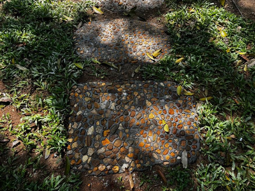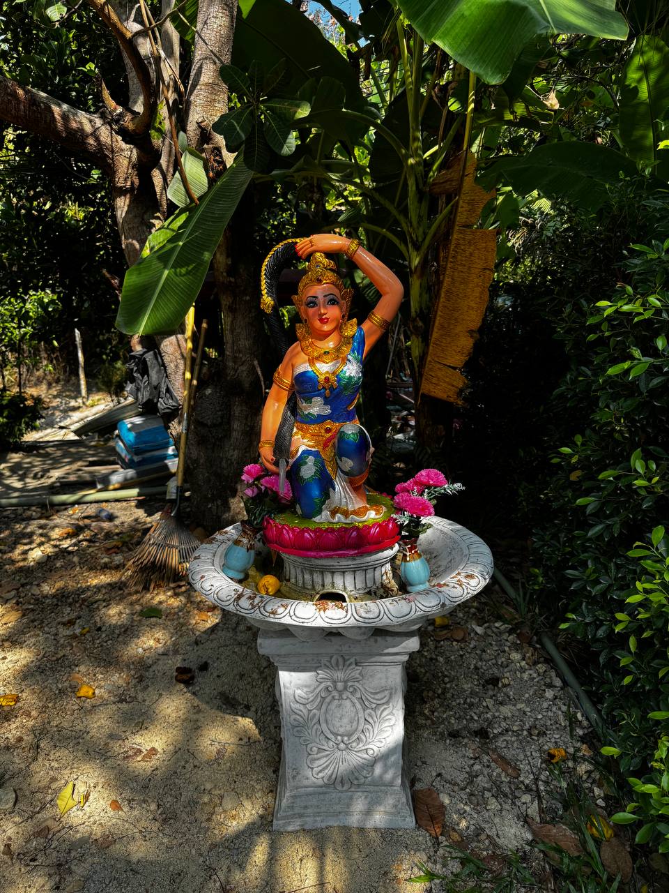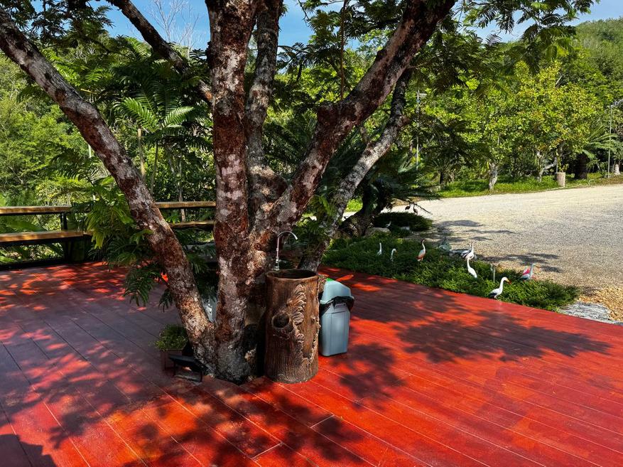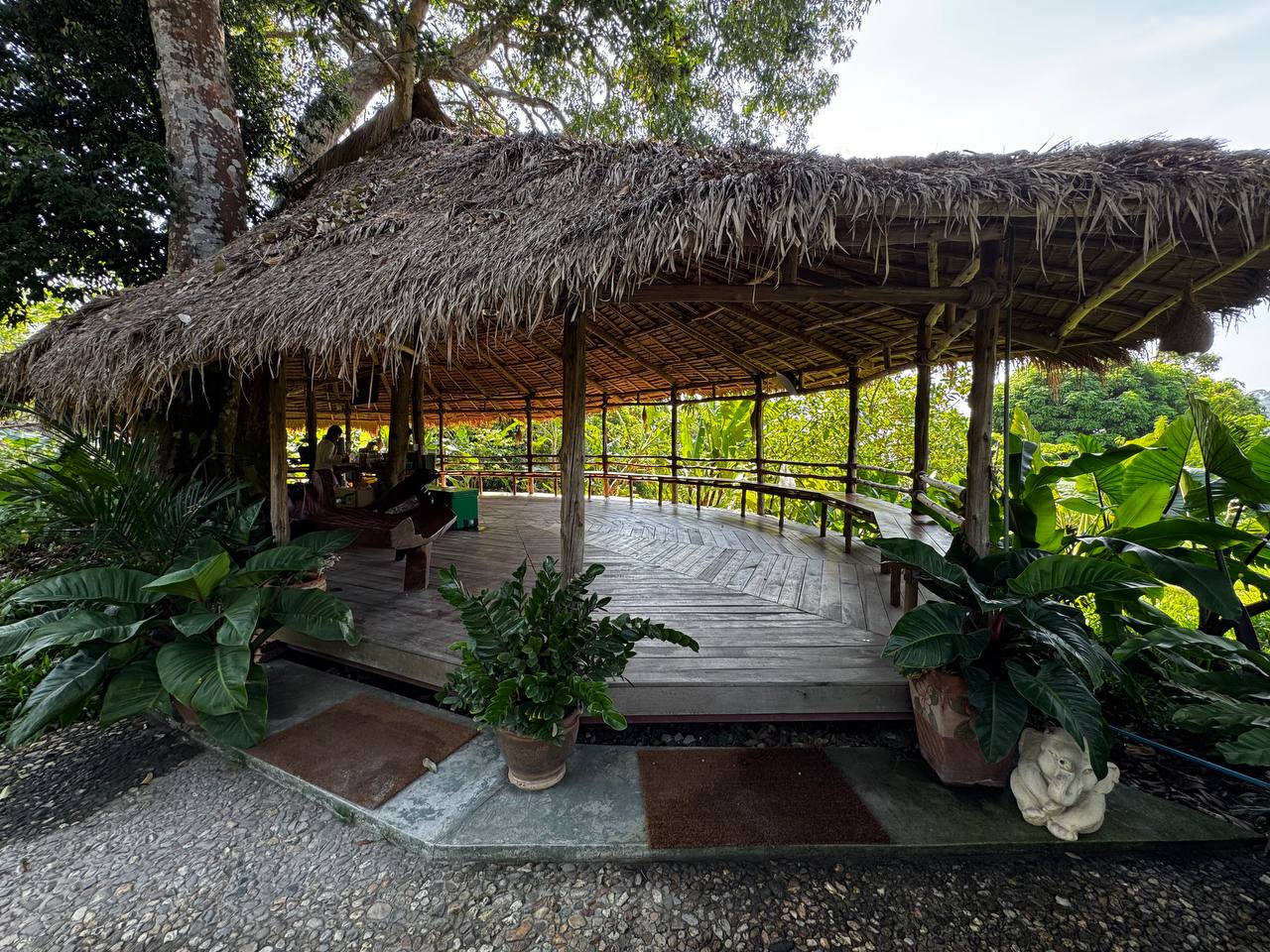 Растения здесь тоже не «для вида». Между навесами растут плодовые деревья, в том числе дуриан. Его не выделяют табличками и не превращают в объект внимания, он просто растёт. Где-то цветы, где-то завязи, где-то плотная листва. Цветов вообще много: ярких, простых, без композиционной выверенности. Они появляются там, где им удобно, а не там, где лучше смотрится в кадре. По всей территории встречаются мелкие детали. Резные деревянные лавки странной формы, фигурки улиток, грибов и животных вдоль дорожек. Они выглядят немного наивно, местами даже случайно. Но именно это создаёт ощущение живого пространства, а не продуманного дизайна.