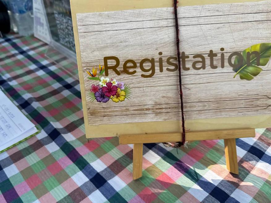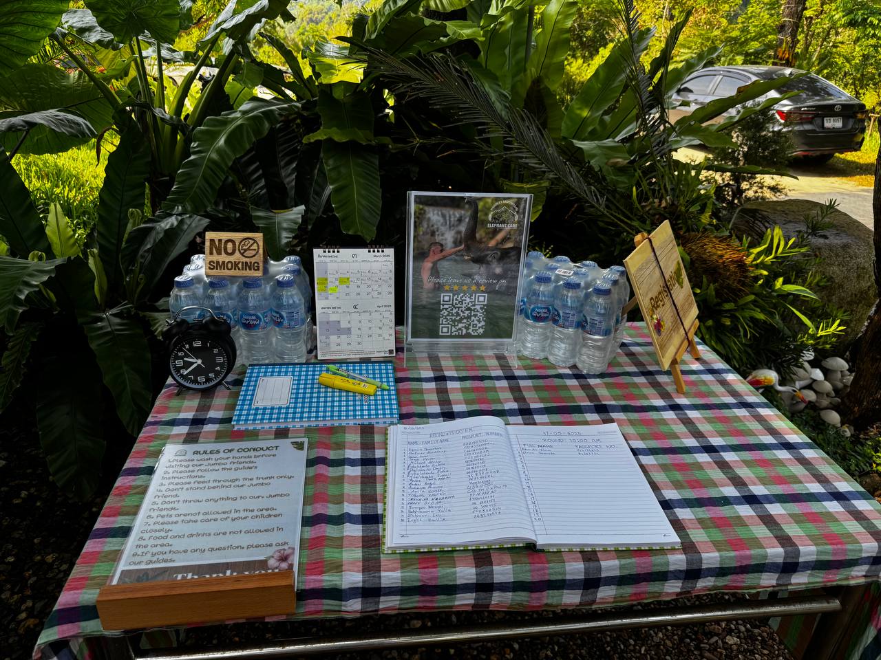 Регистрация предельно простая. Стол под навесом, клетчатая скатерть, тетрадь, ручка. Табличка «Registration», бутылки с водой. Но по факту это не запись на месте, а подтверждение брони. Записываться нужно заранее через сайт, а по приезде просто сверяют имя и отмечают, что ты на месте. Без очередей и лишних слов.