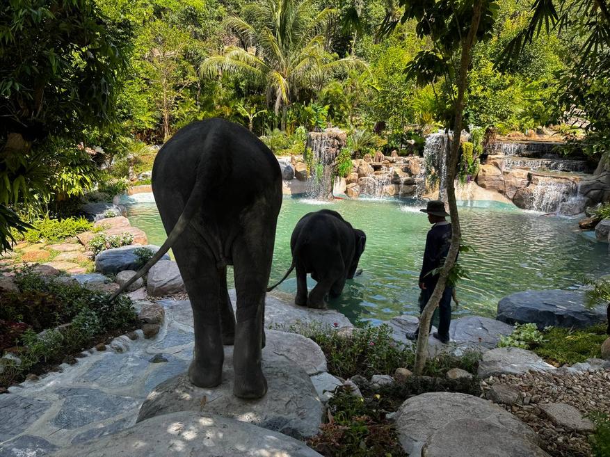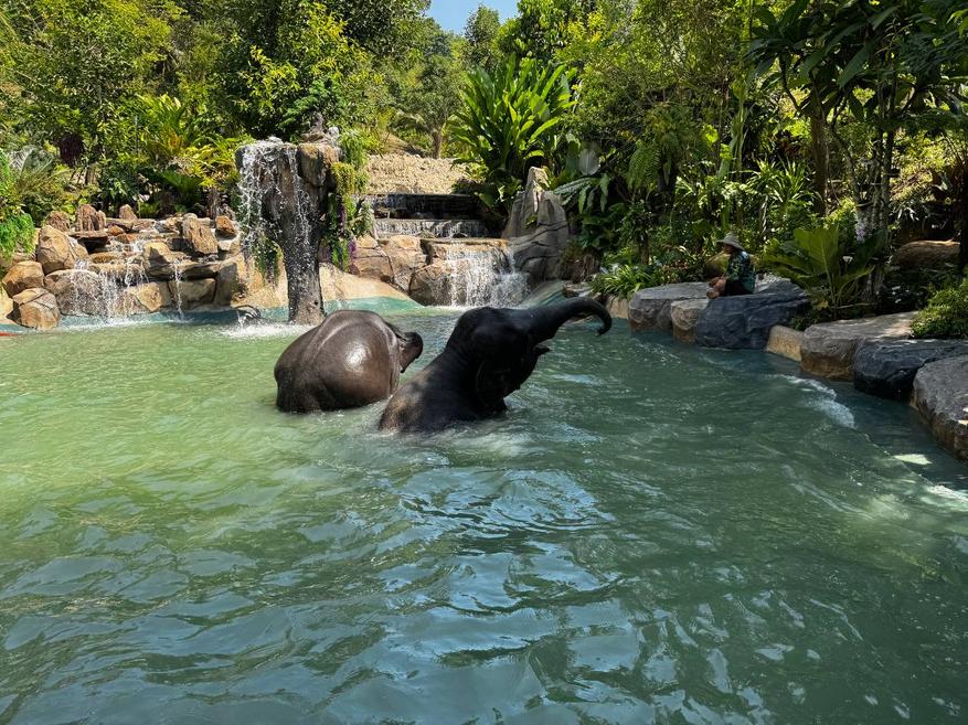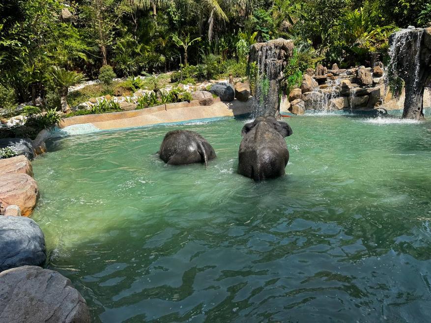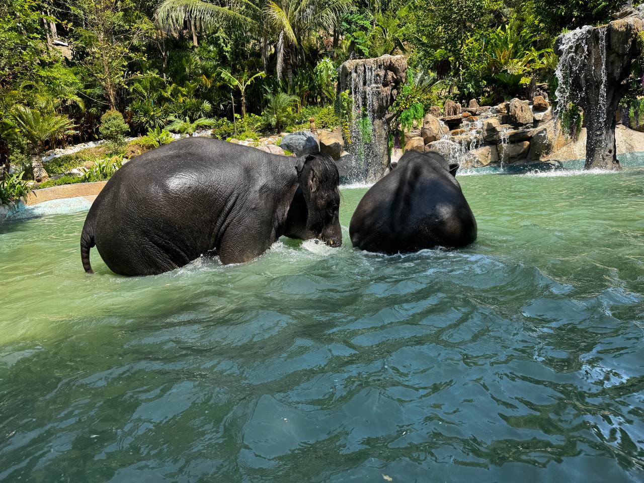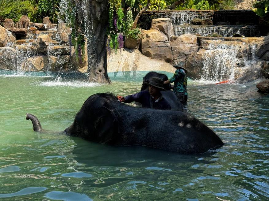 После кормления слонов ведут к месту для купания. Это большой водоём с пологими каменными берегами и водопадами. Слоны заходят в воду сами, без команды и без спешки. Сначала один, потом второй. Сотрудники остаются рядом, но не вмешиваются.