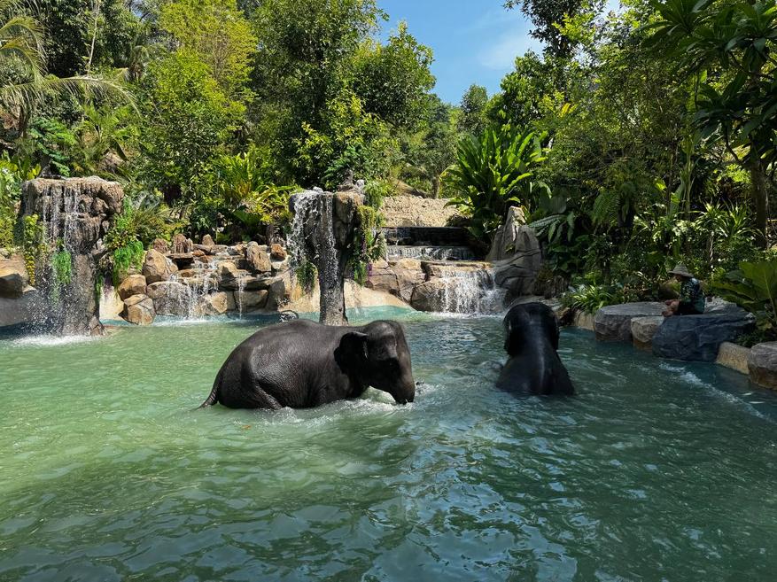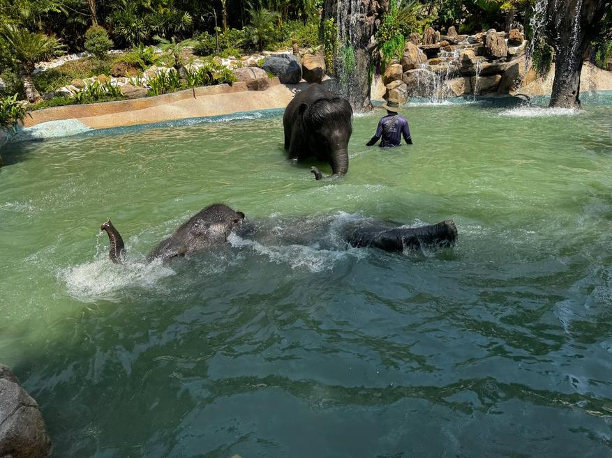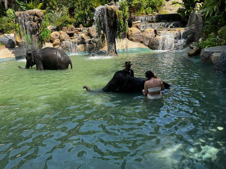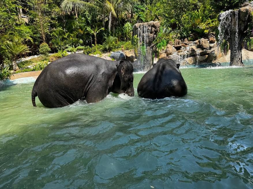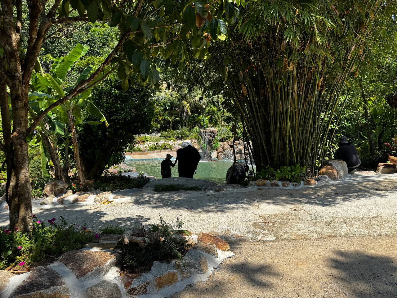 После кормления слонов ведут к месту для купания. Это большой водоём с пологими каменными берегами и водопадами. Слоны заходят в воду сами, без команды и без спешки. Сначала один, потом второй. Сотрудники остаются рядом, но не вмешиваются.
