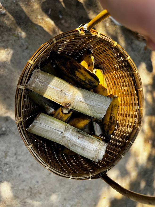 Первая встреча со слонами проходит на площадке для кормления. Это открытое пространство под навесом: столы, корзины с бананами и сахарным тростником. Выдают небольшие корзинки с угощениями и просят немного подождать. Через некоторое время вдалеке появляется движение. По дороге между зеленью выходят два слона. Рядом с ними идут сотрудники, которые просто сопровождают процесс. Слонов не подгоняют и не направляют, они идут своим темпом.