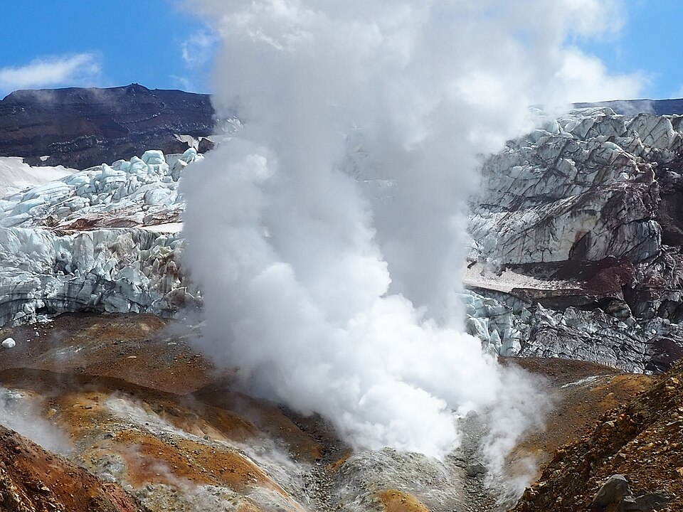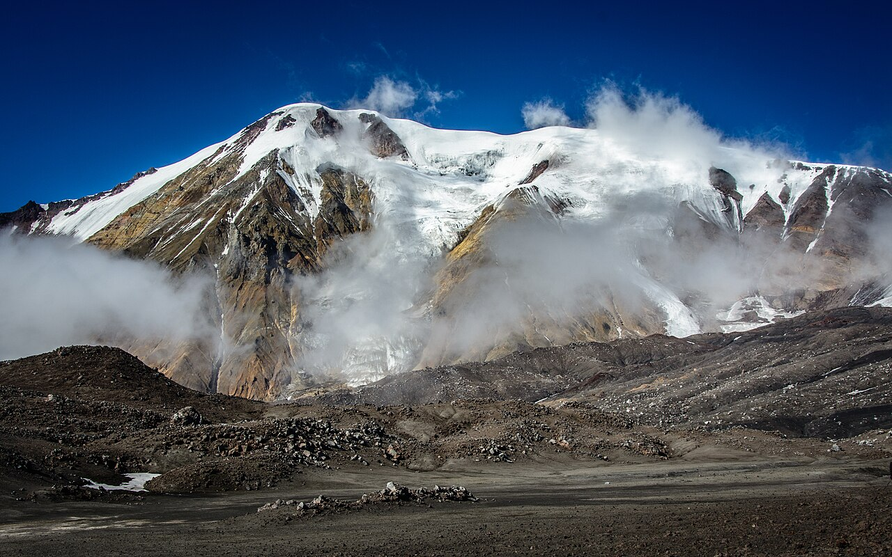 Мутновский это самый активный на Камчатке. Высота поскромнее Сопки, всего 2300 метров, зато здесь можно увидеть как раскаленные породы, так и ледники, а из трещин постоянно вырывается горячий газ. Горелый же расположен рядом, и его особенность — насыщенное ярко-голубое кислотное озеро.