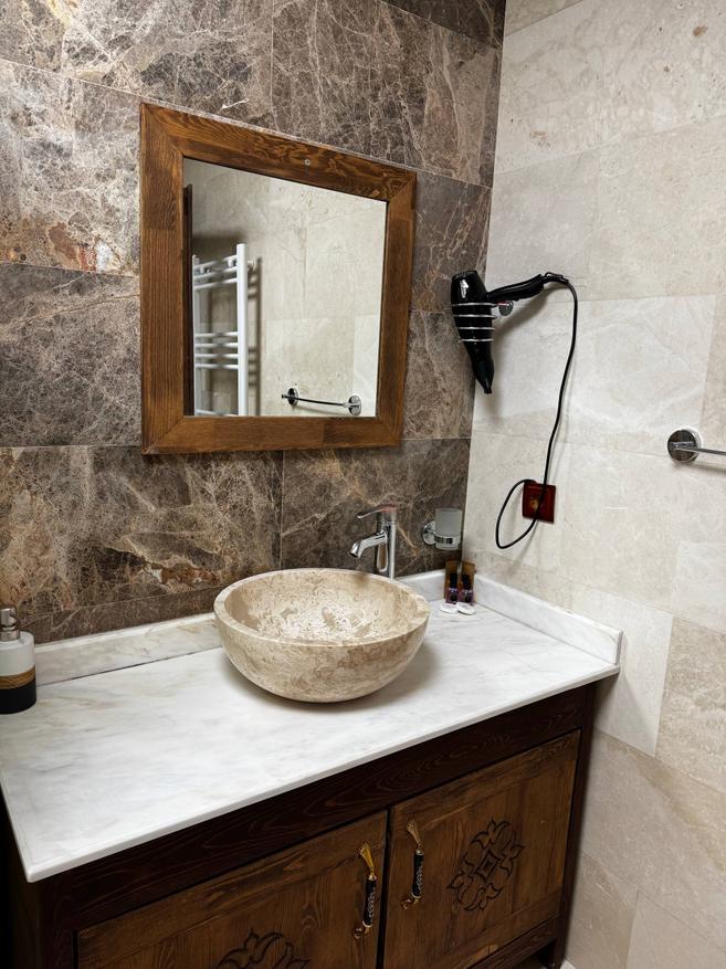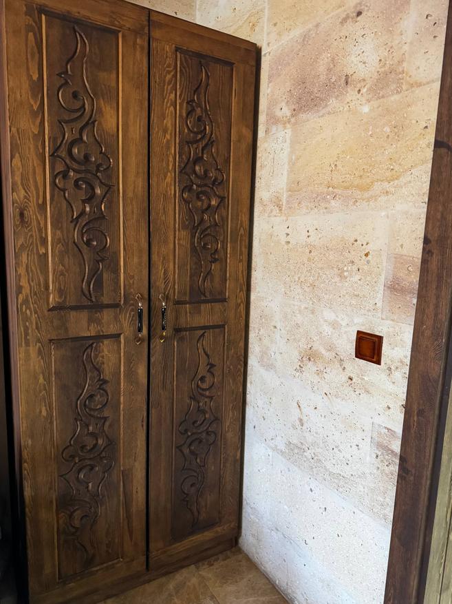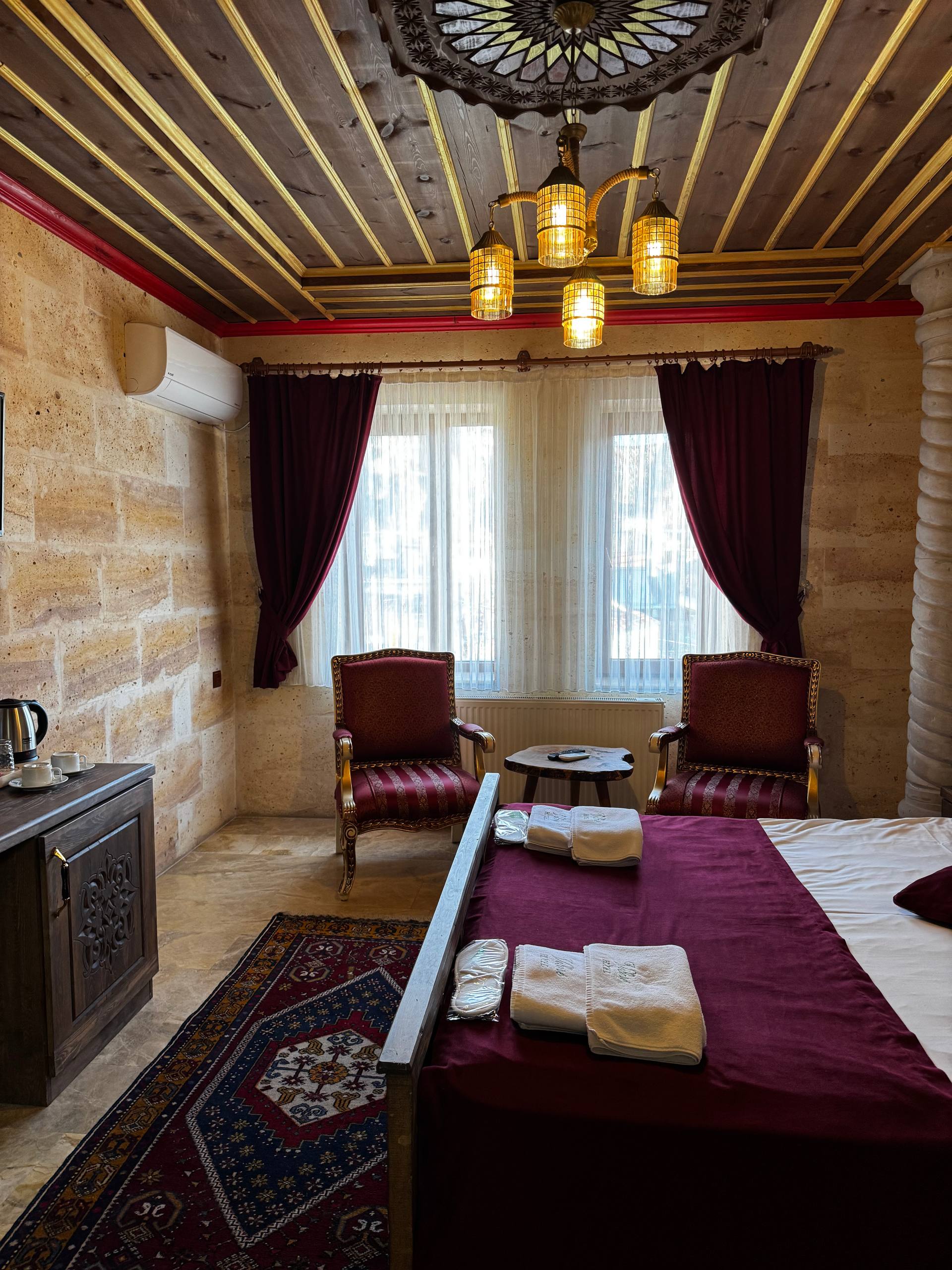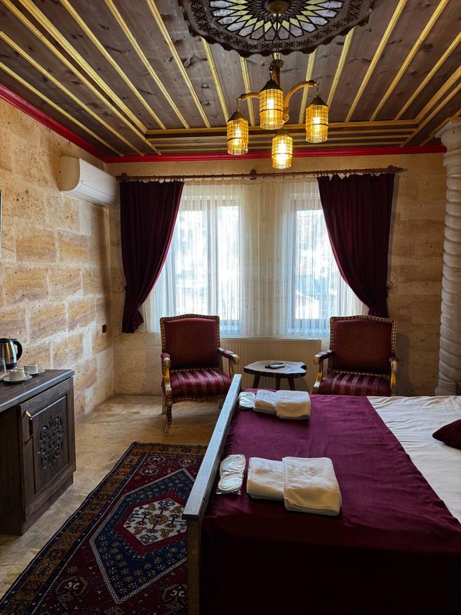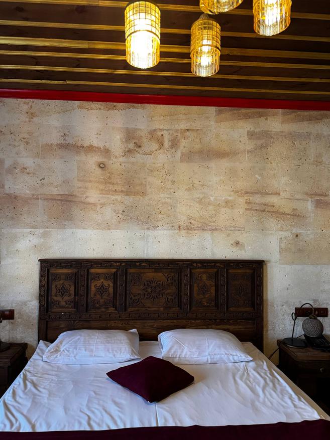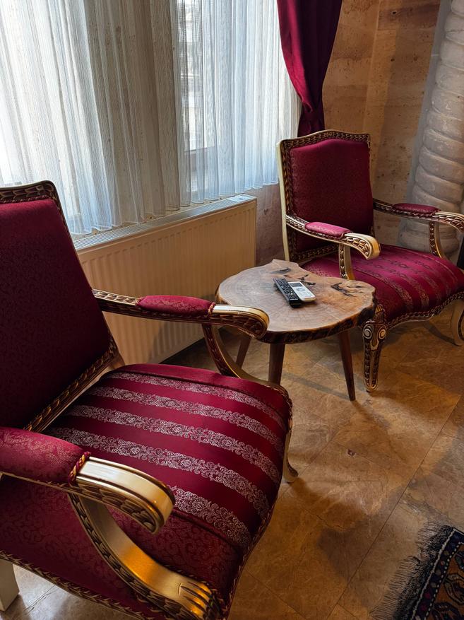 Стены из светлого камня, того самого каппадокийского. Из-за этого внутри немного прохладно по ощущениям и очень тихо. Звук будто глушится сам по себе. Даже днём в комнате стоит мягкая, спокойная тишина. Мебель деревянная, тяжёлая, с резными фасадами. Кровать массивная, с высоким изголовьем, не скрипит и не «гуляет». Матрас средней жёсткости из тех, на которых просто засыпаешь и не ворочаешься полночи. У окна два кресла и маленький столик. Не для галочки, а действительно удобный уголок: можно сесть вечером с чаем или утром просто посмотреть в окно. Такие простые мелочи почему-то запоминаются больше всего. Полотенца и тапочки аккуратно сложены, всё чистое, без ощущения «уставшего» текстиля. Есть кондиционер и отопление, так что летом не душно, а в прохладные месяцы каменные стены не становятся проблемой.