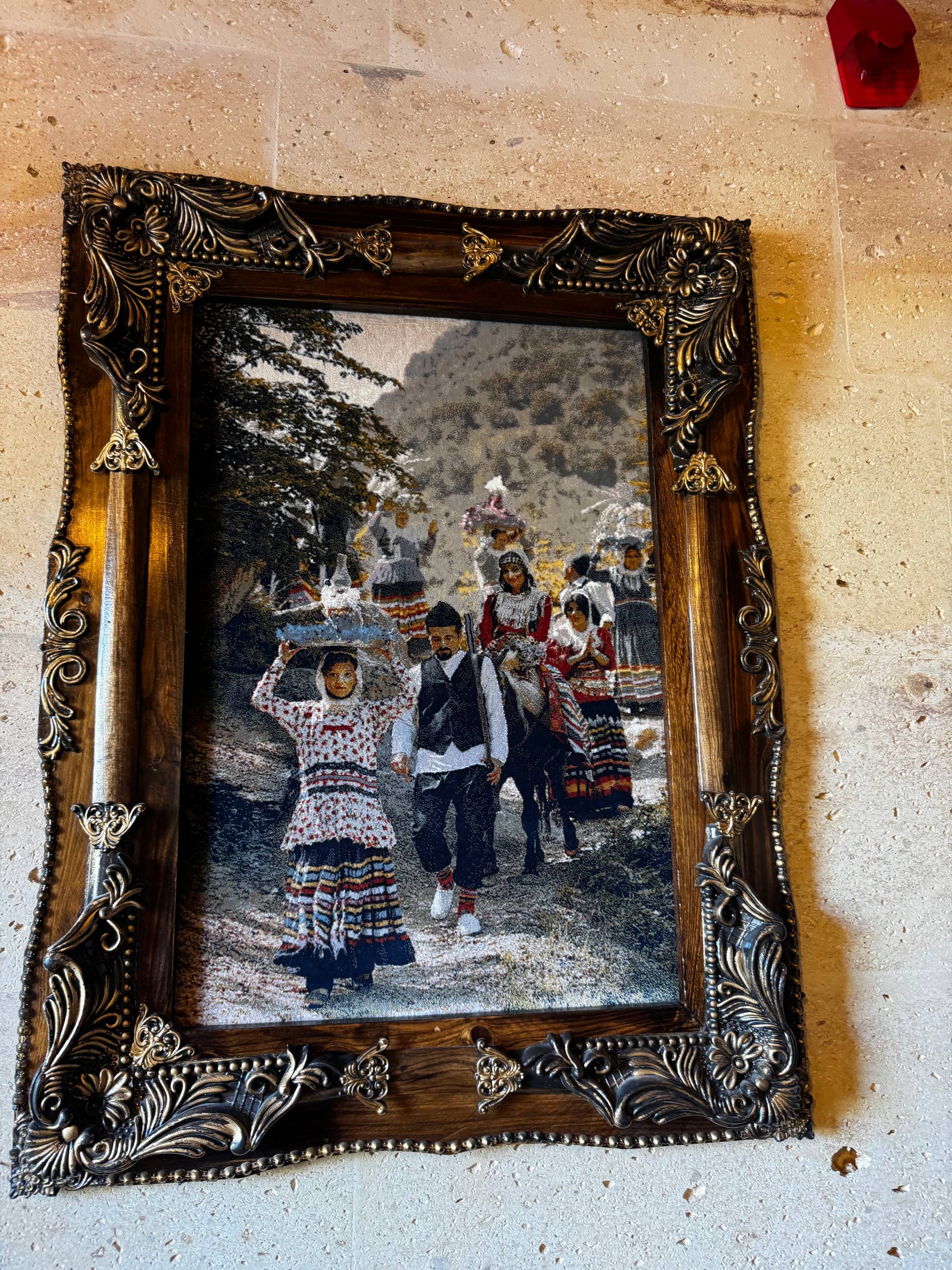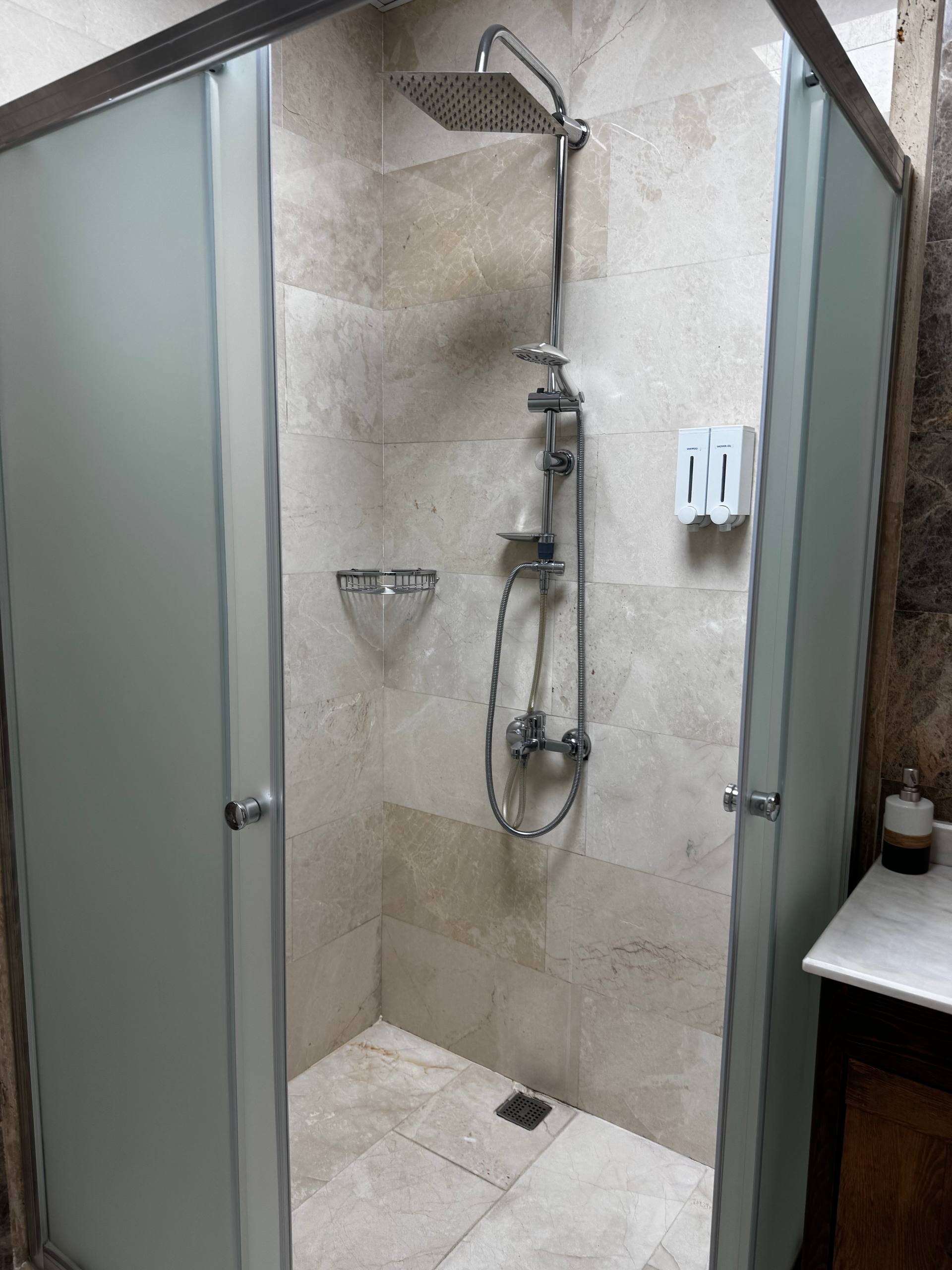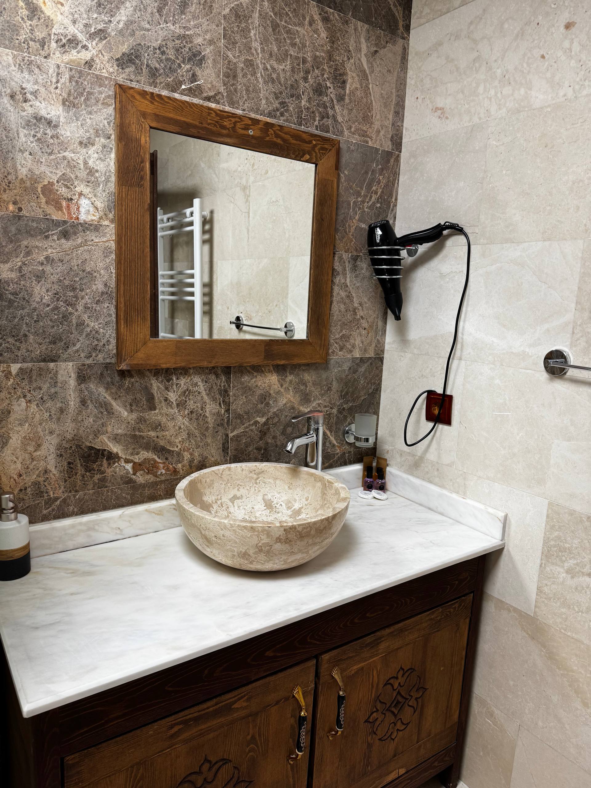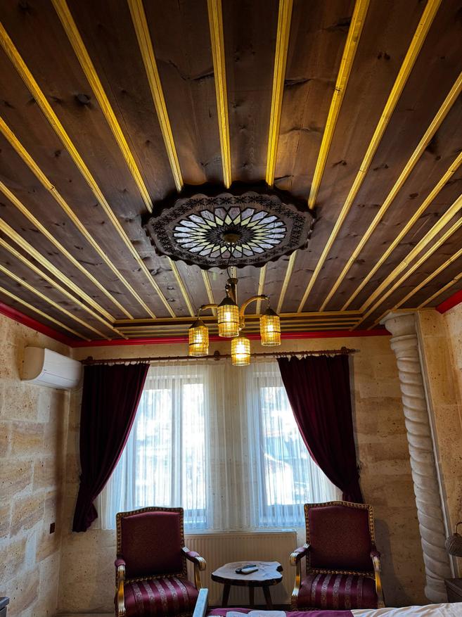 Стены из светлого камня, того самого каппадокийского. Из-за этого внутри немного прохладно по ощущениям и очень тихо. Звук будто глушится сам по себе. Даже днём в комнате стоит мягкая, спокойная тишина. Мебель деревянная, тяжёлая, с резными фасадами. Кровать массивная, с высоким изголовьем, не скрипит и не «гуляет». Матрас средней жёсткости из тех, на которых просто засыпаешь и не ворочаешься полночи. У окна два кресла и маленький столик. Не для галочки, а действительно удобный уголок: можно сесть вечером с чаем или утром просто посмотреть в окно. Такие простые мелочи почему-то запоминаются больше всего. Полотенца и тапочки аккуратно сложены, всё чистое, без ощущения «уставшего» текстиля. Есть кондиционер и отопление, так что летом не душно, а в прохладные месяцы каменные стены не становятся проблемой.