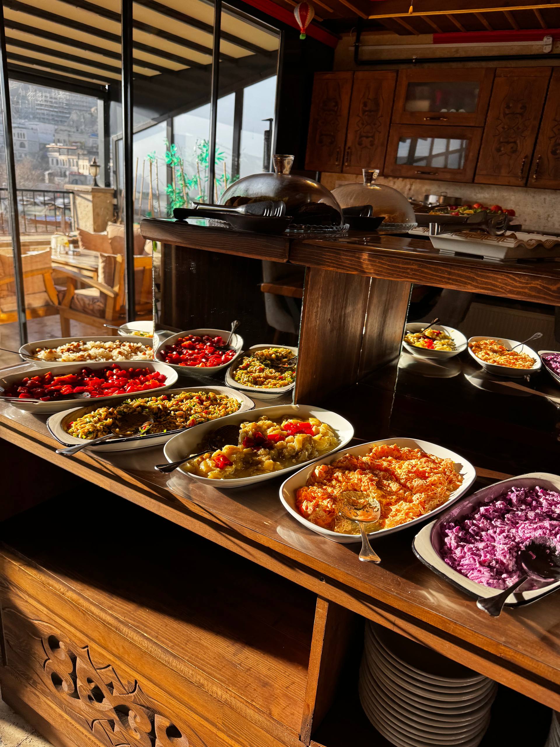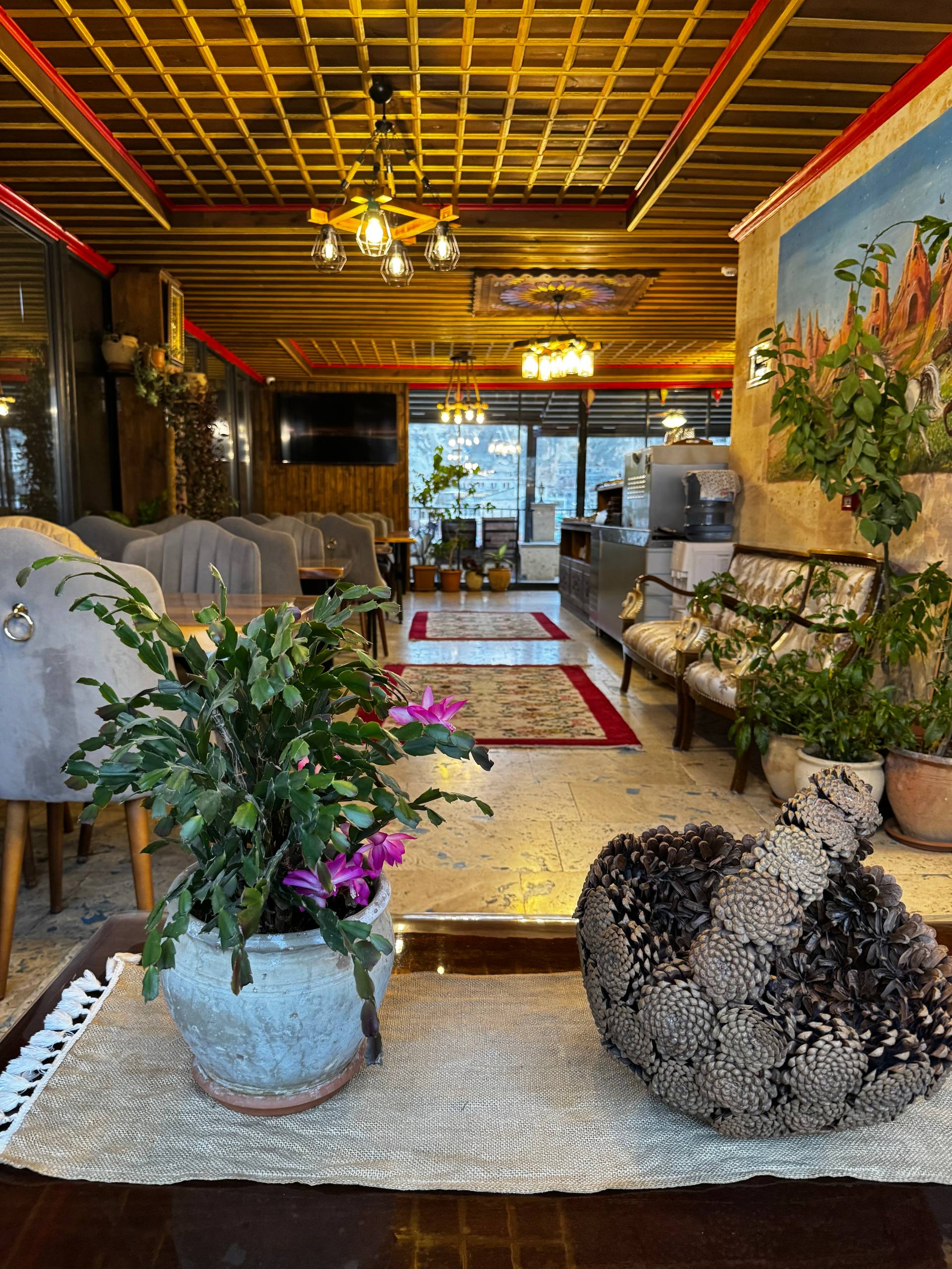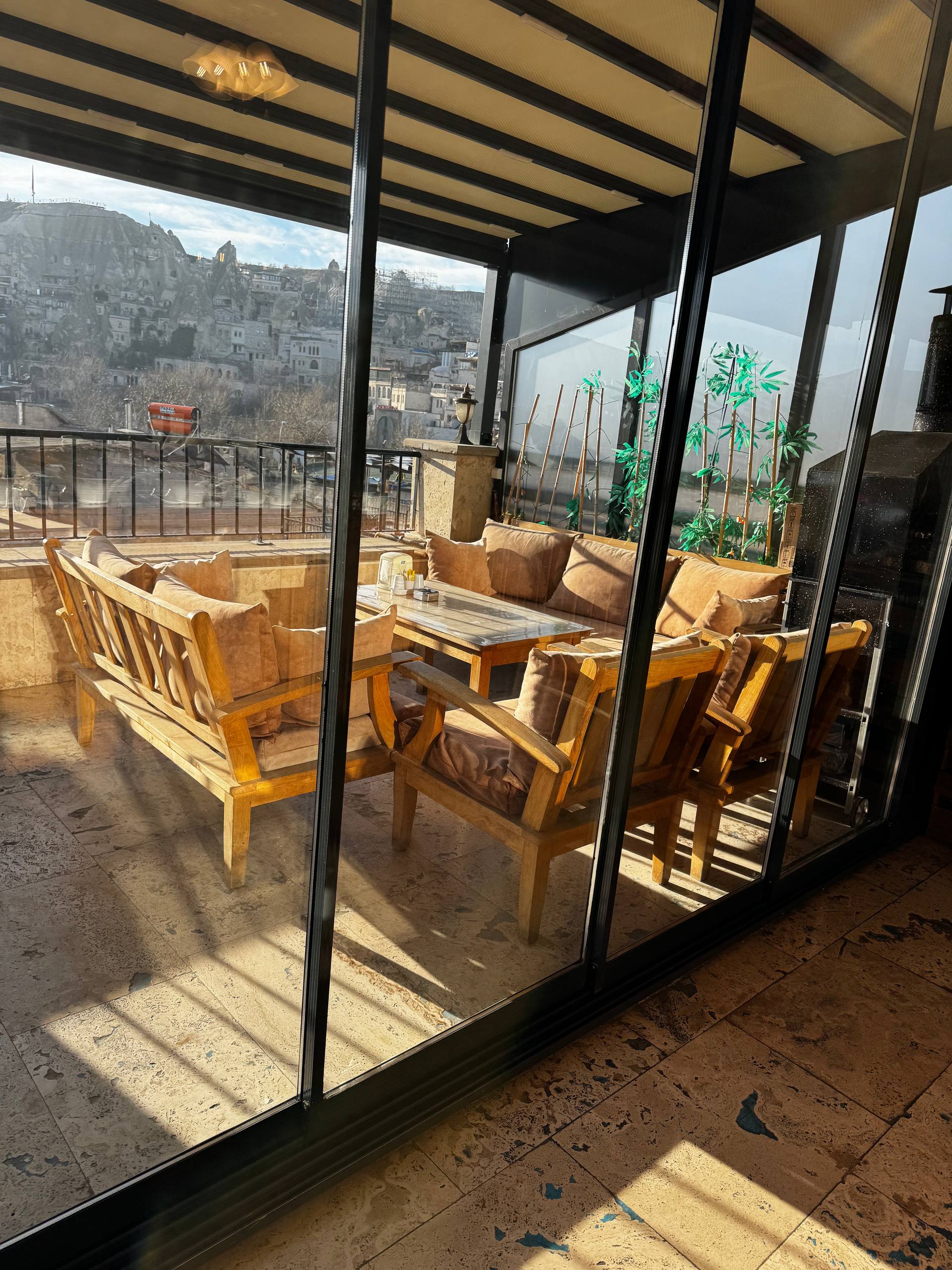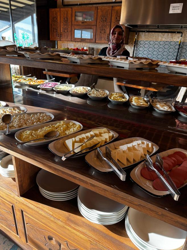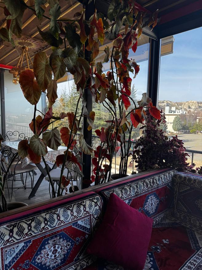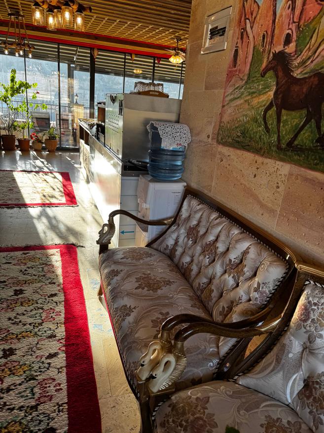 Интерьер тёплый, деревянный: резные шкафы, тяжёлые столешницы, мягкий свет от ламп под потолком. Всё немного по-домашнему. Отдельно стоит диван в турецком стиле с ковровыми узорами и подушками. Туда удобно просто пересесть с чашкой кофе, вытянуть ноги, посидеть в тишине. Такой уголок «просто для жизни», не только для еды. Есть лоджия и терасса на крыше, с которой открыватся виды на крыши Гёреме, скалы, те самые каменные холмы.