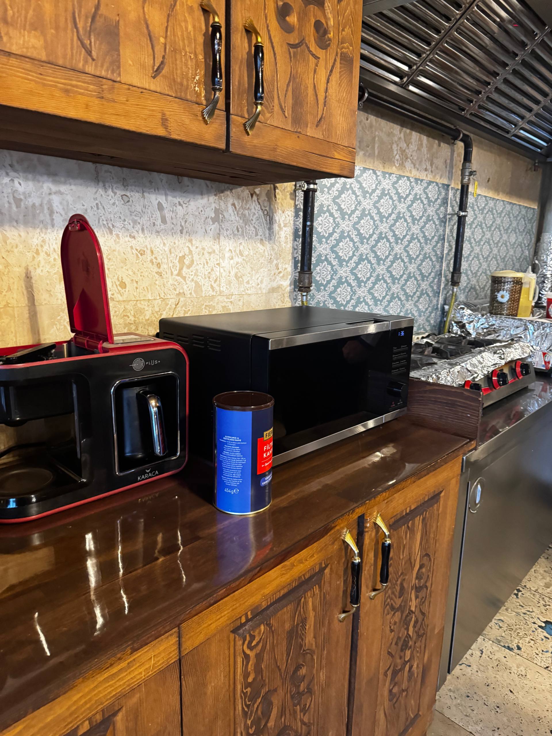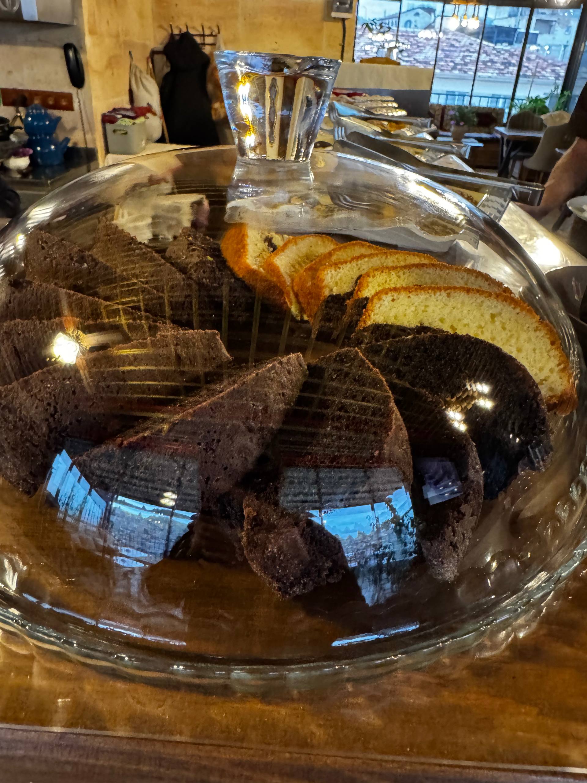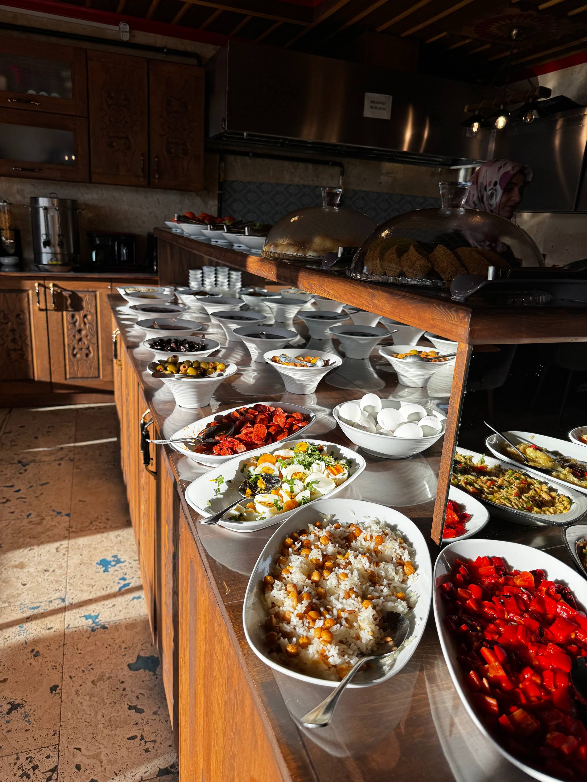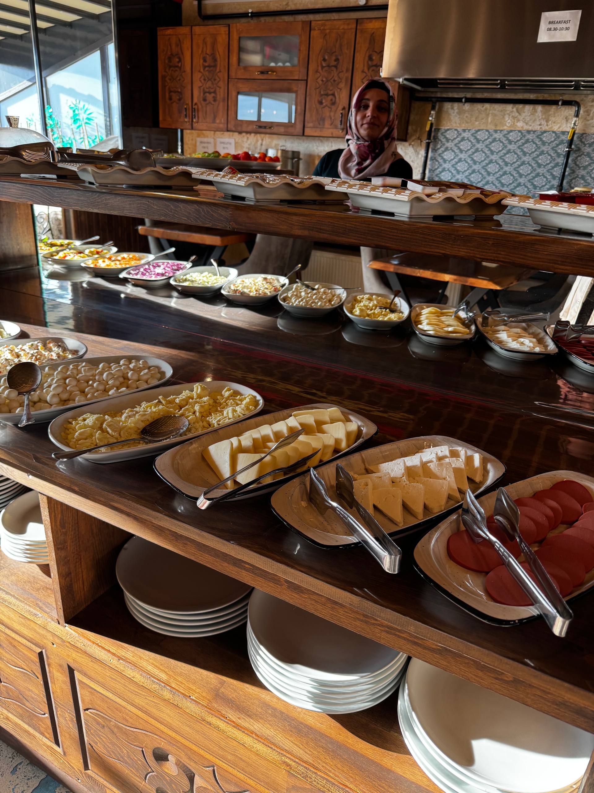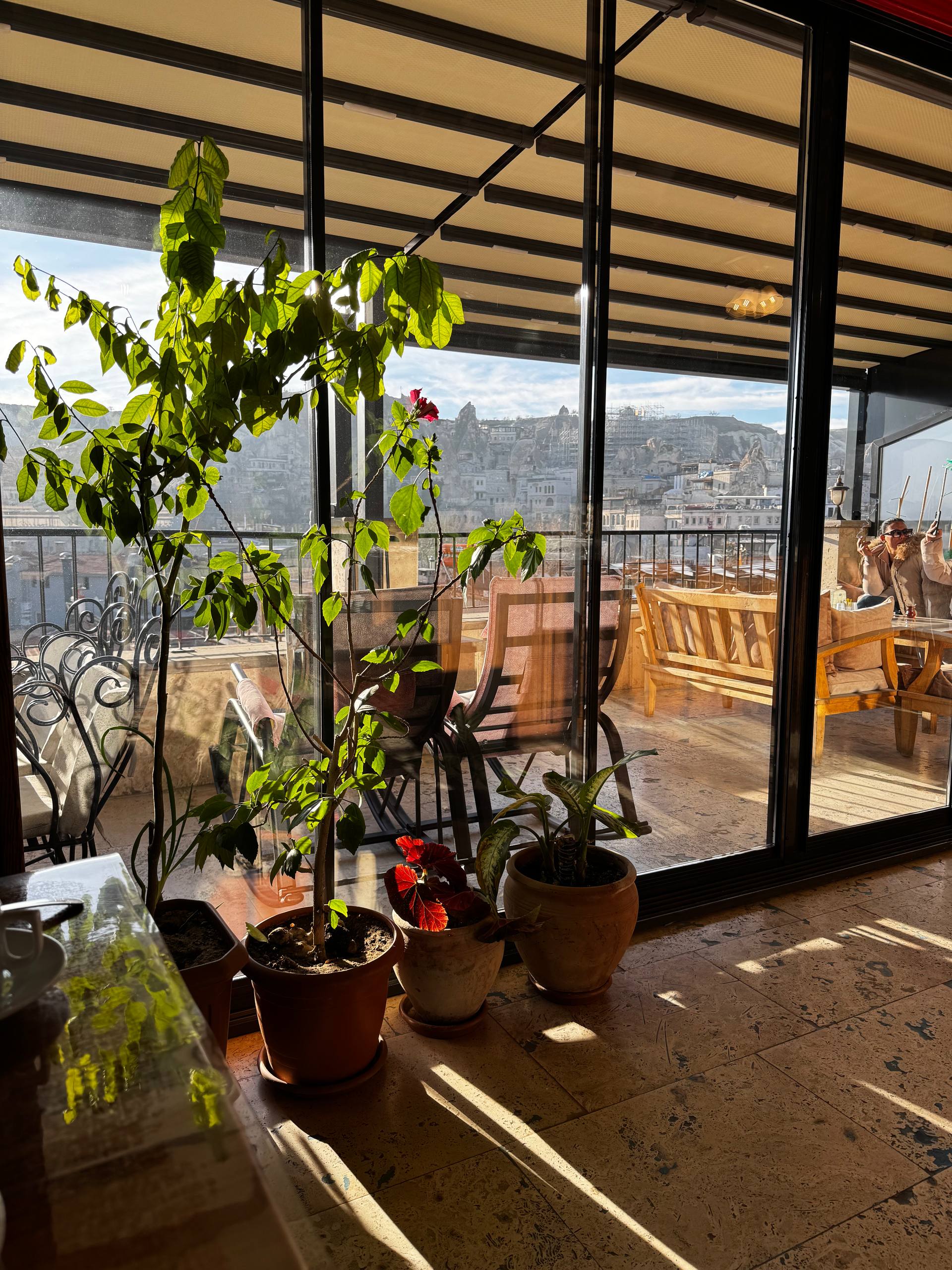 Интерьер тёплый, деревянный: резные шкафы, тяжёлые столешницы, мягкий свет от ламп под потолком. Всё немного по-домашнему. Отдельно стоит диван в турецком стиле с ковровыми узорами и подушками. Туда удобно просто пересесть с чашкой кофе, вытянуть ноги, посидеть в тишине. Такой уголок «просто для жизни», не только для еды. Есть лоджия и терасса на крыше, с которой открыватся виды на крыши Гёреме, скалы, те самые каменные холмы.