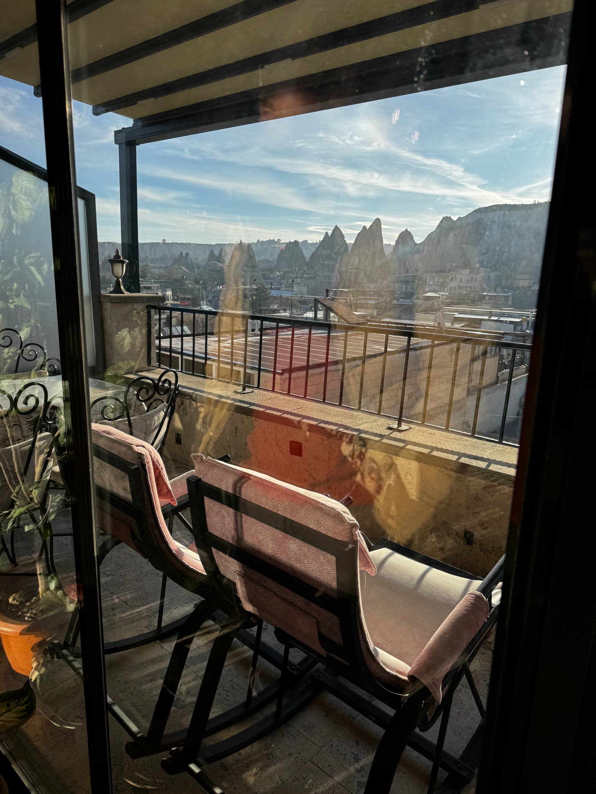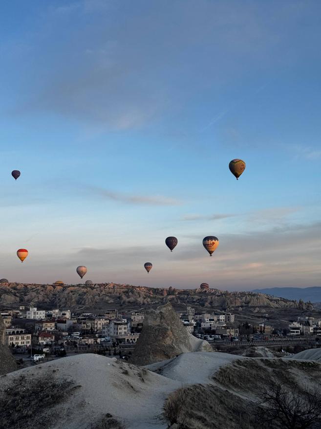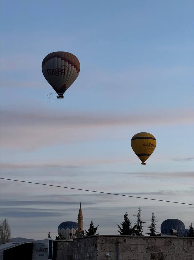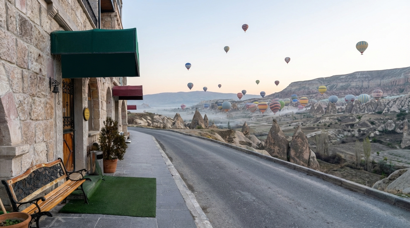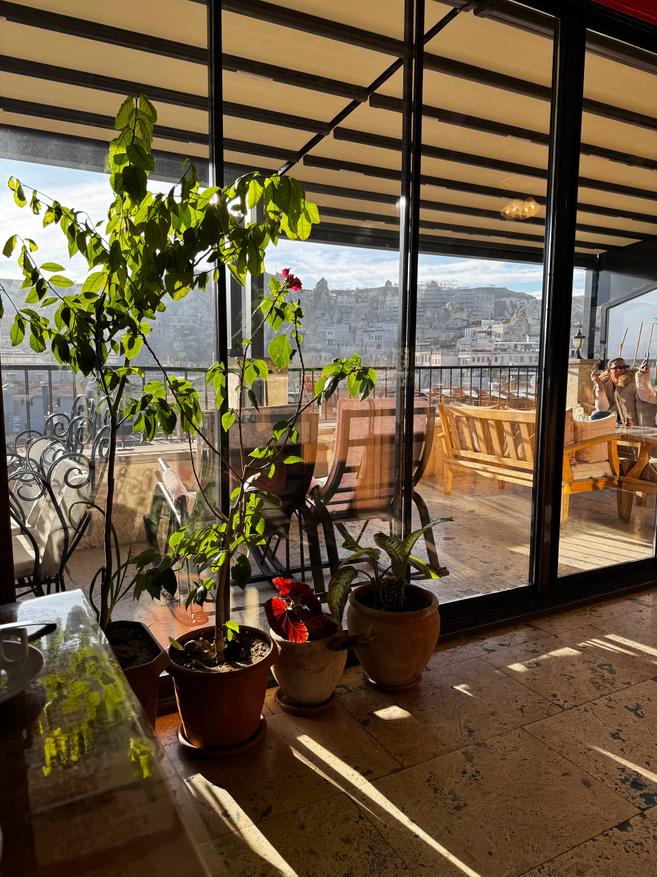 А ещё отсюда удобно смотреть на воздушные шары по утрам. Их видно прямо с террассы. Если хочется подойти ближе, можно пройтись пешком минут десять и выйти на открытое место или в долину, где шары пролетают совсем рядом. Для раннего подъёма это, наверное, один из самых приятных бонусов. В целом локация очень простая и понятная: всё рядом. В Гёреме это действительно удобно.