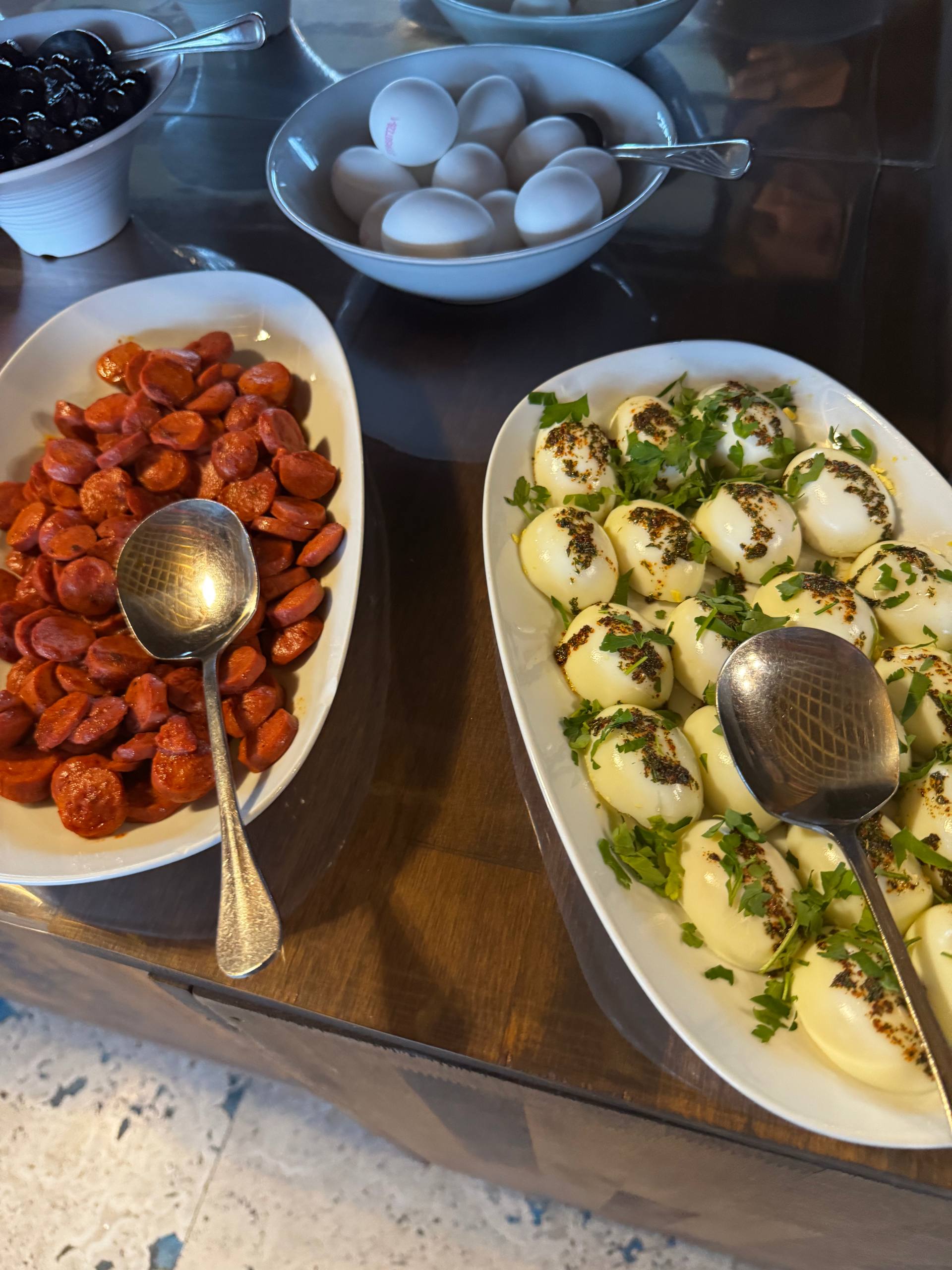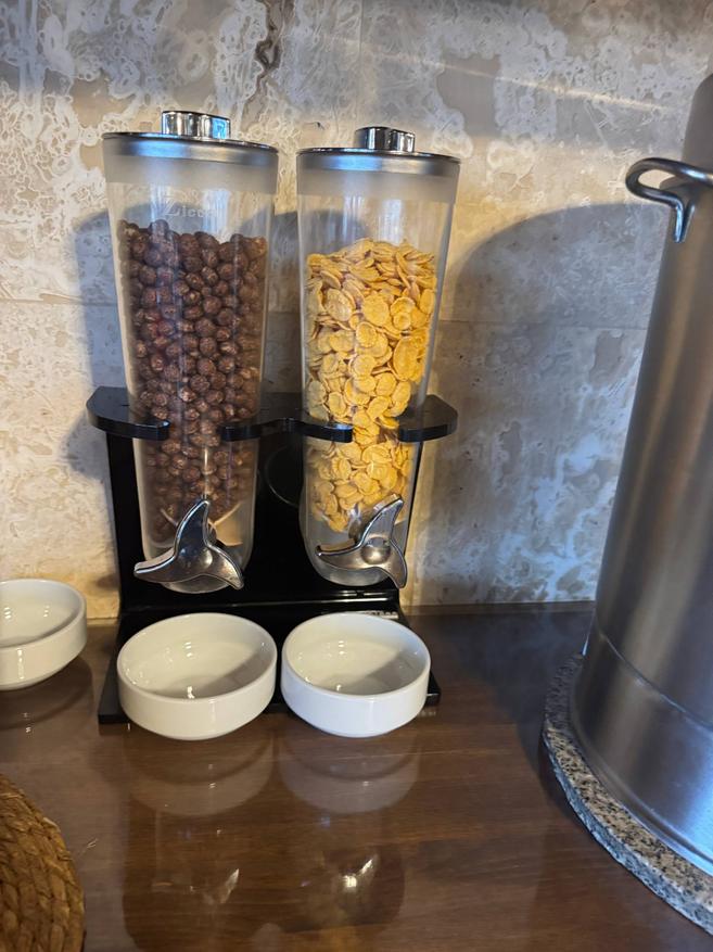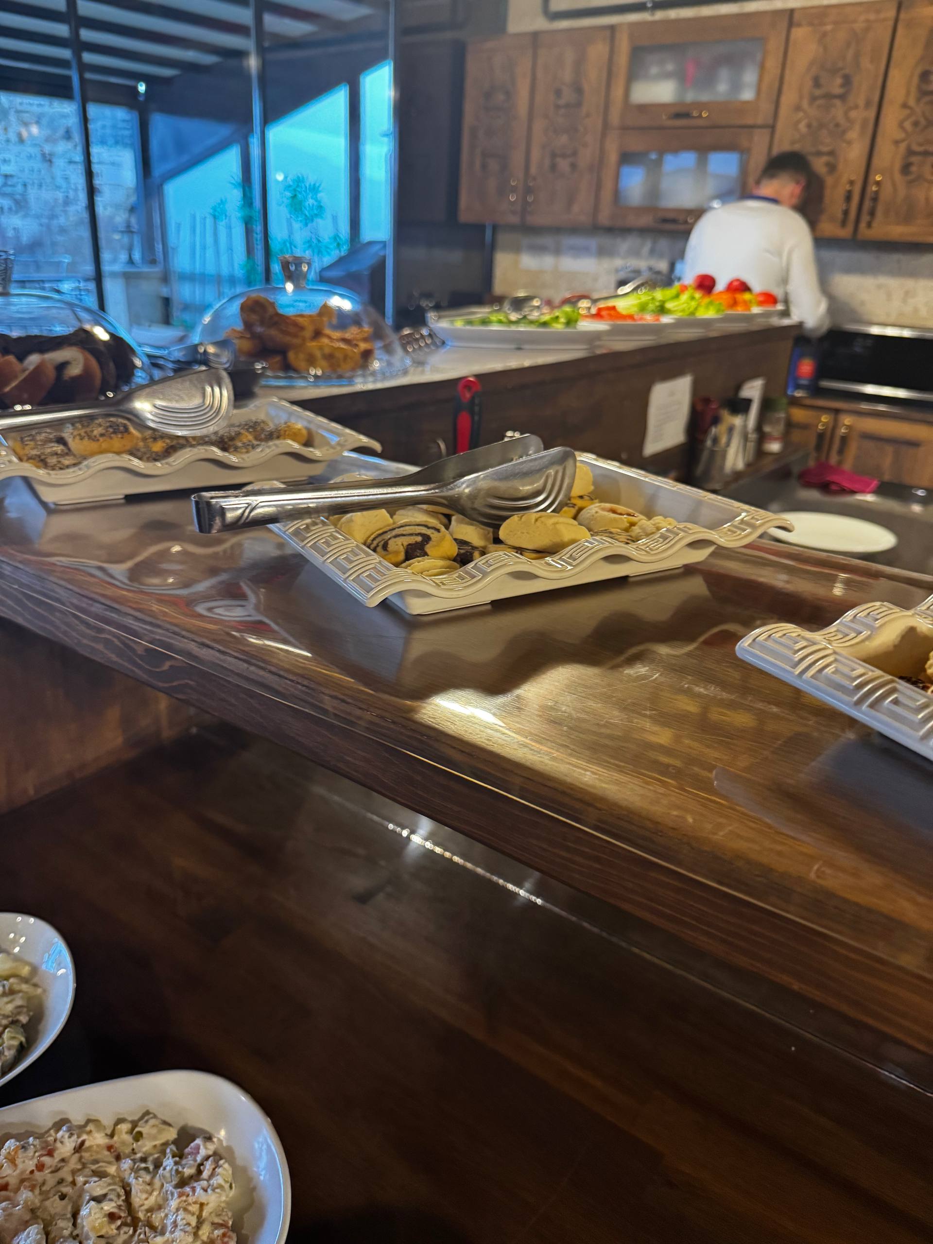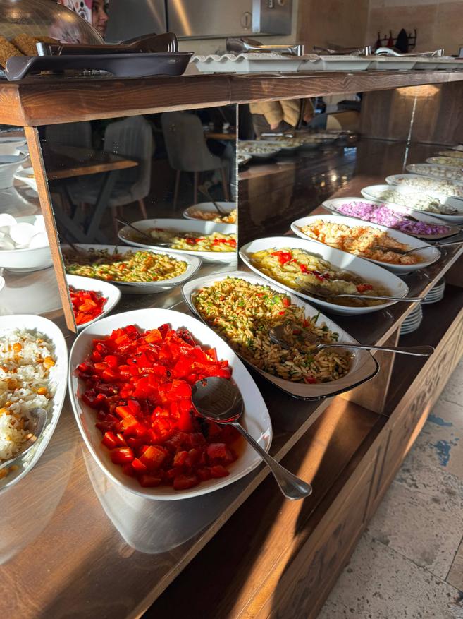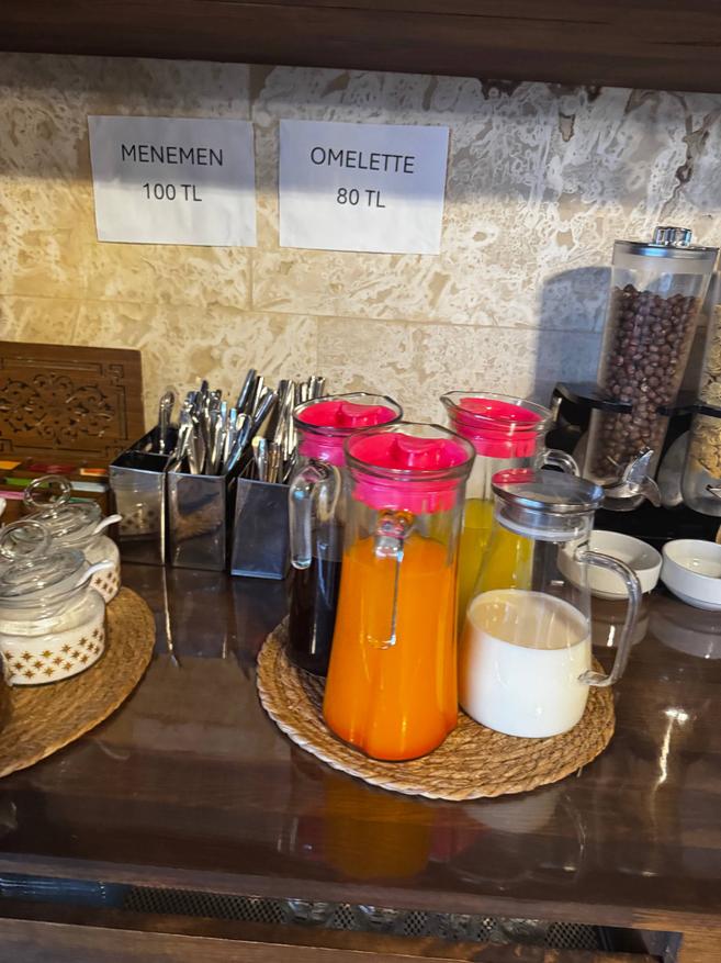 Завтрак лучше, чем ожидаешь. Для такого крошечного отеля, где всего девять номеров, выбор даже немного удивляет, не символический «чай-печенье», а вполне нормальный, разнообразный стол, из которого спокойно собирается полноценное утро. Есть несколько видов сыра, оливки, яйца, разные салаты, зелень, нарезанные овощи. Стоят миски с джемами, мёдом, соусами. Хлеб, выпечка, кексы, печенье. Мюсли, хлопья, молоко. Чай, кофе, соки. Если хочется чего-то горячего, за отдельную плату могут приготовить менемен или омлет, делают на кухне по запросу. Еда выглядит свежей. Ничего заветренного или «вчерашнего» не попадалось. Овощи хрустящие, хлеб мягкий, салаты не плавают в соусе.
