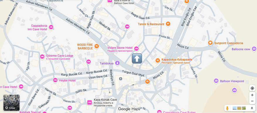 Volare Stone Hotel находится прямо в центре Гёреме, на спокойной боковой улице. Не на шумной трассе и не где-то на отшибе, а именно в той части посёлка, откуда всё рядом пешком. До кафе, магазинов и автобусной остановки, буквально несколько минут. Можно выйти без плана и просто идти куда глаза глядят, всё равно окажешься в центре.