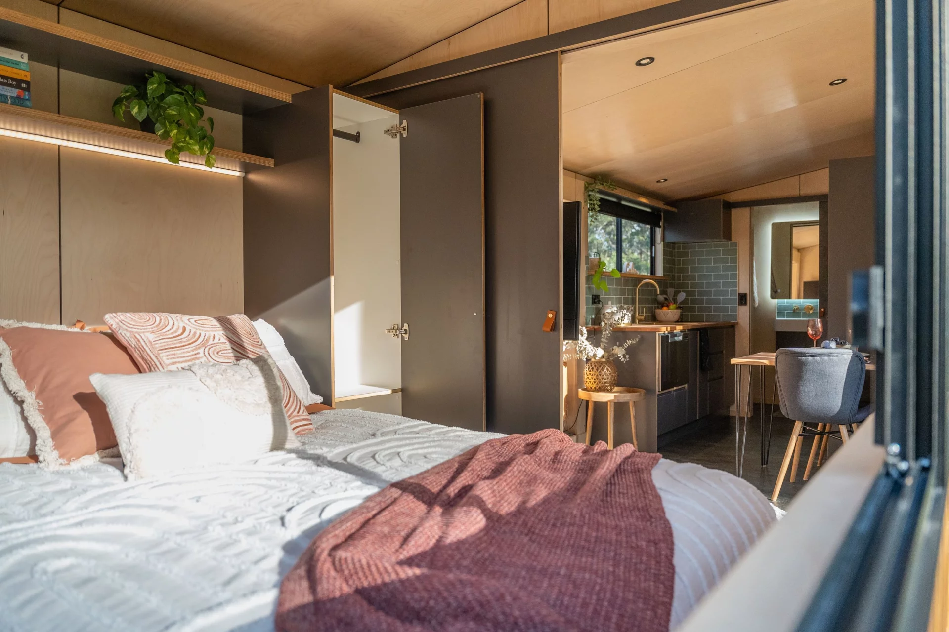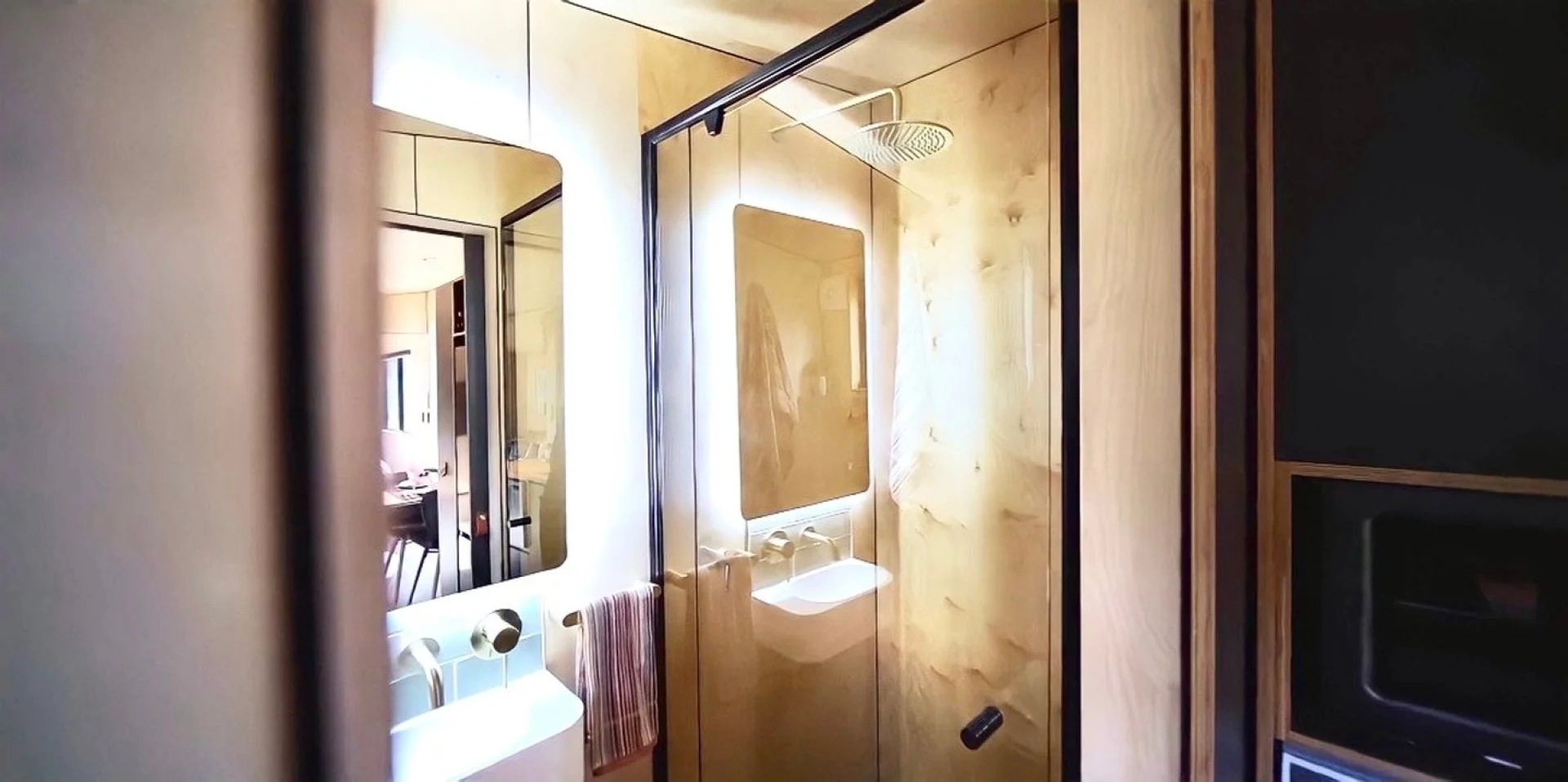 Спальня в Luna доступна через раздвижную дверь из кухни. В ней размещена двуспальная кровать с встроенными ящиками для хранения и несколько шкафов. Ванная комната оснащена раковиной, душем и унитазом со смывом, который при необходимости можно заменить на автономный биотуалет.