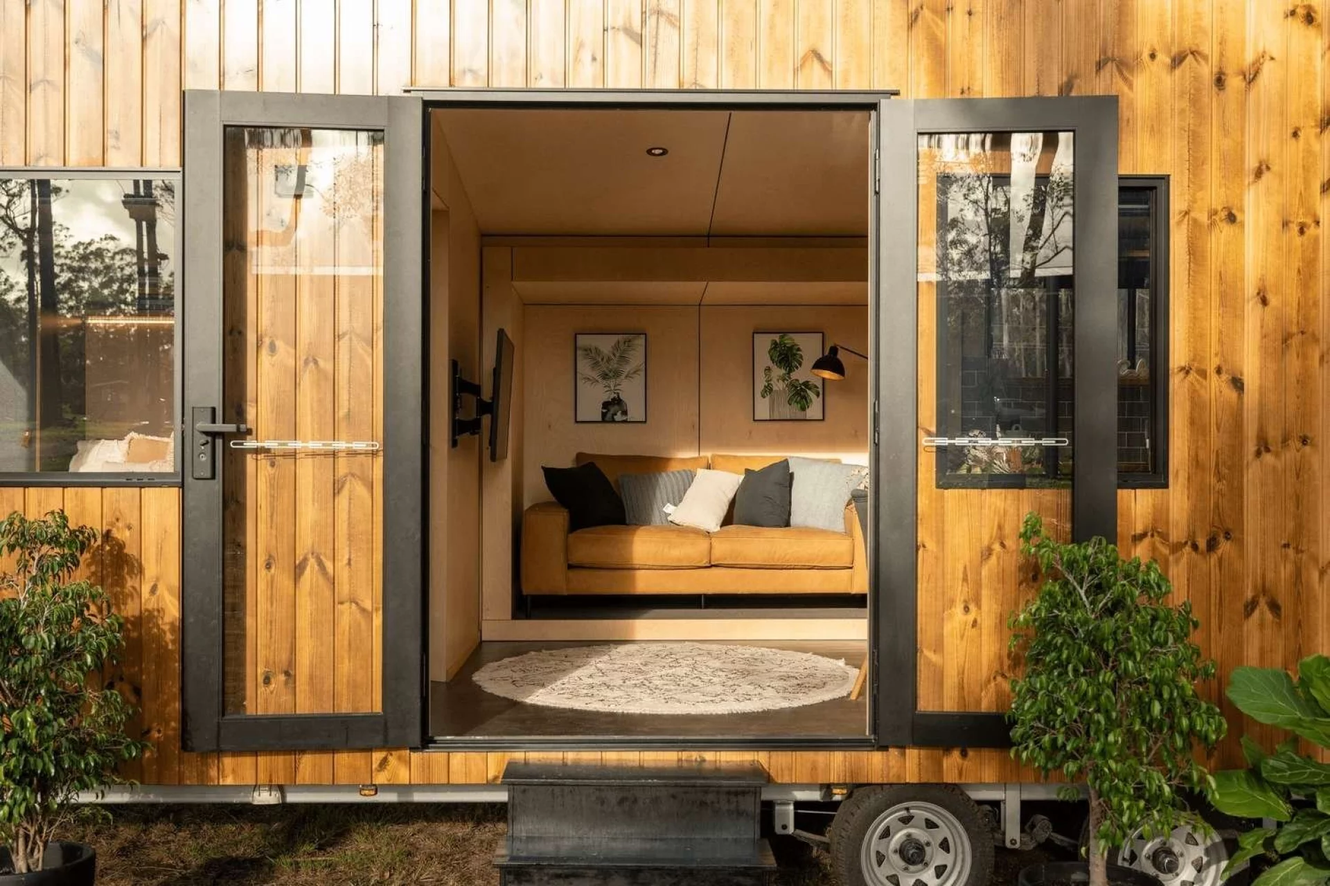 Внешняя отделка Luna выполнена из комбинации инженерной древесины и стали, что обеспечивает долговечность и эстетичный внешний вид. Вход в дом осуществляется через большие двустворчатые стеклянные двери, которые не только обеспечивают удобный доступ, но и визуально расширяют пространство, наполняя его естественным светом.