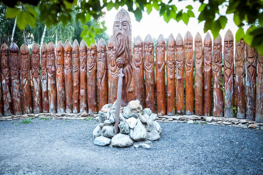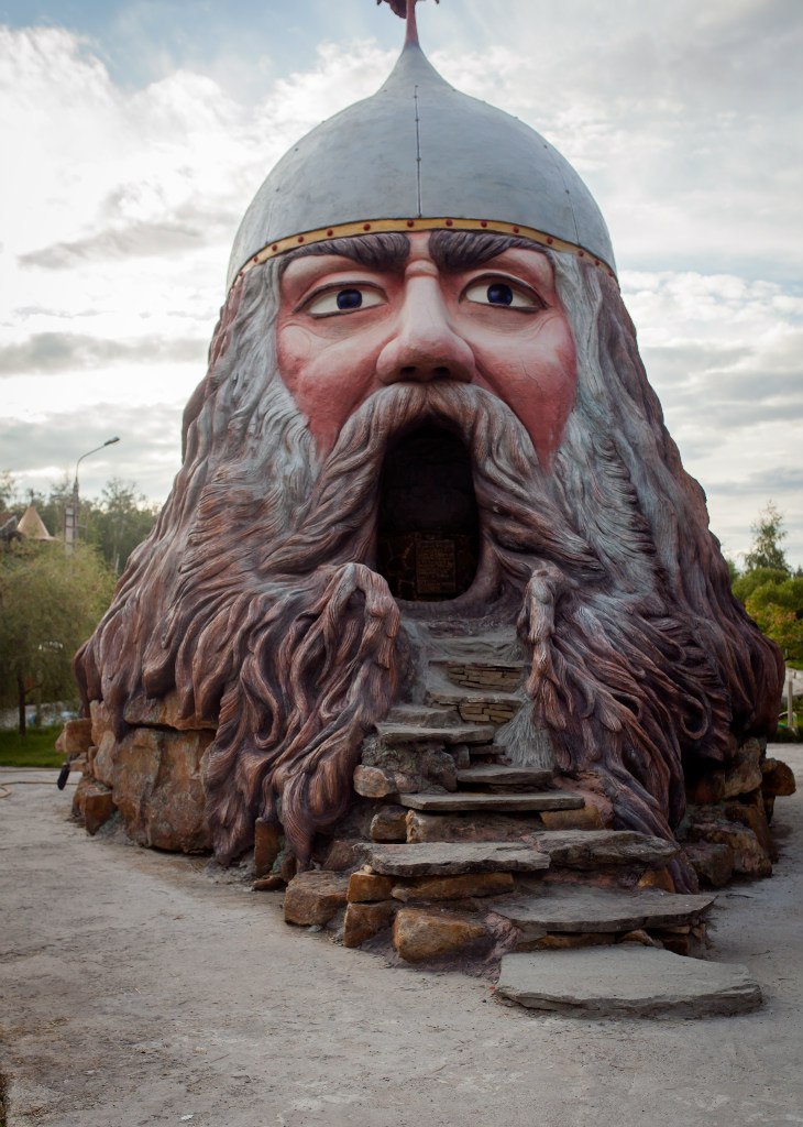 На входе в парк, вас повстречает богатырская голова, внутри которой находится кристал исполняющий желания. Согласно легенде: огромный русский богатырь Святогор жил в горах, пока враги не прогнали его на землю, в которую он увяз всем телом.