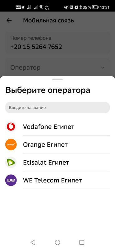 Для оплаты заходим в Платежи — Оплатить мобильную связь — нажимаем на кружок с российским флагом и там появляется выбор страны. Выбираем Египет, вводим номер телефона, выбираем оператора.