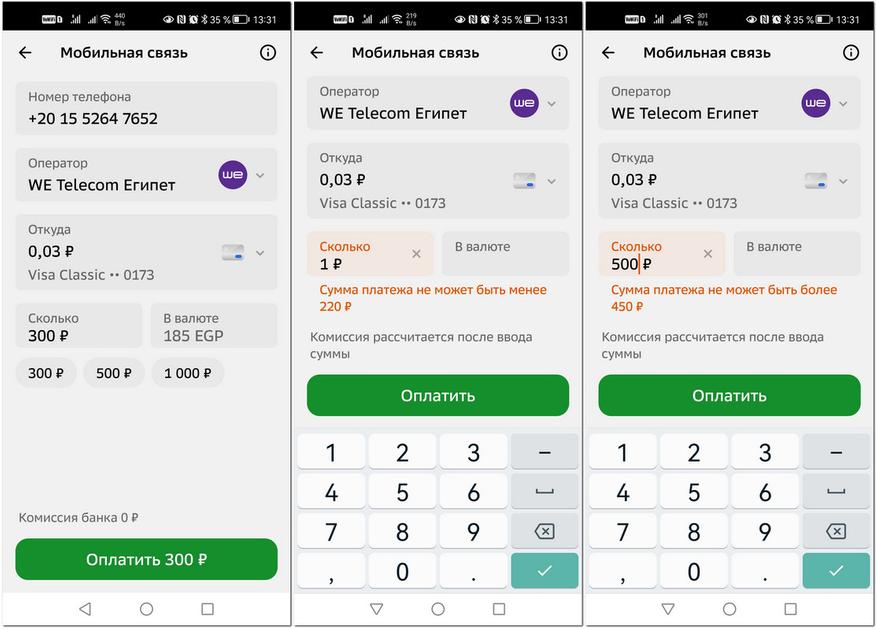 Я оплачивал связь оператора We. Почему-то можно оплатить не менее 220 и не более 450 рублей.