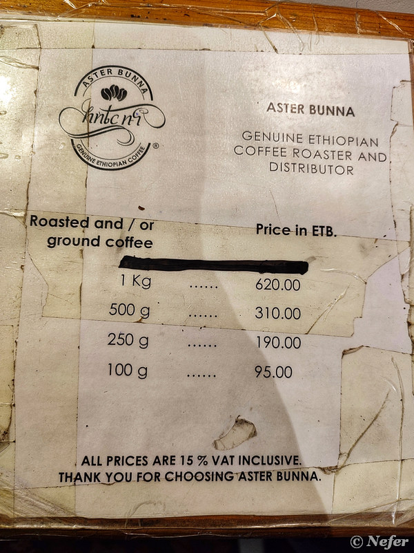 Из Эфиопии запрещены к вывозу предметы, сделанные из костей, рогов и шкур диких животных, а также зеленый кофе. Жареный кофе можно вывозить в любых количествах, хоть полный чемодан. Ниже цены для наглядности. Курс 1 быр равен примерно 1,20 рубля.
