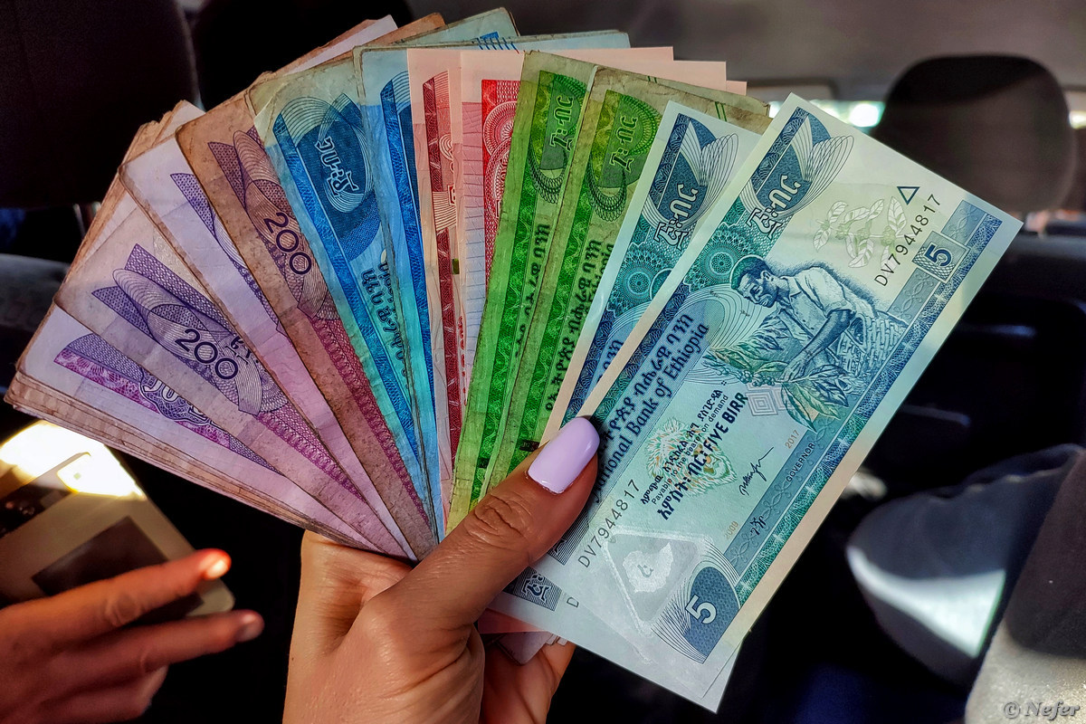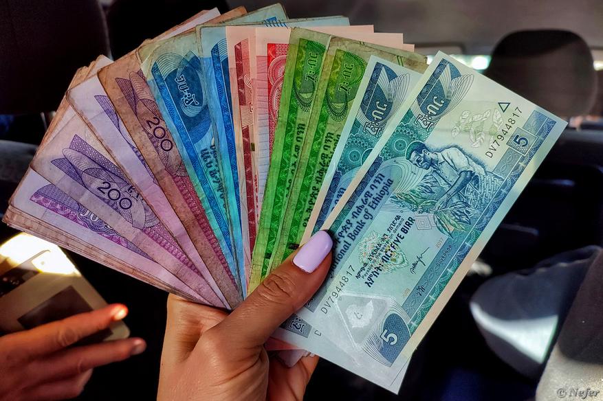 По прибытии в Аддис-Абебу необходимо обменять иностранную валюту на эфиопские деньги - быр. Долларами рассчитываться можно только в аэропорту и в некоторых международных отелях. Курс доллара/евро/фунта одинаковый во всех банках по стране. Иногда деньги меняют в гостинице, это законно, но курс обмена чуть ниже. На черном рынке не меняйте - угодите в полицейский участок. Лучше всего привозить доллары - курс устойчивый. Купюры не должны быть рваными. Сразу много денег не меняйте, обратно быры на доллары поменять практически невозможно. На фото 5300 быр, эквивалент 100 USD.