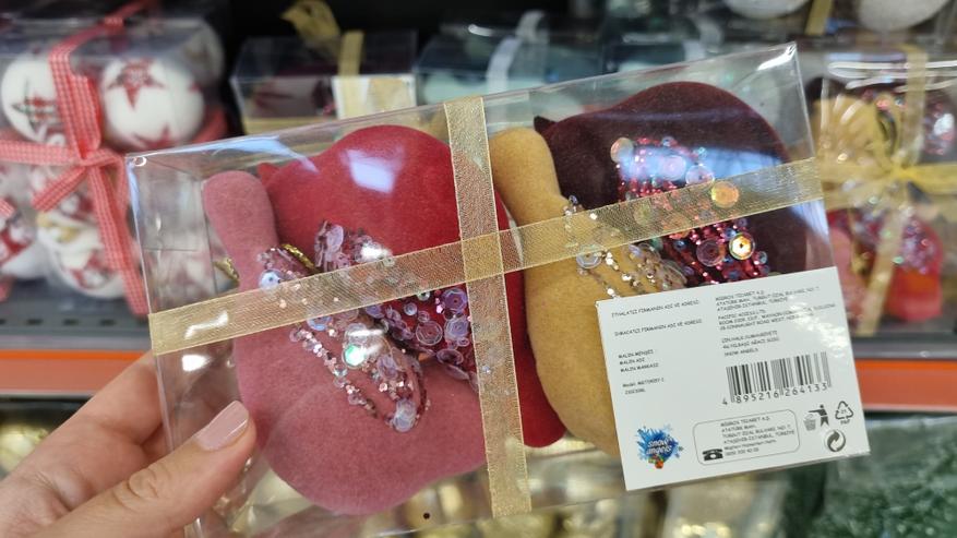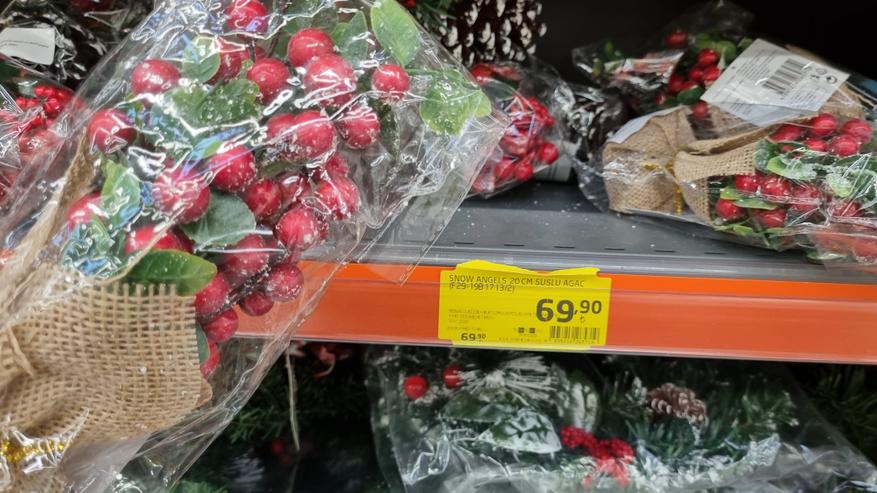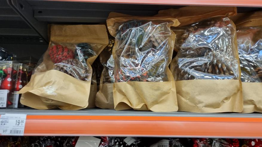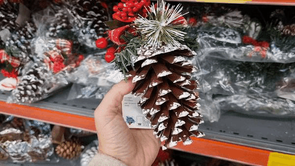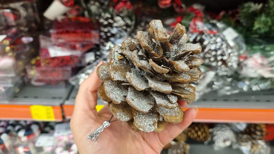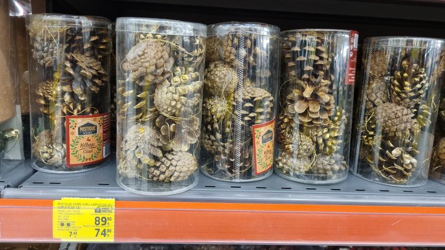 В магазине я нашла довольно интересные натуральные шишки с напылением для новогоднего декора. Стоимость одной крупной шишки составляет 44 лиры или 148,91 руб. Более мелкие шишки продаются наборами. Такие шишки можно положить на новогодний стол в качестве декора, или заполнить ними прозрачную стеклянную вазу для создания новогодней атмосферы.
