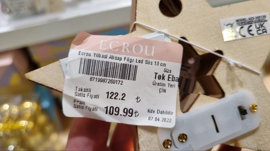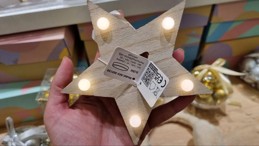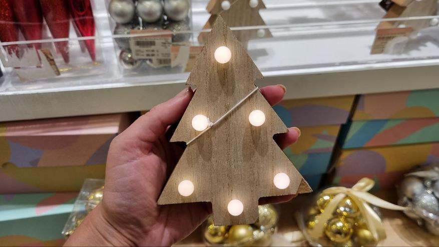 Оригинально смотрятся различные фигурки из дерева. Обычно это сказочные персонажи, но мне приглянулись две игрушки: звезда и ёлка. Игрушки оснащены диодами, мягкая подсветка придает тепло и уют. На задней част есть кнопка включения. Питаются от батарейки. Цена каждой составляет 122 лиры или 412 руб. Такую игрушку можно использовать в качестве дополнительного декора комнаты, но для ёлки, я думаю, будут слишком громоздкие.