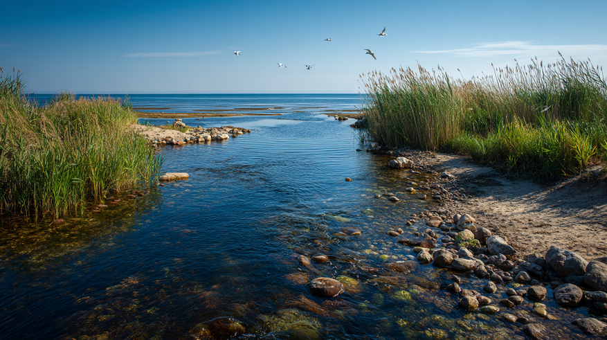 На восточном и южном побережье Азовского моря в него впадает множество небольших степных рек, таких как Ея, Бейсуг, Челбас, Солёная и частично Арабатская. На карте они выглядят скромно, но именно эти водотоки питают лиманы — мелководные заливы, где солоноватая морская вода смешивается с пресной речной. В таких местах формируются уникальные экосистемы. Здесь нерестится рыба, гнездятся перелётные птицы, развивается планктон — всё это делает лиманы жизненно важной частью прибрежной природы.
