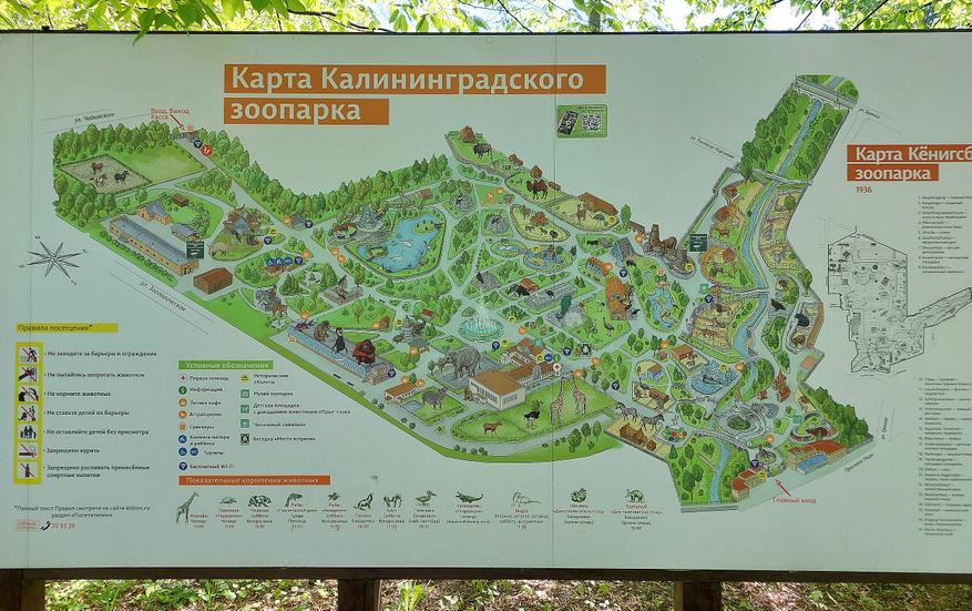 Официальным днём рождения Калининградского зоопарка в России считают 27 июня 1947 г., когда вышло Постановление о восстановлении зоопарка на базе старого зоосада. И это единственный зоопарк, в котором сохранились многие исторические постройки, ещё с довоенных времён. На его территории находятся 11 предметов охраны культурного наследия. К ним относятся фонтан, медвежатник, мост, несколько скульптур. Все исторические объекты отмечены жёлтым кружком на карте-схеме, которую можно увидеть в самом начале зоопарка.