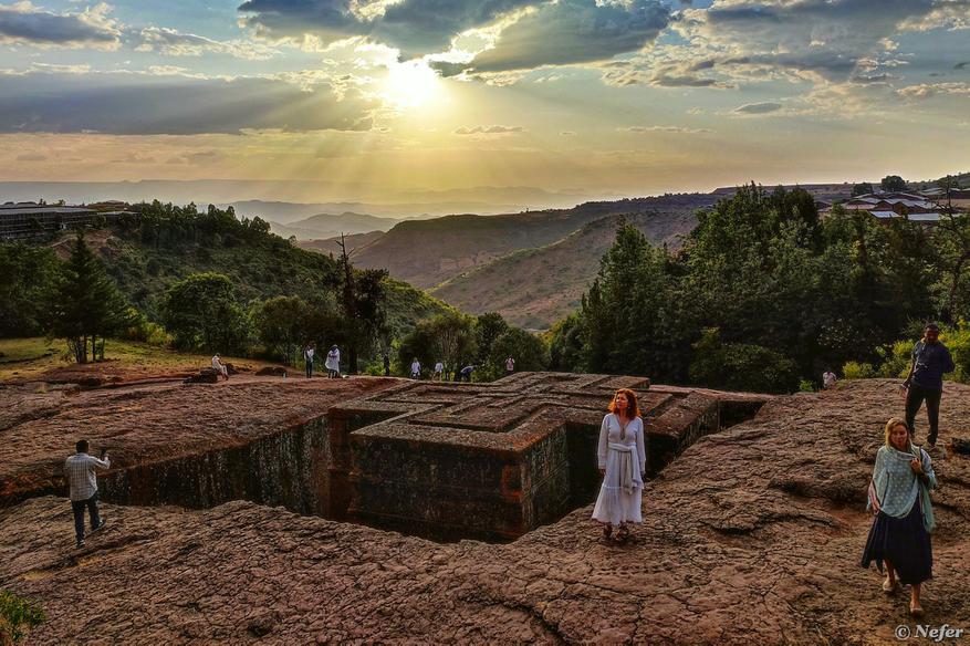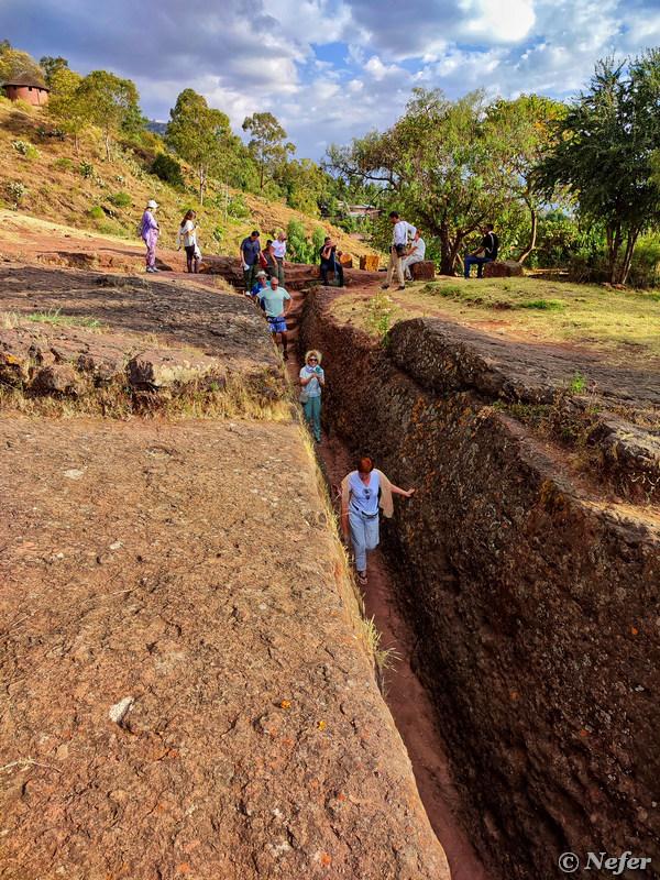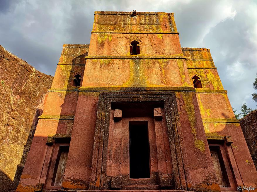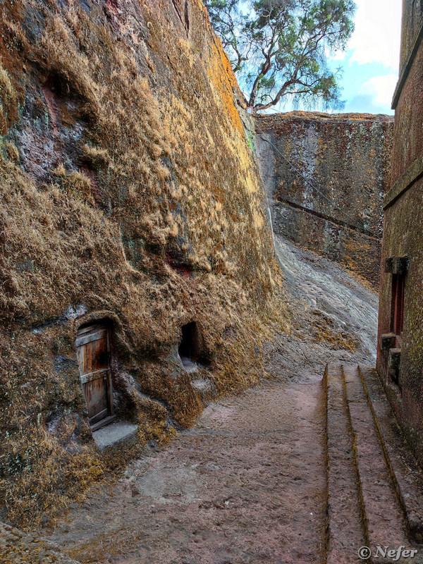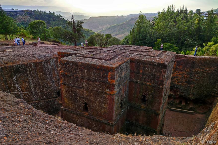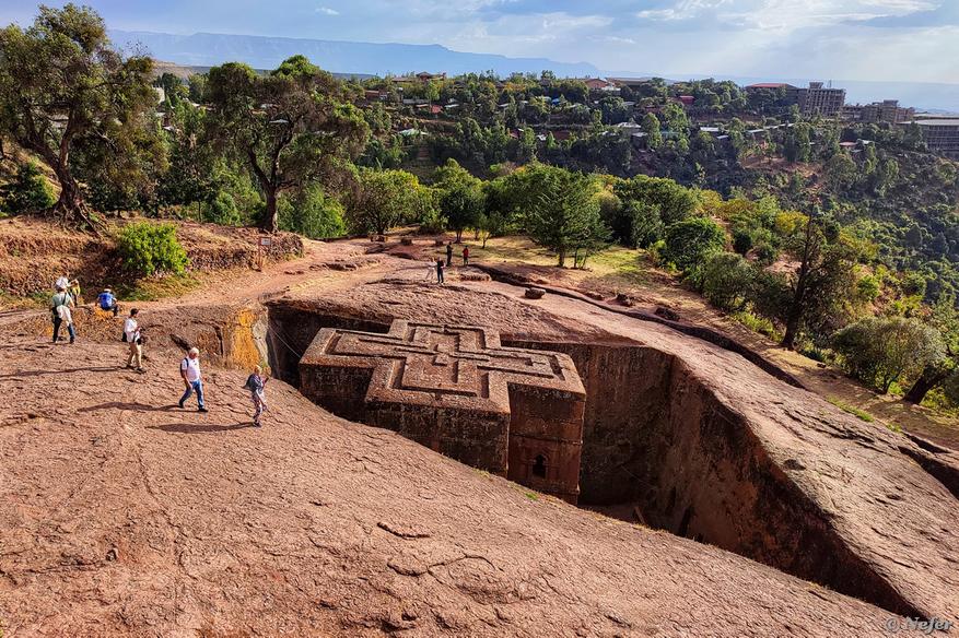 Церковь Святого Георгия была построена во время правления императора Гебре Мескеля Лалибелы. Собственно, в честь него и назван город. Раньше он назывался Роха, что означает "чистый". На амхарском церковь называется Бет Гиоргис (Bete Giyorgis), на карте нужно искать такое название. К сожалению, в Эфиопии запрещены дроны, сделать фотографии сверху можно только взобравшись на окружающие скалы.