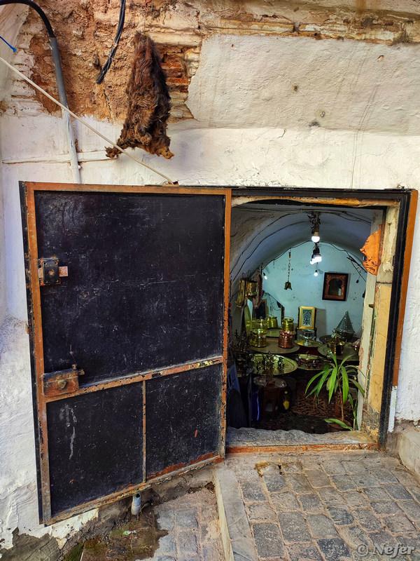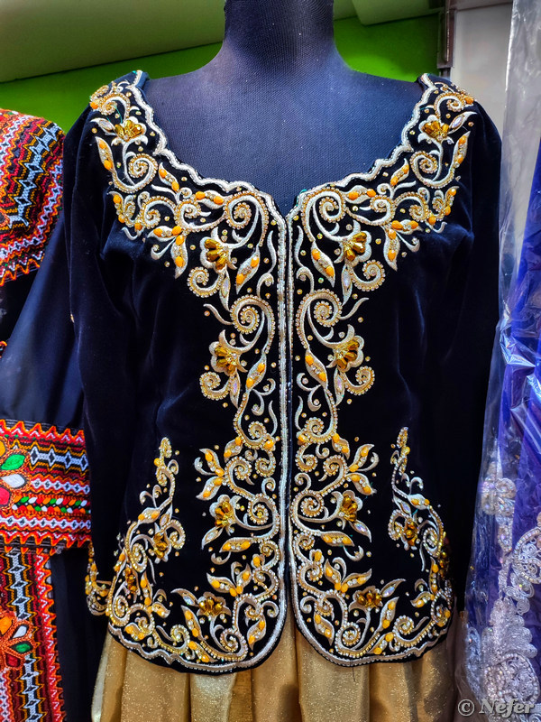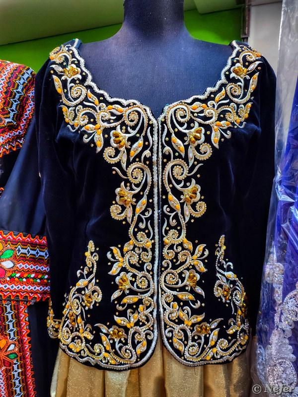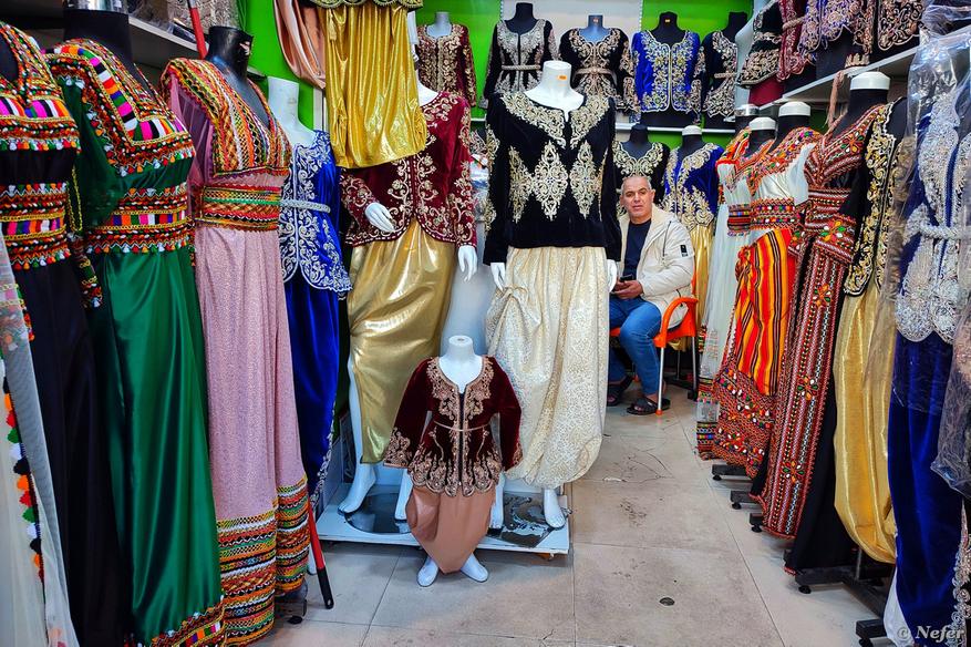 Обожаю лавки с одеждой. Часто покупаю такое для фотографий и привожу домой как сувенир. Слева платья в духе алжирского национального костюма, такую одежду носят женщины на севере Алжира. Там проживает народность кабилы (в Алжире произносят «кабили»), это тоже берберы. Пиджак, расшитый золотыми и серебряными нитями называется караку, иногда переводят как каракоу, потому что пишется karakou. Бывают еще такие же длинные платья с вышивкой — джебба фергани.