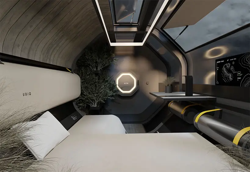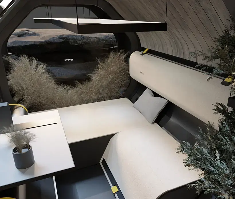 Основу конструкции HYTTE составляет модульная платформа с двумя изогнутыми фиксаторами по бокам, которые надежно удерживают жилой модуль. Эта система позволяет легко заменять или отсоединять модули в зависимости от потребностей владельца. Благодаря такому решению мобильный дом может трансформироваться из спального места в рабочее пространство или гостиную.