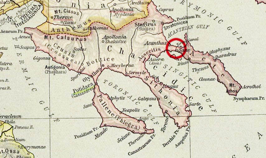 Длина полуострова Айон-Орос составляет всего около 50 км, так что античный флот вполне мог его обойти, но все же было решено проложить более короткую дорогу в виде канала. Причиной стал крайне неудачный опыт персидского полководца Мардония, который в 492 году до н.э. пытался провести вверенный ему флот вокруг опасных скал неподалеку от горы Афон в ходе Первого персидского вторжения в Грецию. Коварные воды полуострова унесли во время шторма значительную часть флота царя Дария I, потери оцениваются в ~ 300 кораблей и 20 тыс. человек.