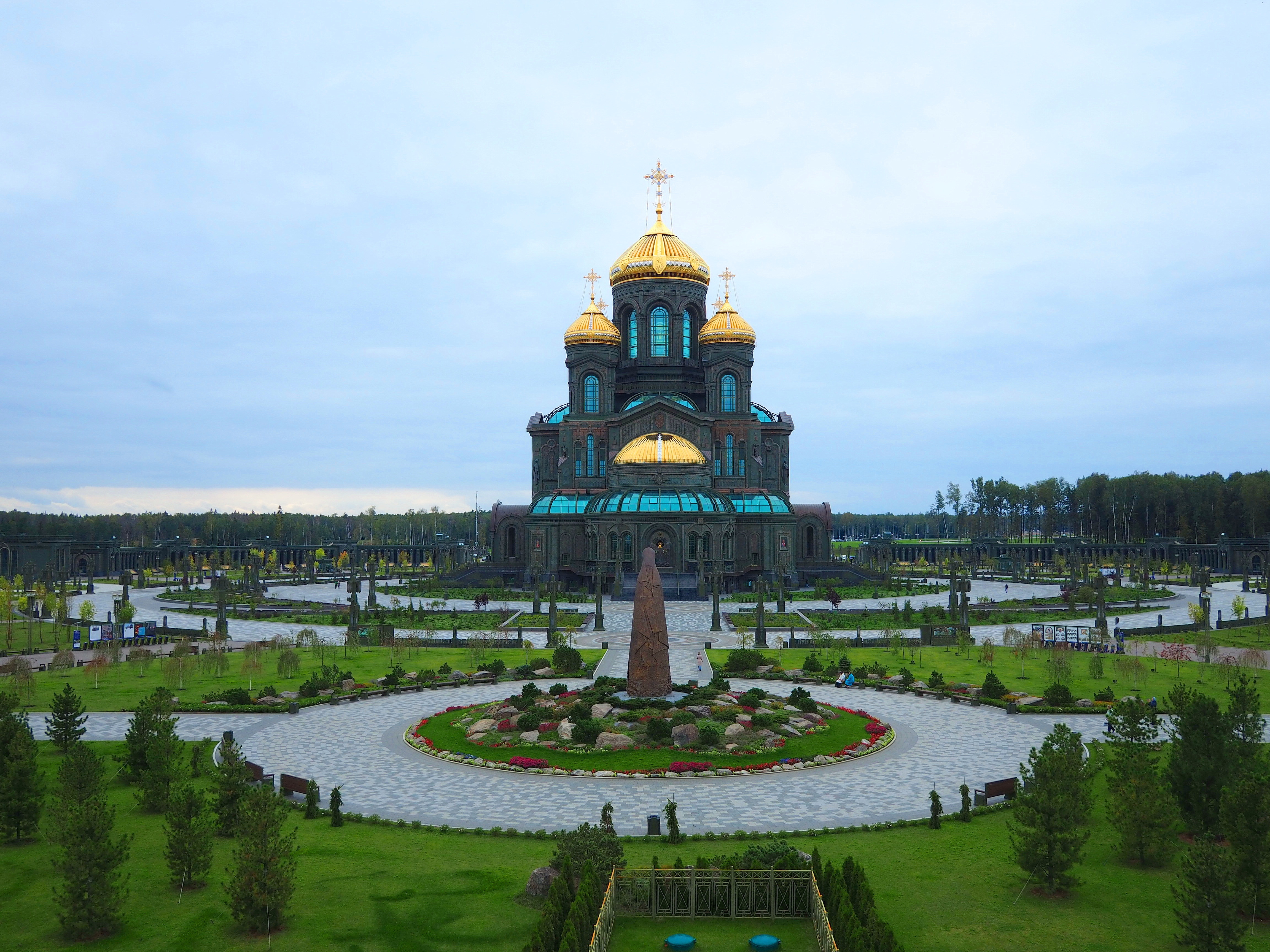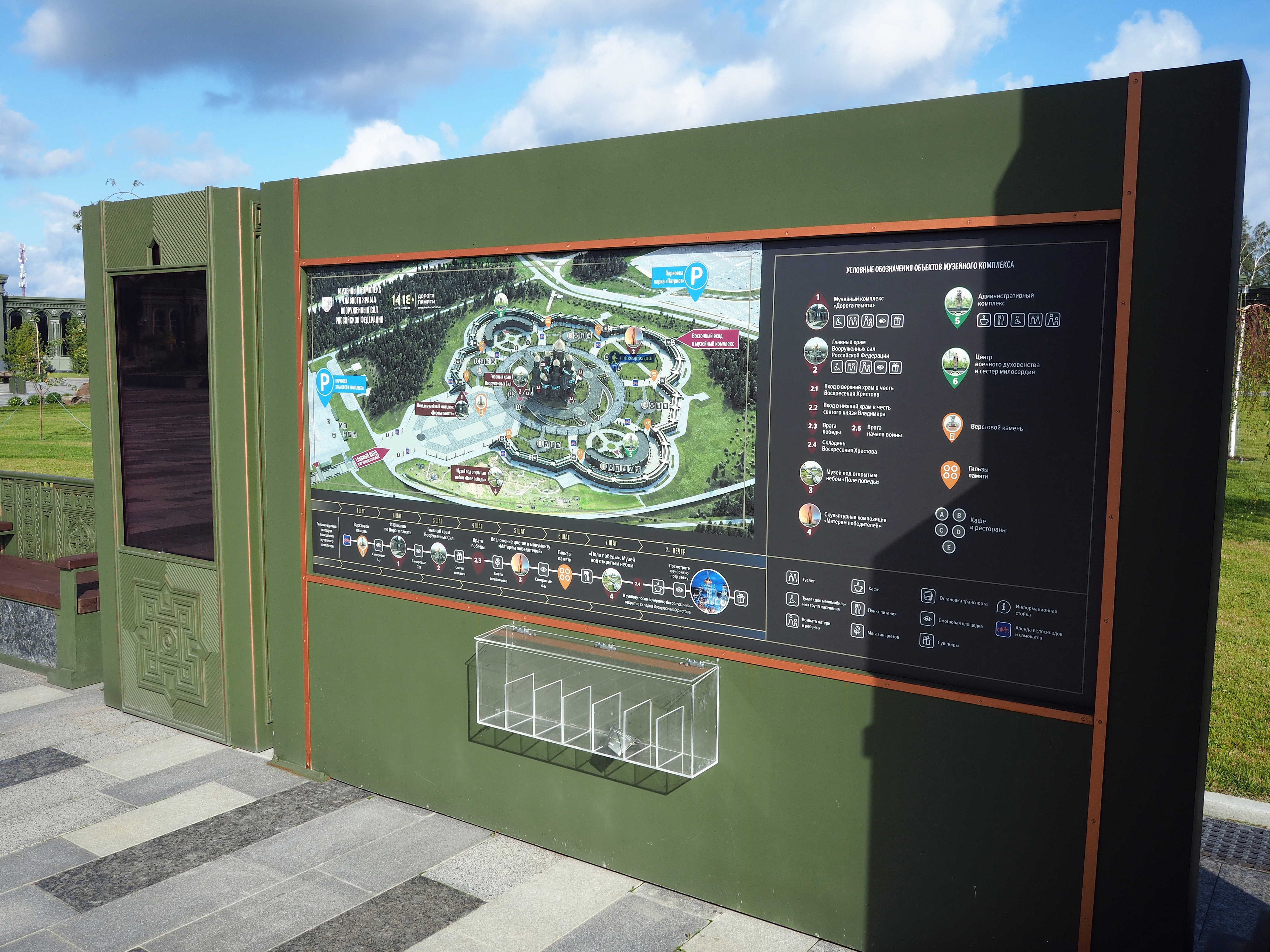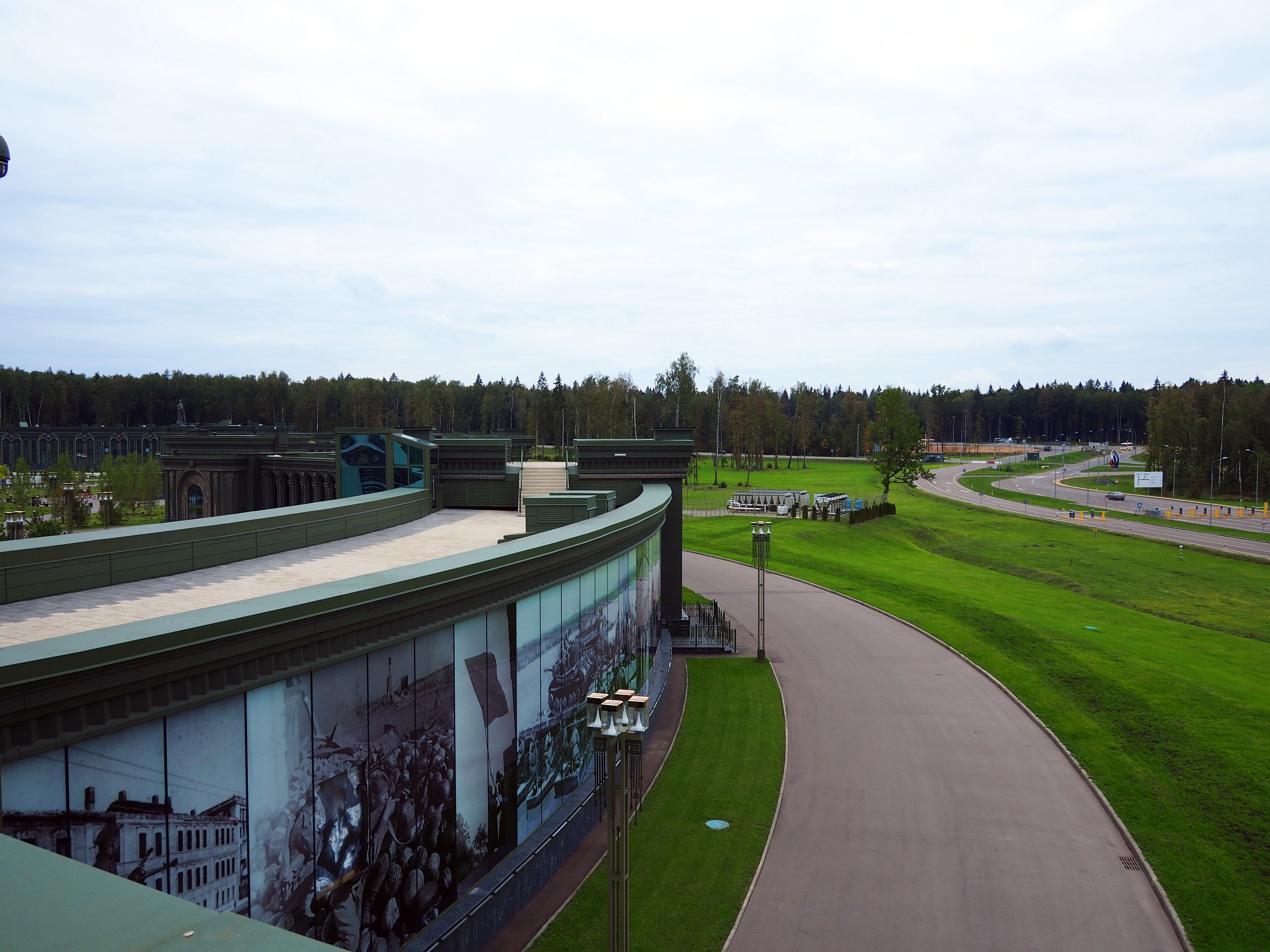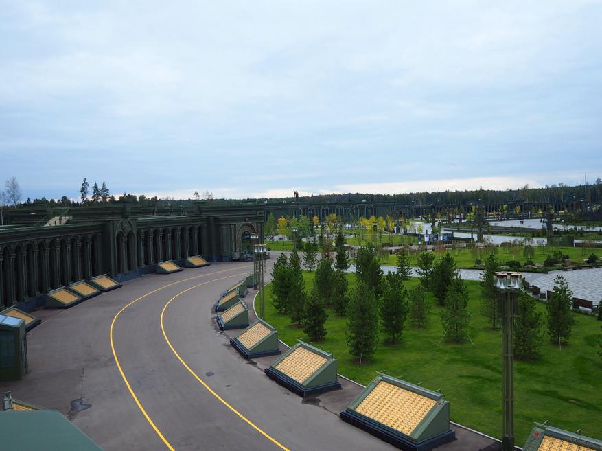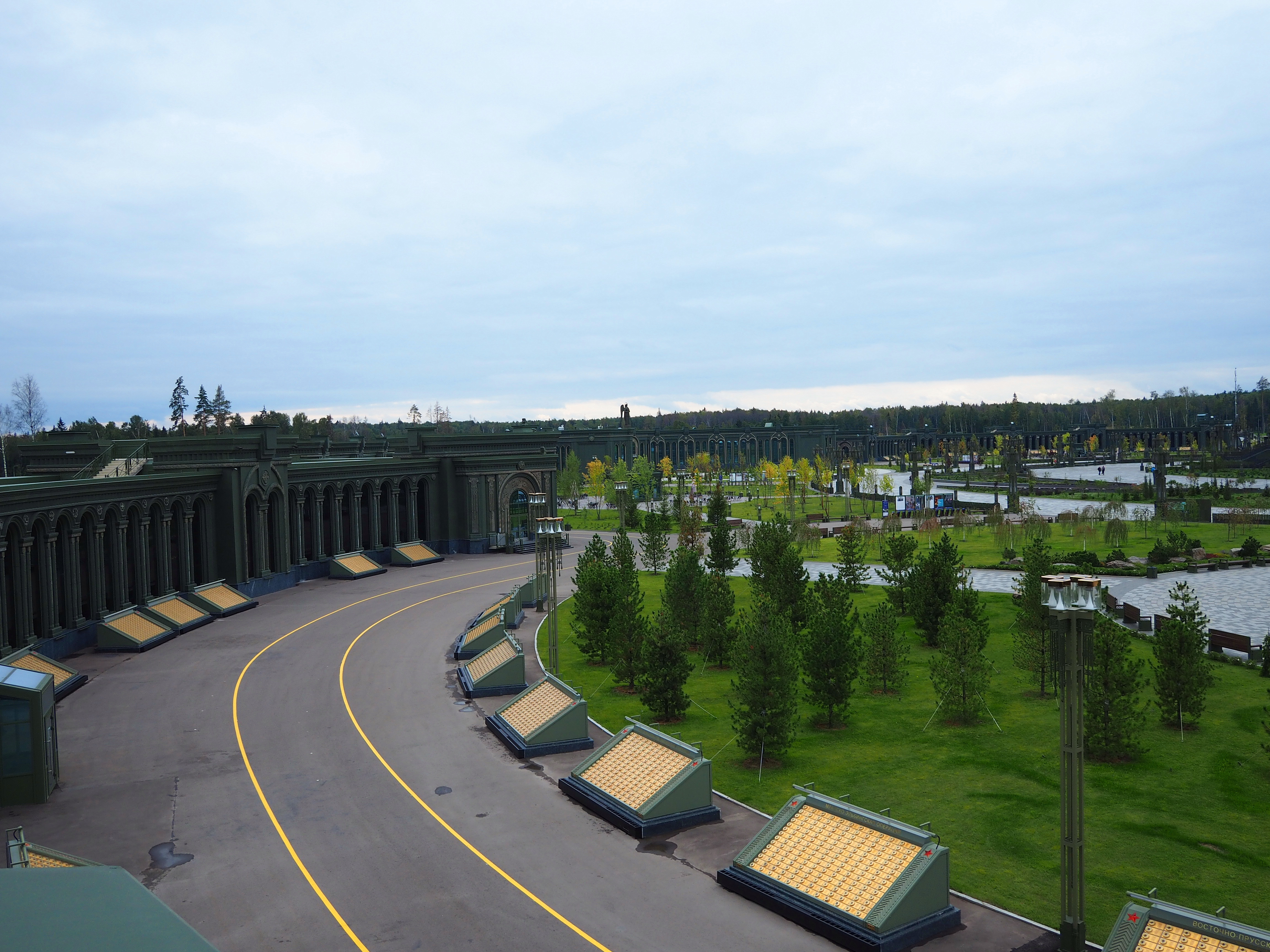 Территория парка «Патриот» огромна. Конечно на этой территории не затеряется такое большое сооружение как Главный храм Вооружённых сил. Но музейный комплекс можно не то, что потерять. Можно не сразу понять, что сооружение, которое опоясывает храм полукругом — это и есть музей «Дорога памяти. 1418 шагов к Победе».
