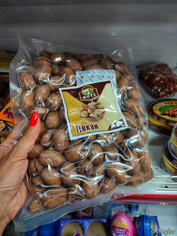 Нашла пекан в скорлупе. Килограммовый пакет стоит 1050 рублей. Пекан внешне похож на грецкий орех, только у него нет жестких внутренних перегородок, и он не бывает прогорклым. Хоть они и родственники, вкус пекана сильно отличается, такой слегка сладковатый с оттенками шоколада даже.