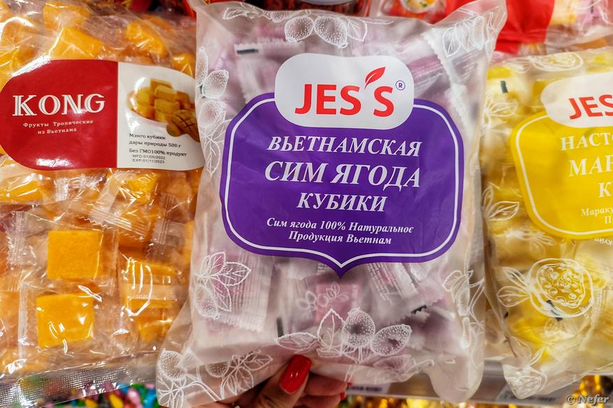 На самом нижнем уровне (минус первый этаж) вьетнамские магазинчики. Мы всегда ходим в один и тот же, большой такой на углу, Asia называется. Там большой ассортимент, хорошие цены и принимают банковские карты. Накупила сушеного манго, взяла пакетик сушеных апельсинов и кокос кусочками. Это у меня вместо конфет. Попалось что-то новенькое, я не знаю, что такое сим-ягода. Вьетнамцы объяснить не смогли, помог интернет, оказалось, это ягоды дерева мирт.