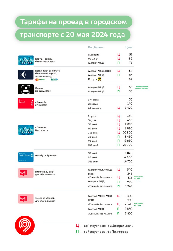 Впрочем, 11 лет назад он уже стоил 17 тысяч рублей. Так что нынешние 20,5 это лишь 20% - за 11 лет, подчеркну. Если б все остальные тарифы менялись также, так и говорить было бы не о чем. Но вот одна поездка по «Тройке» в центральной зоне тогда обходилась в 30 рублей, а с 20 мая начнёт стоить 57 рублей — почти два раза набралось. Хотя само по себе последнее повышение относительно гуманное — в основном всё укладывается в 5-6%. Но и не стоит забывать, что это за пол-года. Так что более корректно пересчитывать хотя бы год к году, а тут посерьёзнее. Та же разовая поездка в центральной зоне будет стоить 57 рублей, а не 50 — как годом ранее. Пригородная зона МЦД тянет уже на 76 рублей, а не на 65 годом ранее — почти 20%.