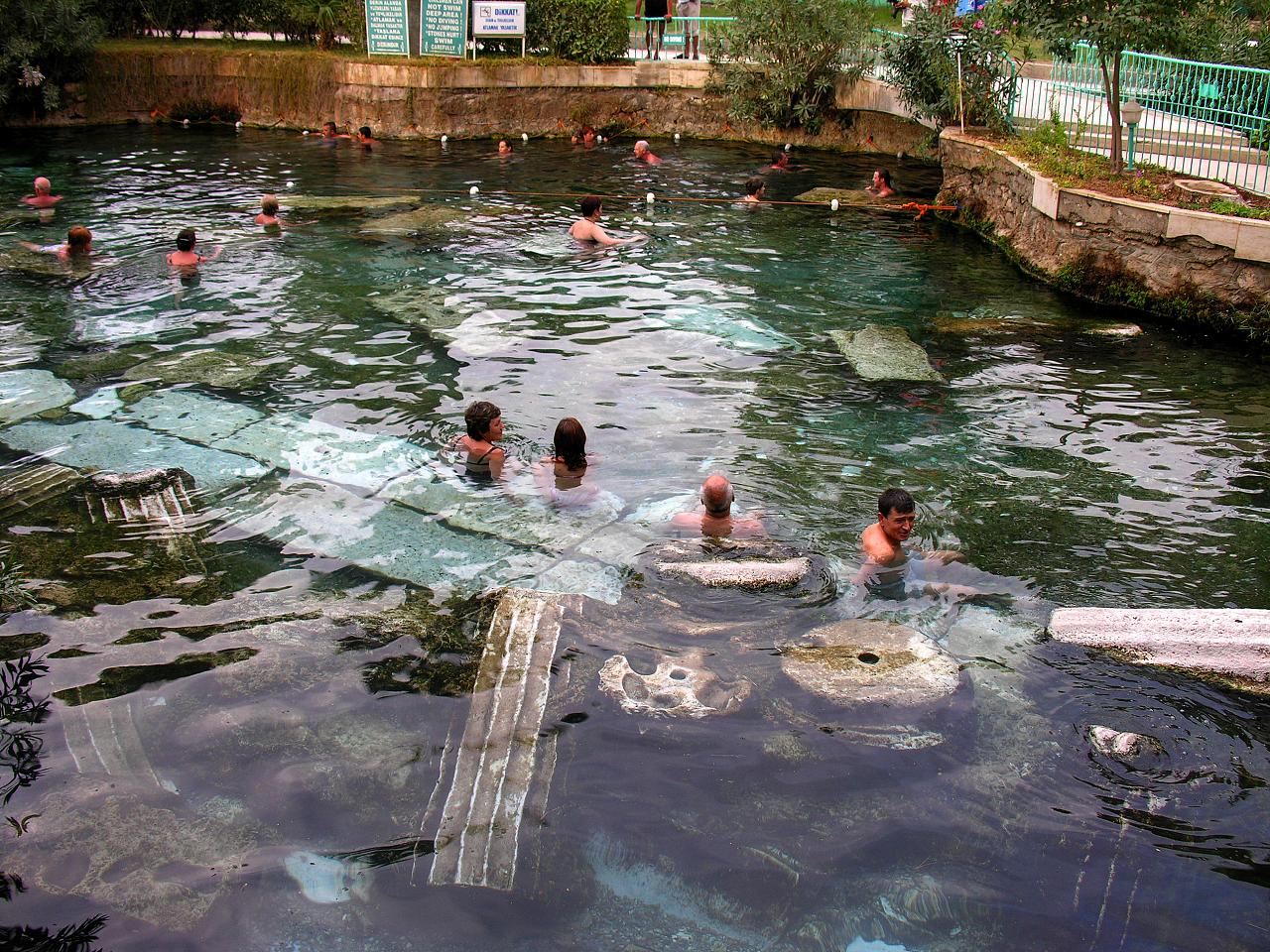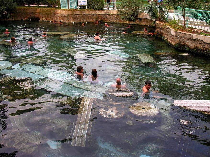 Среди объектов Иераполиса особое место занимает античный бассейн, известный как «Бассейн Клеопатры». Его уникальность заключается в необычном сочетании природных и рукотворных элементов. Термальная вода с температурой около 36°C наполняет бассейн, на дне которого лежат фрагменты античных колонн и других архитектурных элементов, упавших во время землетрясений.