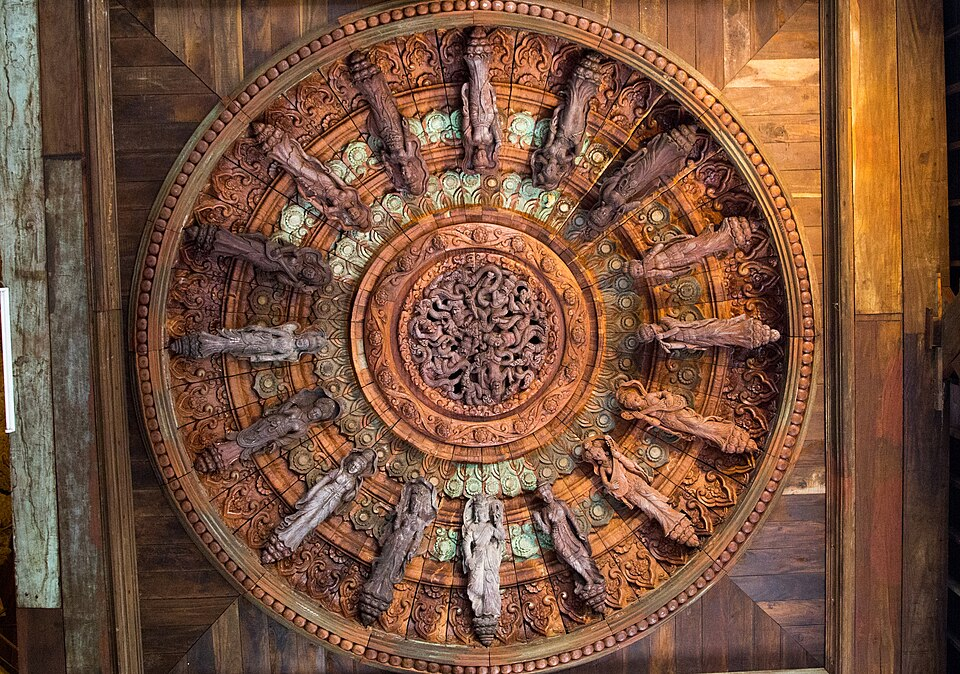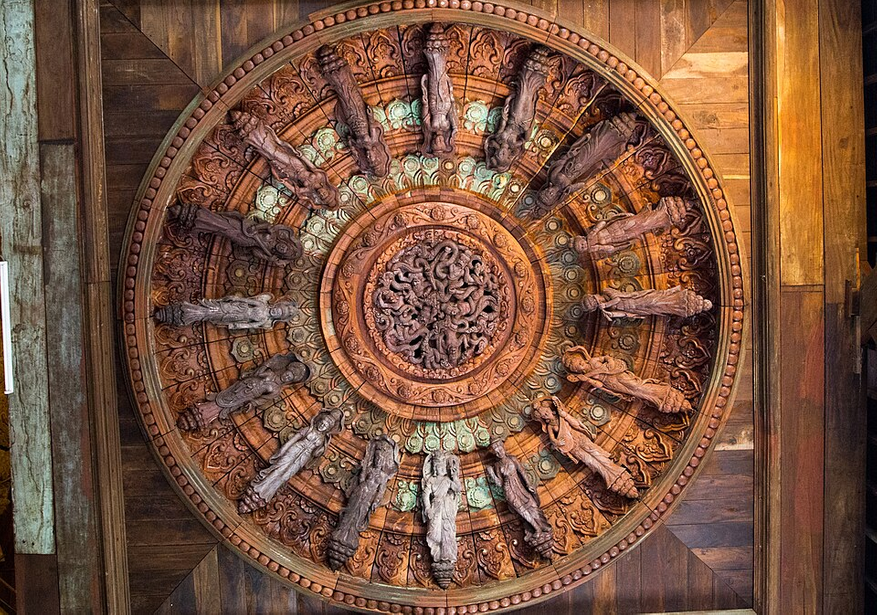 Внутри храм делится на четыре залы. Китайский зал наполнен статуями воплощениями Бодхисатв, в индийском изображены стихии, в тайском — семь аватаров по дням недели, и в камбоджийском — семья с детьми. В каждом зале, учитывая количество деталей, можно пропасть надолго.