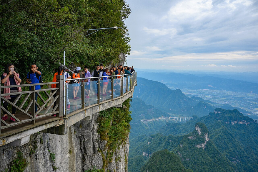 Самая знаменитая и лучшая часть — канатная дорога. Ее протяженность 7455 метров, между прочим, мировой рекорд. Помимо того, что она быстро и комфортно доставит к вершине горы Тяньмэнь, поездка захватит дух. Около пятнадцати минут вы будете находиться в сотнях метров над землей между нависающими отвесными скалами. Практически в состоянии полета. Главное не думать о том, как долго вас будут собирать внизу, если упадете. Но если серьезно, система безопасности там на уровне, так что остается наслаждаться видом.