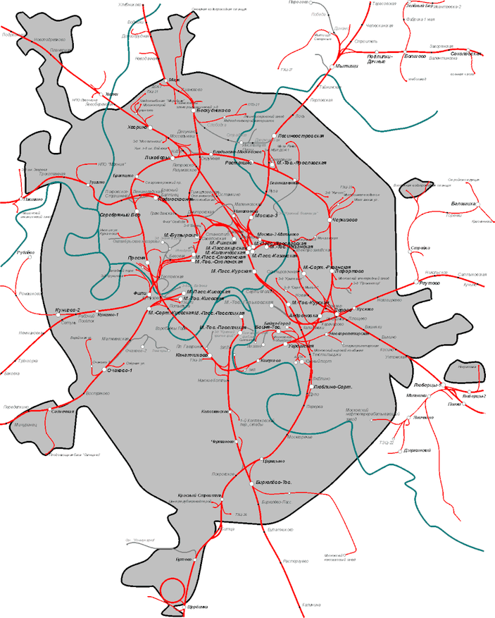 Впрочем, угольная энергетика — в основном дела давно минувших дней, а вот составы с углем можно увидеть в городе даже и сейчас — ветка к коксогазовому заводу начинается со станции Бирюлево-Товарная. Аналогичных чисто грузовых линий в городе до сих пор порядком, хотя и не сравнить со временами расцвета местного промышленного производства. На схеме 2007 года многие подъездные пути уже обозначены серым цветом, поскольку к тому моменту были ликвидированы — но и красных было ещё порядком. Особенно в бывшем «ржавом поясе» Москвы — окрестностях Малого кольца Московской железной дороги. Напомню, что чуть более ста лет назад оно было границей города, так что прилегающие участки активно застраивались как раз заводами и фабриками. Позднее при расширении города выносить производство за новые границы не стали — проще было вокруг построить кольцо спальников, а рабочие места для их обитателей так и остались там же, где были. И недалеко от дома, что считалось одним из плюсов такой схемы.