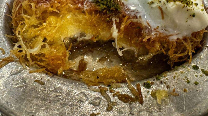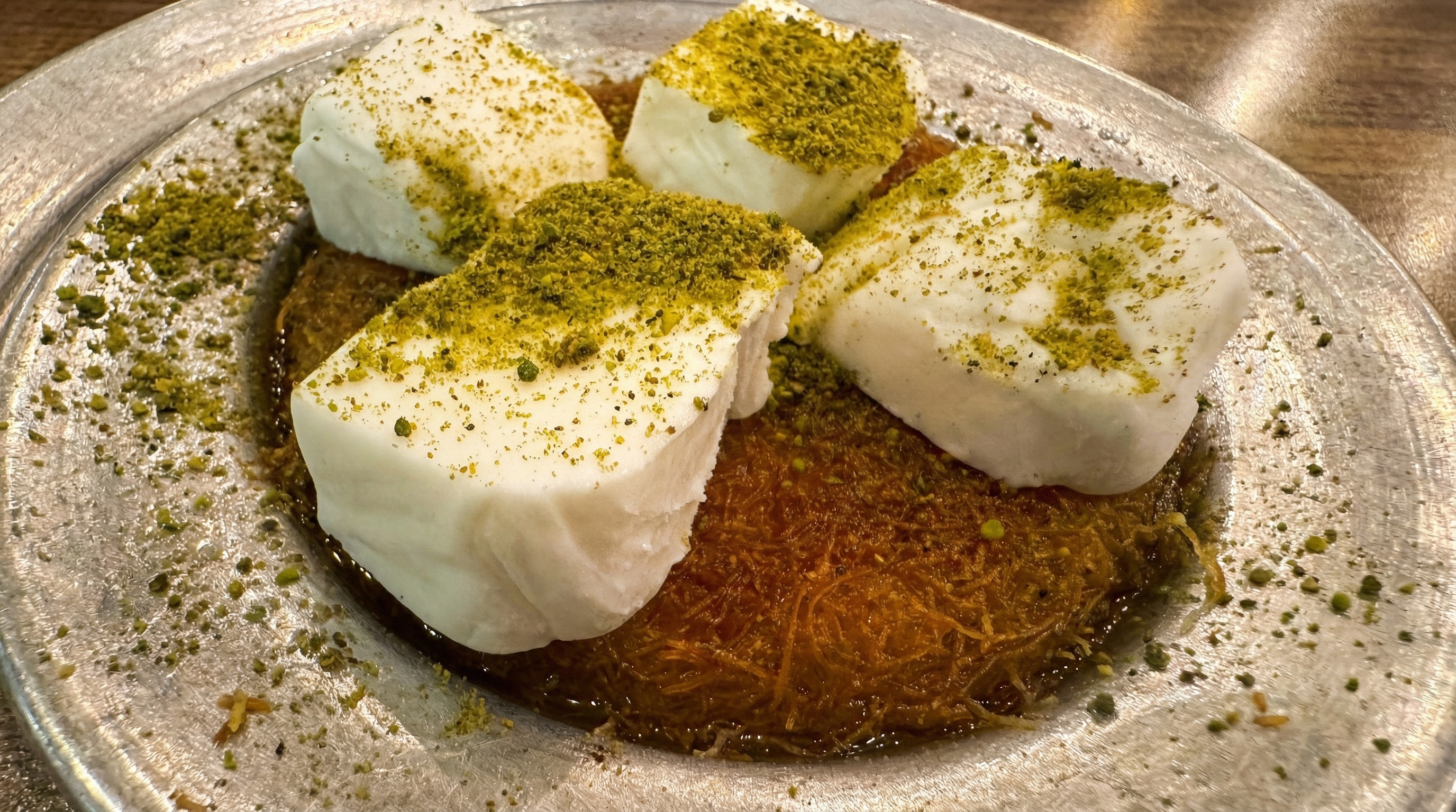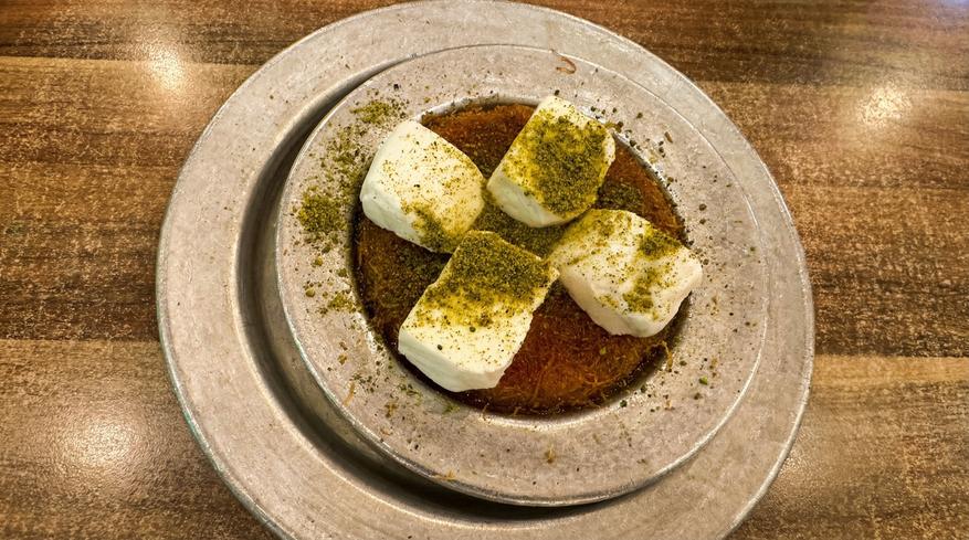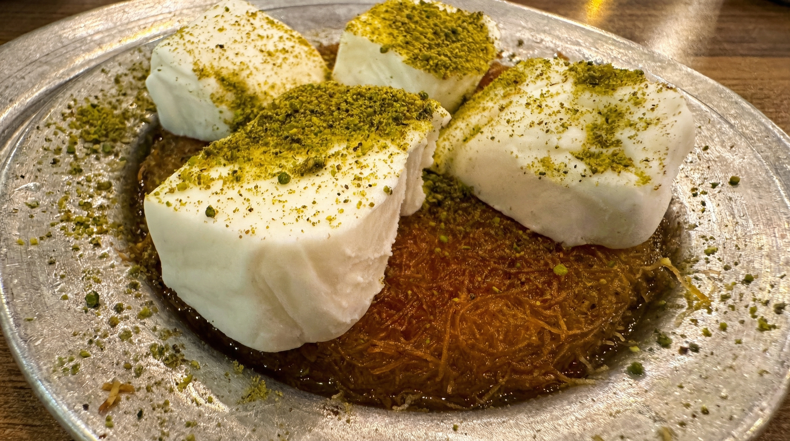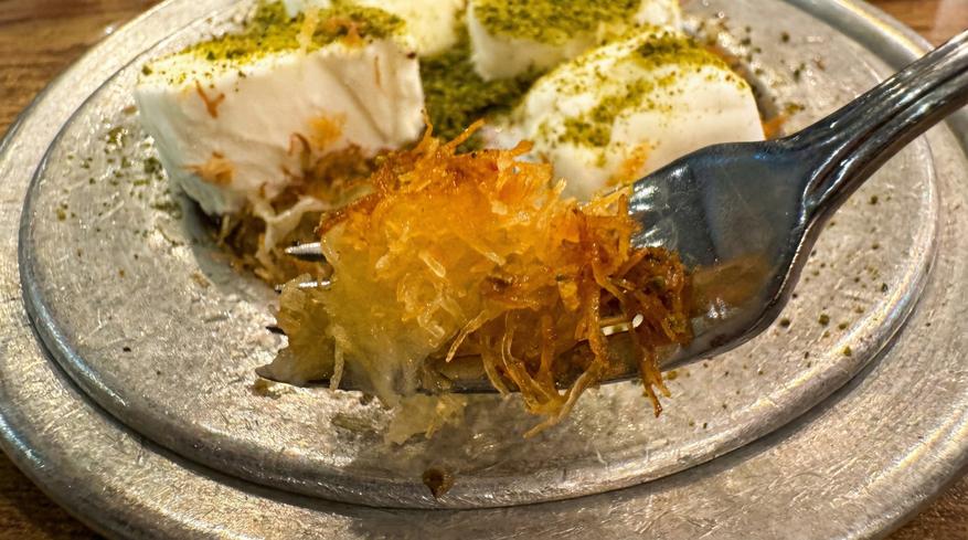 Сначала чувствуется хруст поджаренного кадаифа. Потом приходит горячий сироп. Затем тёплый тянущийся сыр с лёгкой солоноватостью. И в конце, холодный каймак или морожено, который тает и делает вкус более округлым.