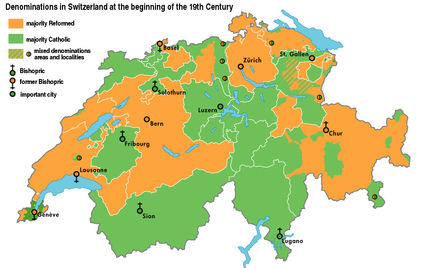 До 1848 года отдельные кантоны следили за внутренней и внешней политикой государства, а также решали налоговые и социальные проблемы. Однако 1847 год ознаменовался для Швейцарии как год начала гражданской войны, закончившейся поражением Зондербунда — союза кантонов, население которых было представлено католиками. Годом позже в стране приняли новую конституцию, и фактически было создано современное государство с единой валютой, национальным гражданством и централизованным правительством. Начался процесс лишения кантонов власти, однако своё влияние они не утратили. Швейцарию не перестали называть конфедерацией, поэтому Confoederatio и осталось в латинском названии страны.