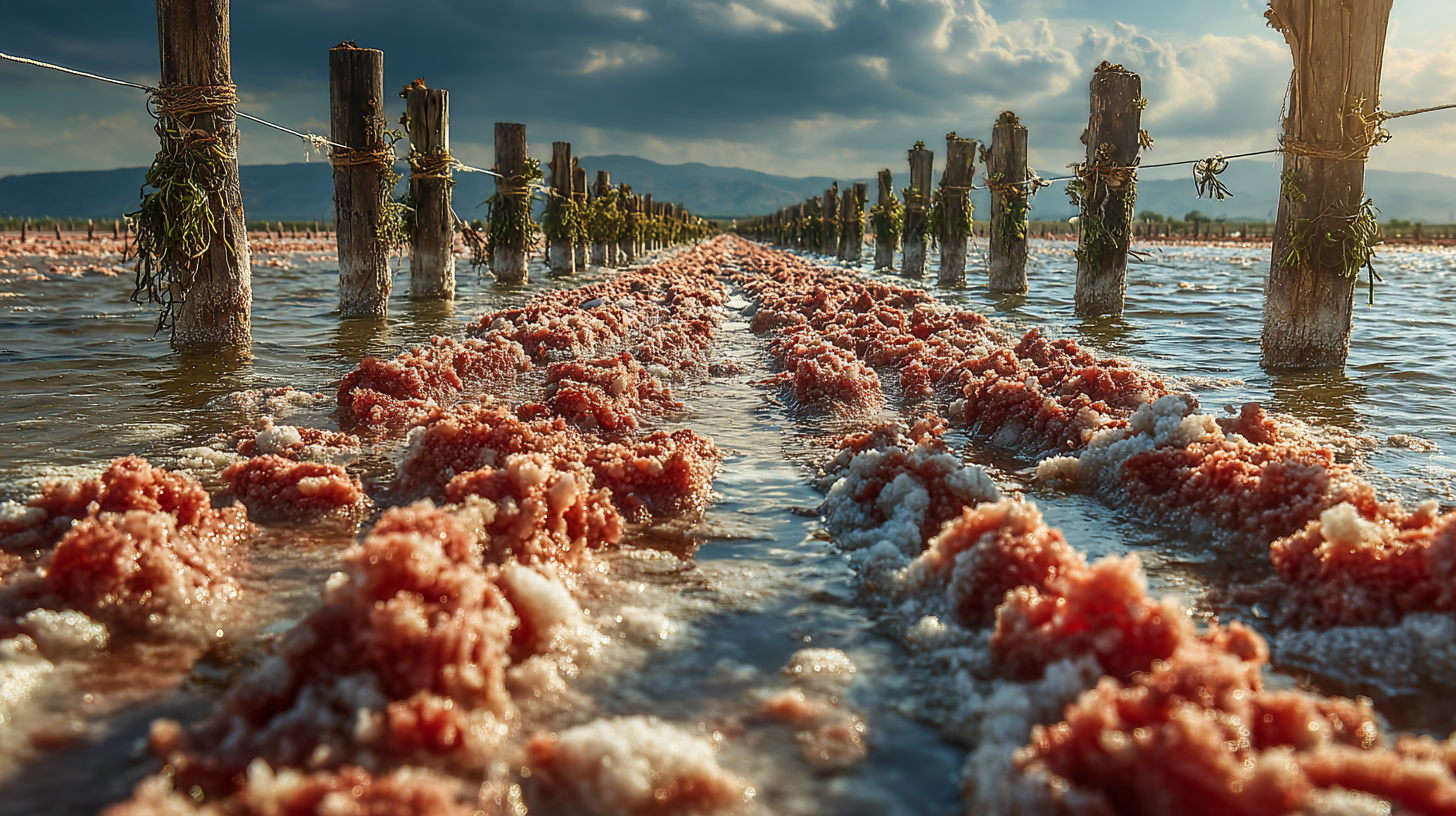 Сасык-Сиваш в Крыму известен ярко-розовой водой благодаря водорослям Dunaliella salina и археям, выделяющим каротиноиды. В сухой сезон вода испаряется, оголяя ровные линии старых конструкций. Фотографии этих рядов часто расходятся по интернету как загадочные пейзажи.