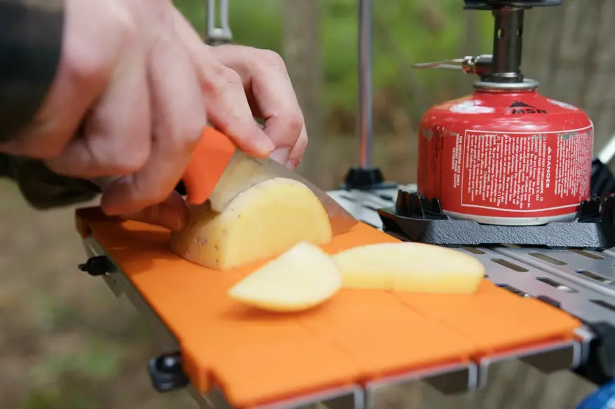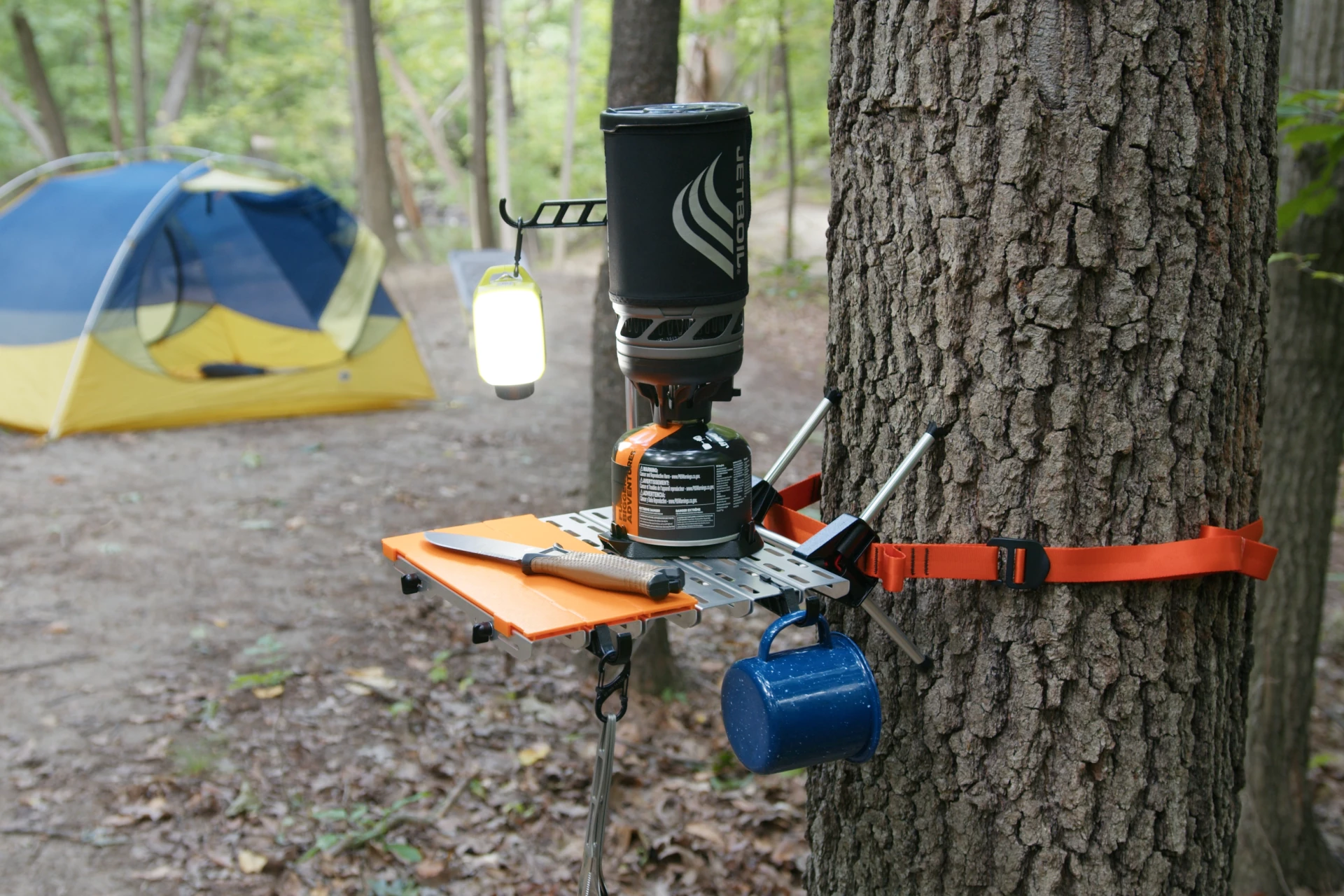 Производитель предусмотрел систему пазов для установки дополнительных компонентов. В комплект входят боковые крючки для подвешивания снаряжения, верхний держатель для осветительных приборов, крепление для газового баллона с изобутаном, разделочные доски и защитный экран от ветра для приготовления пищи. Если поблизости нет деревьев, стол можно использовать как низкую напольную платформу на собственных опорах.