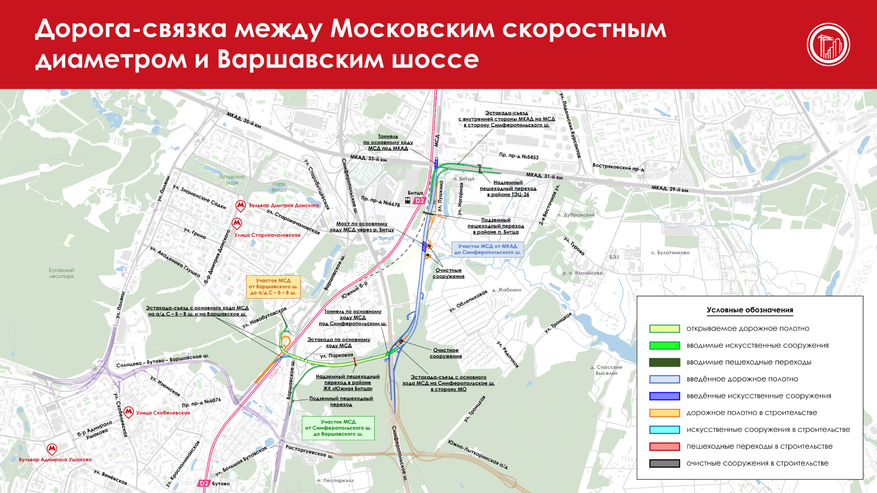Части же за МКАД со времени, когда нарисована была вторая схема в заметке, уже практически успели достроиться. В сентябре заработала связка с Симферопольским шоссе (М-2 «Крым»), в конце декабря — выход на Варшавское шоссе и местную дорожную сеть в Бутове. Единственное, что осталось закончить в этом году — связку с магистралью «Солнцево — Бутово — Варшавское шоссе» (СБВш). Но с этим большой спешки нет — основные работы идут как раз по выводу СБВш в эти места, поскольку сейчас она кончается в Коммунарке. В общем, если не считать дополнительного участка и некоторых локальных недоделок, МСД уже готов. А его северная часть (СВХ) вообще работает ещё с конца 2022 года.
