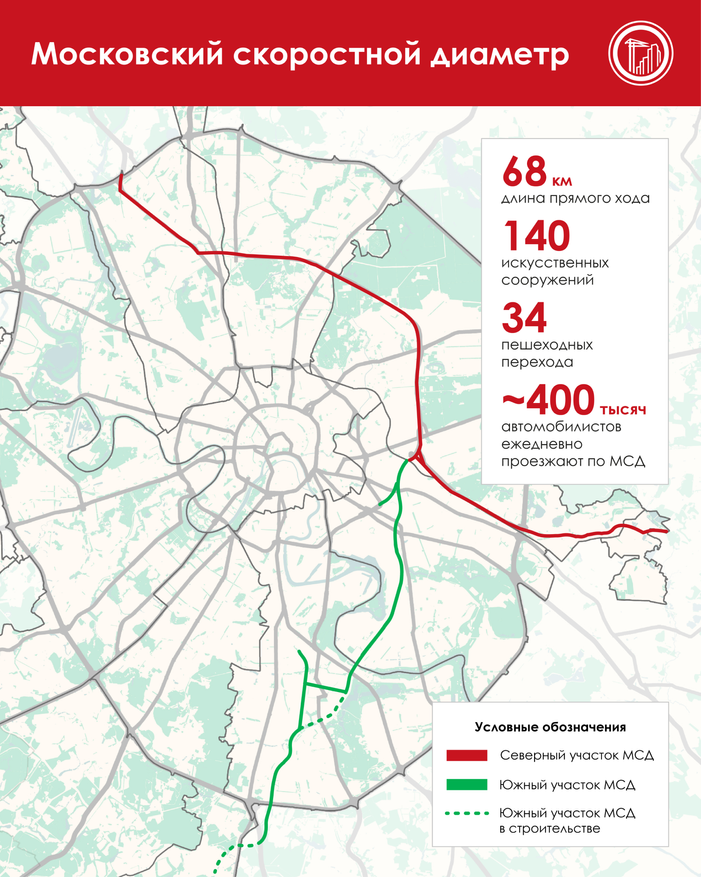Поэтому три года назад решено было их объединить в единую виртуальную сущность. Понятно, что диаметром в математическом смысле это крякозябра не является, но это слово нынешние городские власти очень любят. И ладно — хоть горшком называйте, только в печь не ставьте. В смысле дороги нам тут нужны, а уж как они будут называться — дело десятое. Да и вообще на тот момент был готов только северный участок МСД — то есть бывшая СВХ, фактически соединяющая две платных скоростных трассы — М-11 «Нева» и М-12 «Восток». Сейчас соединяющая — на тот момент М-12 ещё находилась в начальной стадии строительства. Равно как и южный участок МСД (бывшая ЮВХ), обеспечивающий выход на тоже скоростные М-2 «Крым» и М-4 «Дон» южного направления.
