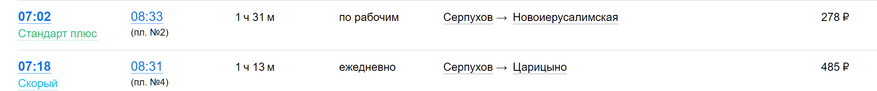 А ещё иногда можно и доплатить — например, из Серпухова можно уехать обычной электричкой на 7.02, а можно экспрессом в 7.18. Сейчас многие предпочитают первое — прибытие на «Царицыно» в 8.33 и 8.31 соответственно, а цена различается на 200 рублей — 278 против 485. Но если нужно будет разок съездить в обсуждаемый период, возможно стоит и доплатить, повторюсь — так оно проще. Хотя решать тут придётся самостоятельно. И не забывать, что абонементы на обычные электрички в скорых не действуют от слова совсем — кассирам-контроллерам придётся выложить полную стоимость проезда, да ещё и 200 рублей за оформление накинуть. Хотя кто-то просто вспомнит бурную молодость в святые 90-е и от них немного побегает — тут уж только своей головой думать и выбирать :) Но сбрасывать со счетов этот способ тоже не стоит. А пару специальных экспрессов из Подольска — тем более: они по обычным тарифам гоняют. Как и упомянутая чеховская, и некоторые другие с конечной на «Царицыно». Жаль только, маловато их. В обычное время — совсем не жаль, поскольку от платформы №4 до метро пока идти неудобно, да и дальше не уедешь, но в такие периоды происходит переоценка ценностей.
