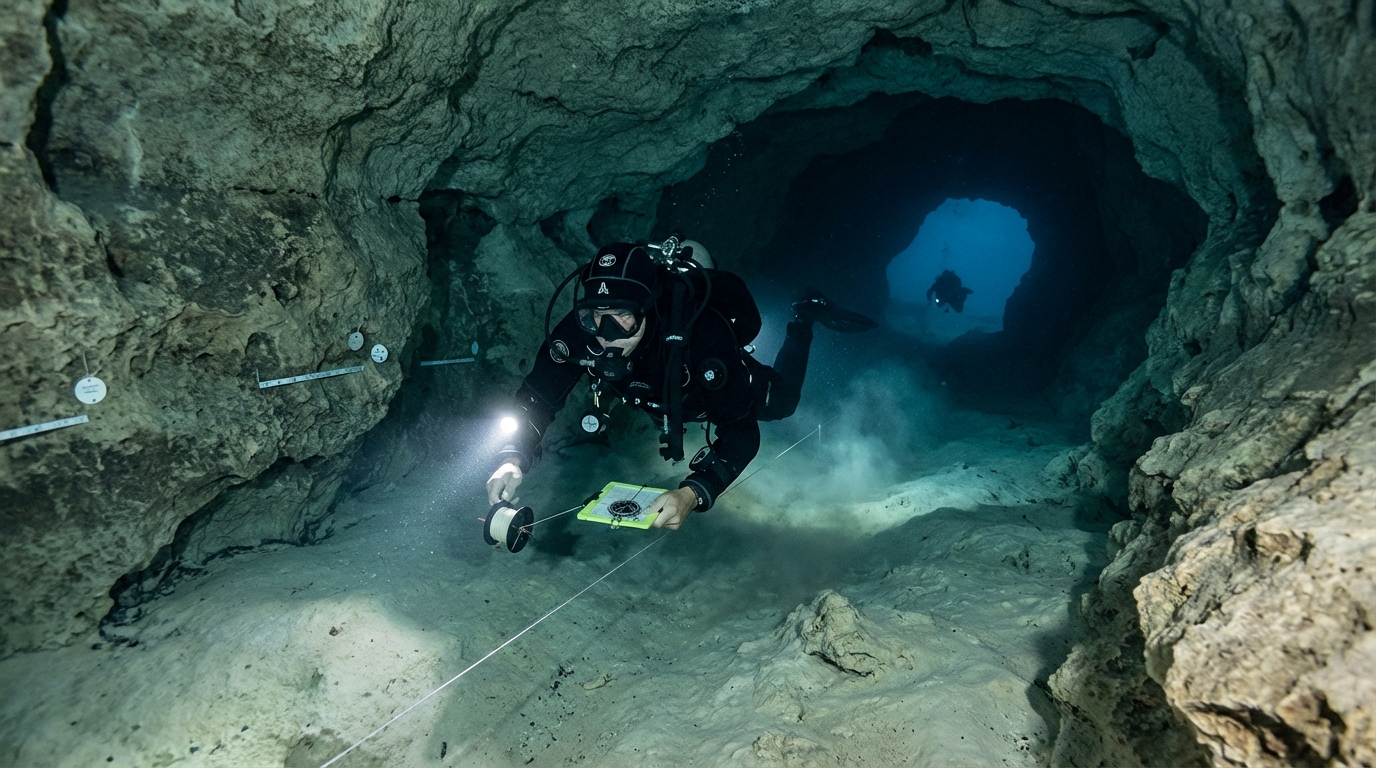 Для спелеодайверов сенот — это не достопримечательность, а входной узел. Точка подключения к подземной системе. За несколькими метрами вертикального спуска начинаются горизонтальные коридоры. Потом развилки. Потом длинные участки, уходящие в темноту. Масштаб быстро перестаёт соответствовать слову «пещера». Скорее это подземная инфраструктура. Натуральная, но по логике напоминающая сеть кабелей или труб.