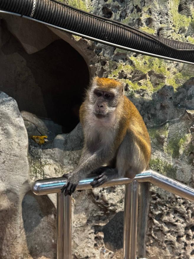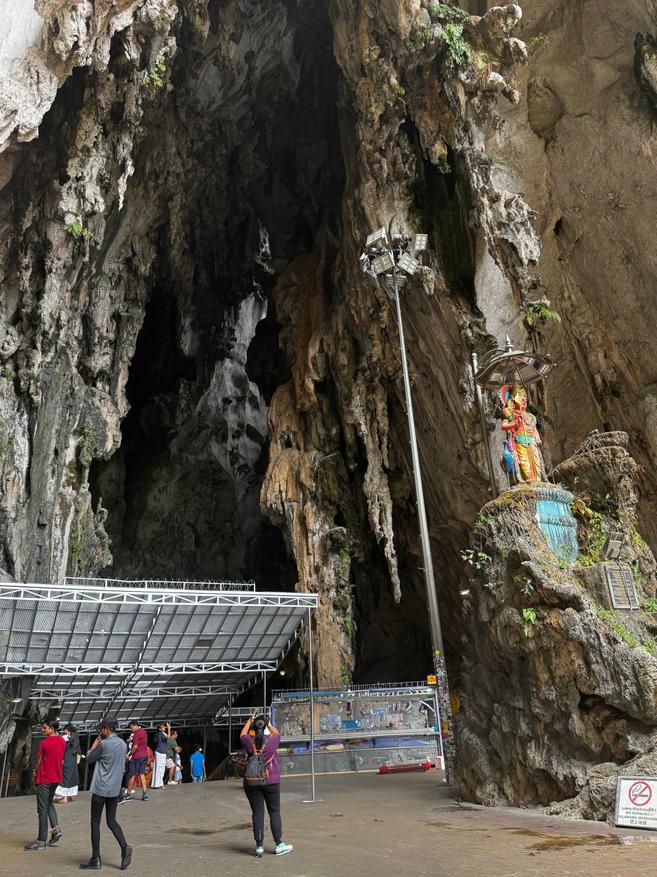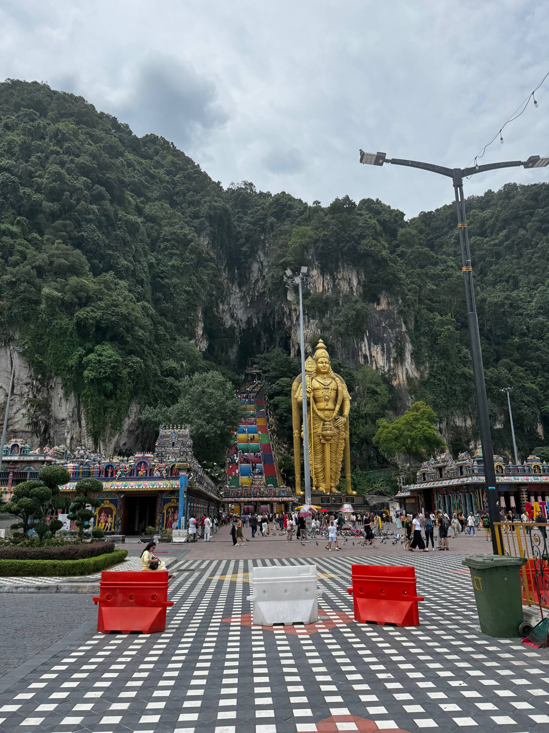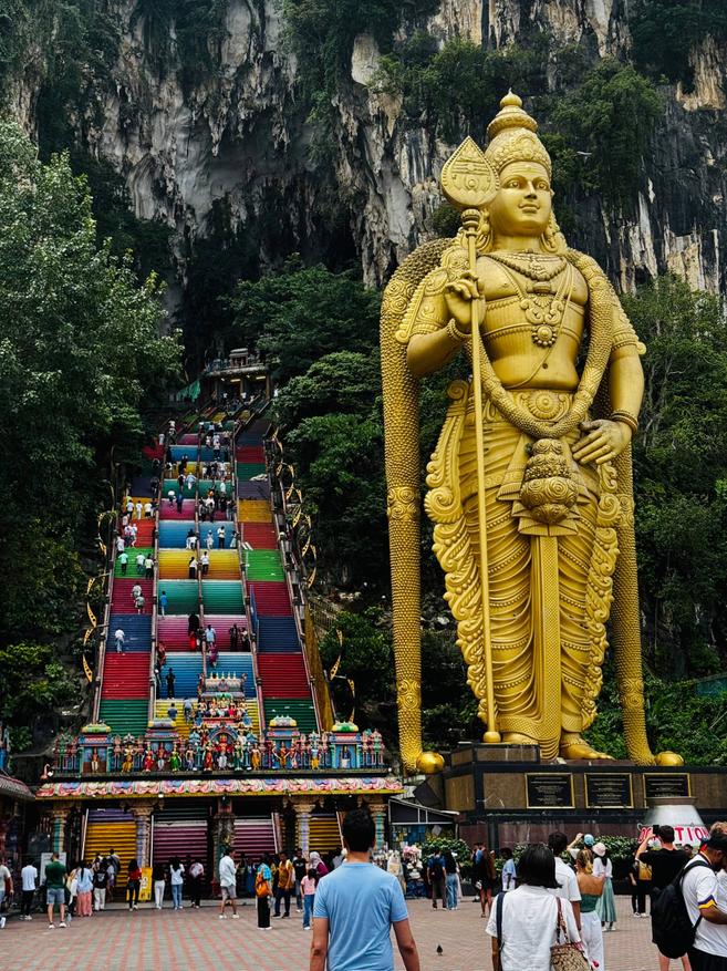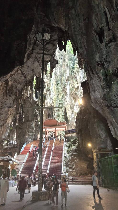 Есть места, которые выглядят как декорации к фильму, но при этом остаются абсолютно реальными. Бату-Кейвс как раз из таких. Огромная известняковая гора, изъеденная пещерами. Внизу город, шум машин, линии метро. Чуть выше: храмы, божества, запах благовоний и длинная лестница, уходящая в темноту и свет одновременно, вглубь камня и в небо. И странное ощущение, ты вроде бы на туристическом объекте, но это не «аттракцион». Это живое место. Люди приходят молиться, кто-то просто проходит мимо, обезьяны воруют еду, слышны мантры, дымятся благовония, монахи в оранжевых одеждах тихо сидят в тени. Всё перемешано: религия, быт, хаос, тропический зной. Ничего специально не вылизано, не приглажено под открытку. Оно просто существует. И, наверное, в этом вся сила Бату-Кейвс.